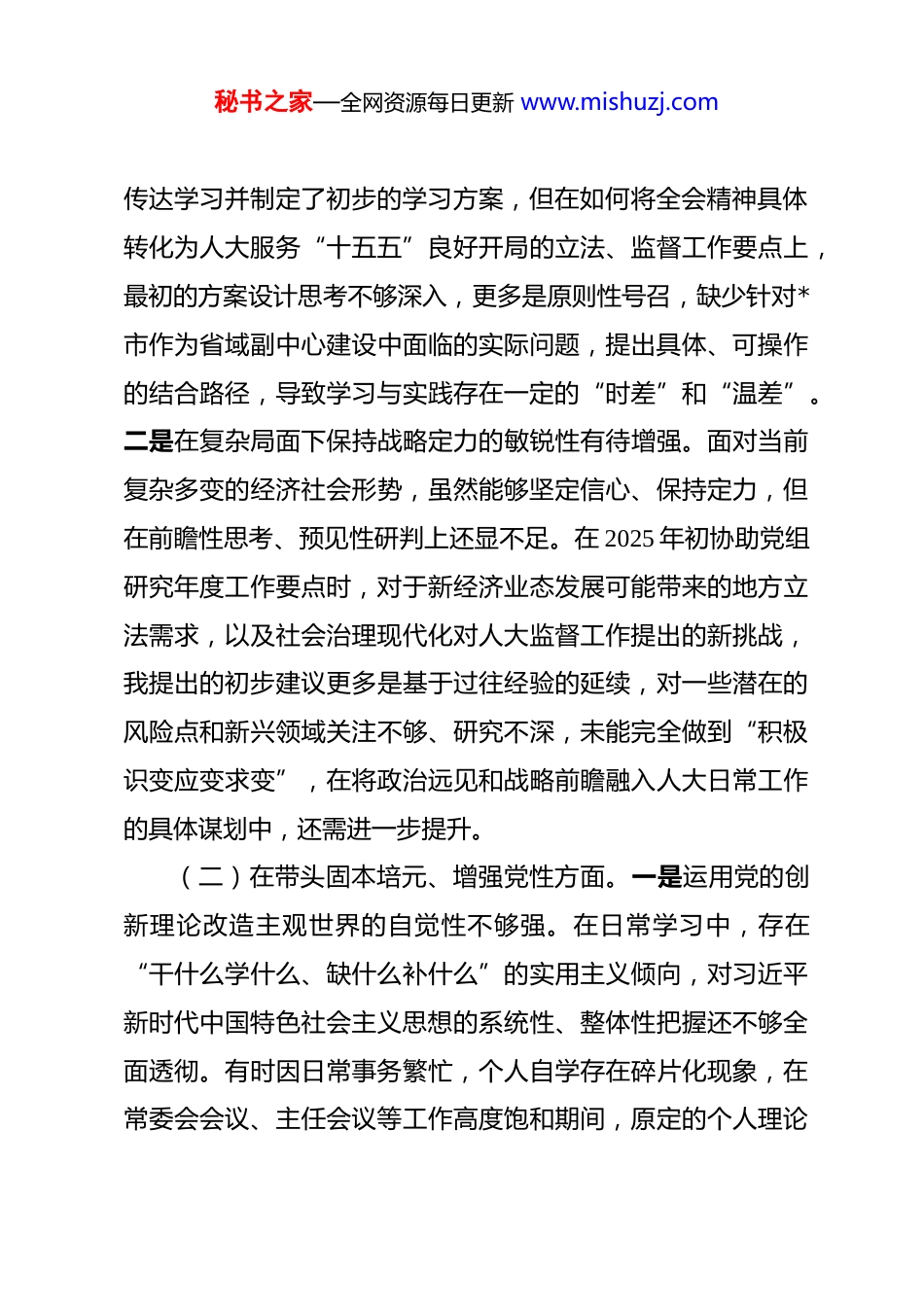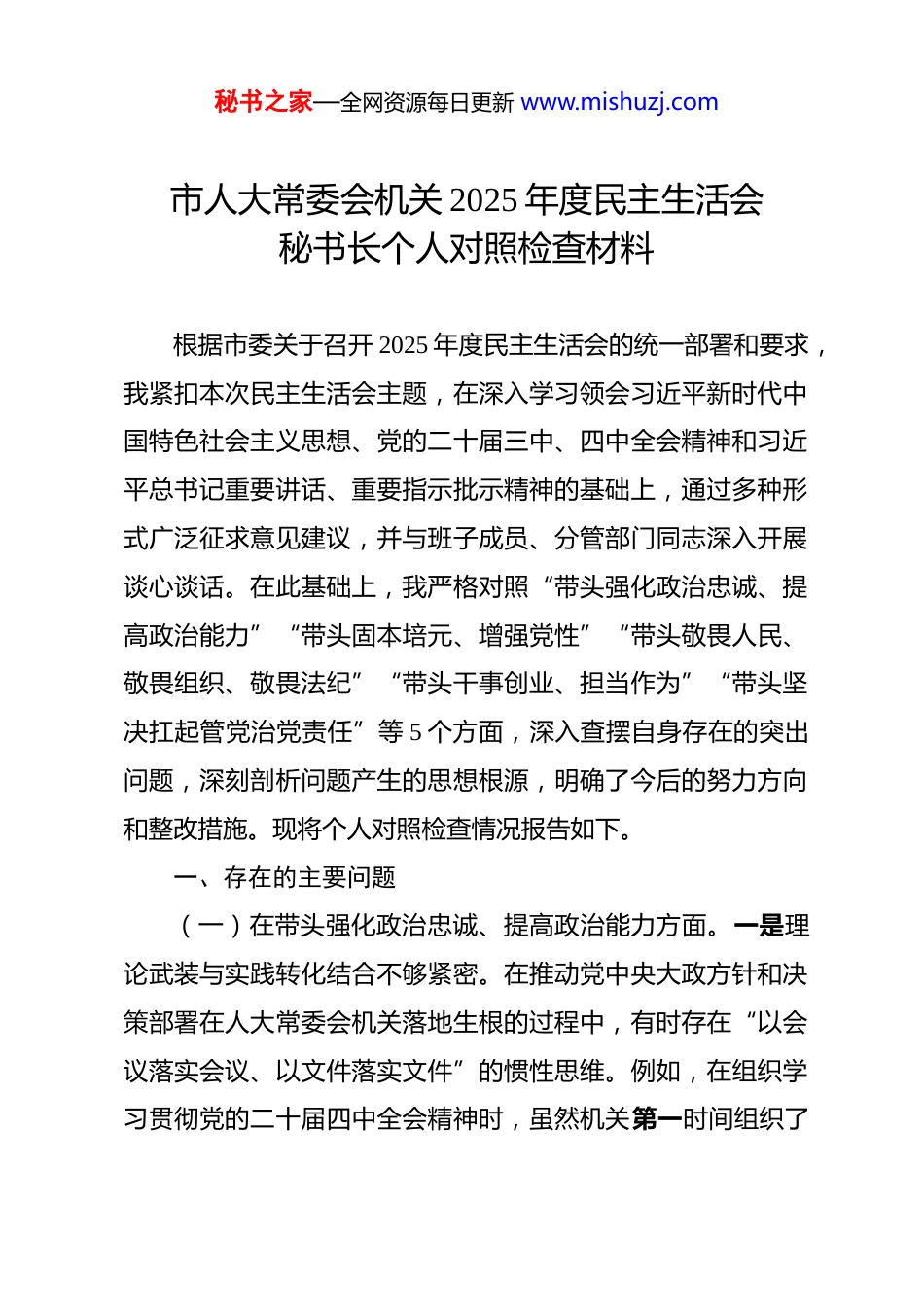 秘书之家—全网资源每日更新 www.mishuzj.com市人大常委会机关 2025 年度民主生活会秘书长个人对照检查材料 根据市委关于召开 2025 年度民主生活会的统一部署和要求,我紧扣本次民主生活会主题,在深入学习领会习近平新时代中国特色社会主义思想、党的二十届三中、四中全会精神和习近平总书记重要讲话、重要指示批示精神的基础上,通过多种形式广泛征求意见建议,并与班子成员、分管部门同志深入开展谈心谈话。在此基础上,我严格对照“带头强化政治忠诚、提高政治能力”“带头固本培元、增强党性”“带头敬畏人民、敬畏组织、敬畏法纪”“带头干事创业、担当作为”“带头坚决扛起管党治党责任”等 5 个方面,深入查摆自身存在的突出问题,深刻剖析问题产生的思想根源,明确了今后的努力方向和整改措施。现将个人对照检查情况报告如下。一、存在的主要问题(一)在带头强化政治忠诚、提高政治能力方面。一是理论武装与实践转化结合不够紧密。在推动党中央大政方针和决策部署在人大常委会机关落地生根的过程中,有时存在“以会议落实会议、以文件落实文件”的惯性思维。例如,在组织学习贯彻党的二十届四中全会精神时,虽然机关第一时间组织了秘书之家—全网资源每日更新 www.mishuzj.com传达学习并制定了初步的学习方案,但在如何将全会精神具体转化为人大服务“十五五”良好开局的立法、监督工作要点上,最初的方案设计思考不够深入,更多是原则性号召,缺少针对*市作为省域副中心建设中面临的实际问题,提出具体、可操作的结合路径,导致学习与实践存在一定的“时差”和“温差”。二是在复杂局面下保持战略定力的敏锐性有待增强。面对当前复杂多变的经济社会形势,虽然能够坚定信心、保持定力,但在前瞻性思考、预见性研判上还显不足。在 2025 年初协助党组研究年度工作要点时,对于新经济业态发展可能带来的地方立法需求,以及社会治理现代化对人大监督工作提出的新挑战,我提出的初步建议更多是基于过往经验的延续,对一些潜在的风险点和新兴领域关注不够、研究不深,未能完全做到“积极识变应变求变”,在将政治远见和战略前瞻融入人大日常工作的具体谋划中,还需进一步提升。(二)在带头固本培元、增强党性方面。一是运用党的创新理论改造主观世界的自觉性不够强。在日常学习中,存在“干什么学什么、缺什么补什么”的实用主义倾向,对习近平新时代中国特色社会主义思想的系统性、整体性把握还不够全面透彻。有时因日常事务繁忙,个人自学存在碎片化现象,在常委会会议、主任会议等工作高度饱和期间,原定的个人理论秘书之家—全网资源每日更新 www.mishuzj.com学习计划会被动推迟或精简,用参加集体学习替代个人深度钻研,导致对一些重要论述的理解停留在“知其然”的层面,离“知其所以然”还有差距,用党的创新理论持续“补钙壮骨”、解决世界观、人生观、价值观“总开关”问题的韧劲和恒心有所减弱。二是党性锤炼融入日常工作生活的标准不够高。虽然能够坚守共产党人的精神追求,但在将党性原则内化为行为习惯、外化为工作标准上还存在不足。例如,在机关内部管理中,有时对一些同志出现的“差不多就行”的懈怠思想,更多是口头提醒和工作要求,缺少从党性高度进行深入的批评教育,没有真正做到“红脸出汗、排毒治病”。在处理一些程序性、事务性工作时,偶尔会不自觉地把工作标准等同于“完成任务”,而忽视了每一项工作背后都蕴含着对党忠诚、为民服务的党性要求。三是传承红色基因、赓续革命传统的力度不够大。*市是*会议的召开地,拥有宝贵的红色资源。作为在*工作的党员领导干部,虽然经常参加各类红色教育活动,但在如何将*会议精神更深层次地融入人大常委会机关的文化建设和干部队伍建设中,思考和行动还不够系统。例如,在筹划机关青年干部理论学习小组活动时,虽然也安排了红色基地的现场教学,但在后续的研讨和成果转化上,未能有效引导青年干部从革命传统中深刻汲取自我革命、敢于斗争的智慧和力量,红色教育的实效秘书之家—全网资源每日更新 www.mishuzj.com性有待进一步提升。(三)在带头敬畏人民、敬畏组织、敬畏法纪方面。一是践行新时代...
