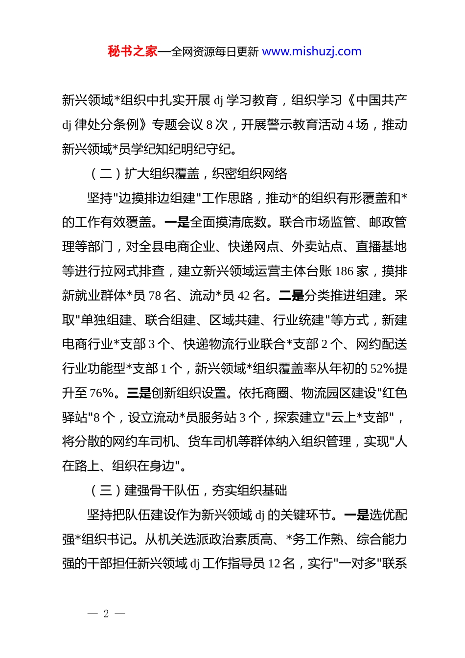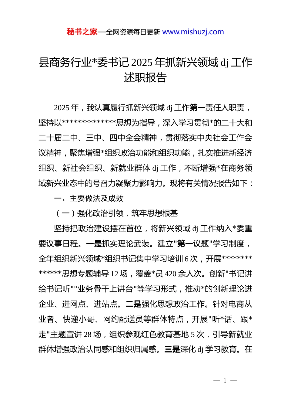 秘书之家—全网资源每日更新 www.mishuzj.com县商务行业*委书记 2025 年抓新兴领域 dj 工作述职报告2025 年,我认真履行抓新兴领域 dj 工作第一责任人职责,坚持以**************思想为指导,深入学习贯彻*的二十大和二十届二中、三中、四中全会精神,贯彻落实中央社会工作会议精神,聚焦增强*组织政治功能和组织功能,扎实推进新经济组织、新社会组织、新就业群体 dj 工作,不断增强*在商务领域新兴业态中的号召力凝聚力影响力。现将有关情况报告如下:一、主要做法及成效(一)强化政治引领,筑牢思想根基坚持把政治建设摆在首位,将新兴领域 dj 工作纳入*委重要议事日程。一是抓实理论武装。建立"第一议题"学习制度,全年组织新兴领域*组织书记集中学习培训 6 次,开展**************思想专题辅导 12 场,覆盖*员 420 余人次。创新"书记讲给书记听""业务骨干上讲台"等学习形式,推动*的创新理论进企业、进网点、进站点。二是强化思想政治工作。针对电商从业者、快递小哥、网约配送员等群体特点,开展"听*话、跟*走"主题宣讲 28 场,组织参观红色教育基地 5 次,引导新就业群体增强政治认同感和组织归属感。三是深化 dj 学习教育。在— 1 —秘书之家—全网资源每日更新 www.mishuzj.com新兴领域*组织中扎实开展 dj 学习教育,组织学习《中国共产dj 律处分条例》专题会议 8 次,开展警示教育活动 4 场,推动新兴领域*员学纪知纪明纪守纪。(二)扩大组织覆盖,织密组织网络坚持"边摸排边组建"工作思路,推动*的组织有形覆盖和*的工作有效覆盖。一是全面摸清底数。联合市场监管、邮政管理等部门,对全县电商企业、快递网点、外卖站点、直播基地等进行拉网式排查,建立新兴领域运营主体台账 186 家,摸排新就业群体*员 78 名、流动*员 42 名。二是分类推进组建。采取"单独组建、联合组建、区域共建、行业统建"等方式,新建电商行业*支部 3 个、快递物流行业联合*支部 2 个、网约配送行业功能型*支部 1 个,新兴领域*组织覆盖率从年初的 52%提升至 76%。三是创新组织设置。依托商圈、物流园区建设"红色驿站"8 个,设立流动*员服务站 3 个,探索建立"云上*支部",将分散的网约车司机、货车司机等群体纳入组织管理,实现"人在路上、组织在身边"。(三)建强骨干队伍,夯实组织基础坚持把队伍建设作为新兴领域 dj 的关键环节。一是选优配强*组织书记。从机关选派政治素质高、*务工作熟、综合能力强的干部担任新兴领域 dj 工作指导员 12 名,实行"一对多"联系— 2 —秘书之家—全网资源每日更新 www.mishuzj.com指导制度,做到全覆盖、常态化。二是加大*员发展力度。将发展*员计划向新兴领域倾斜,重点从电商直播骨干、快递站点负责人、外卖配送队长等优秀群体中培养发展对象,全年发展新兴领域*员 6 名,培养入*积极分子 18 名。三是强化教育培训。举办新兴领域*组织书记示范培训班 2 期、*务工作者骨干培训班 3 期,培训 120 余人次,不断提升*务工作能力和水平。(四)突出服务赋能,增强组织功能坚持以服务凝聚人心、以服务增强功能。一是搭建服务平台。建设新就业群体*群服务中心 1 个、商圈*群服务站 4 个,配备休息座椅、饮水设备、充电设施、急救药箱等,为快递小哥、外卖骑手提供"冷可取暖、热可纳凉、渴可喝水、累可歇脚"的暖心服务。二是开展暖心行动。实施"心联新·在一起"关爱项目,为新就业群体提供免费体检、意外保险、法律援助等服务,全年惠及 1200 余人次。开展"夏送清凉、冬送温暖"活动,发放慰问物资价值 8 万余元。三是畅通诉求渠道。建立新就业群体权益维护联合调解机制,协调解决劳动报酬、工作条件、职业发展等方面问题 32 件,切实维护新就业群体合法权益。(五)引导融入治理,发挥先锋作用坚持 dj 引领与基层治理深度融合。一是推动参与社区治理。引导快递员、外卖骑手等担任社区"流动网格员",组建"红色骑— 3 —秘书之家—全网资源每日更新 www.mishuzj.com手志愿服务队"3 支,开展文明创建、隐患排查、政策宣传等志愿服务活动 56 次。二是发挥先锋模范作用。在...