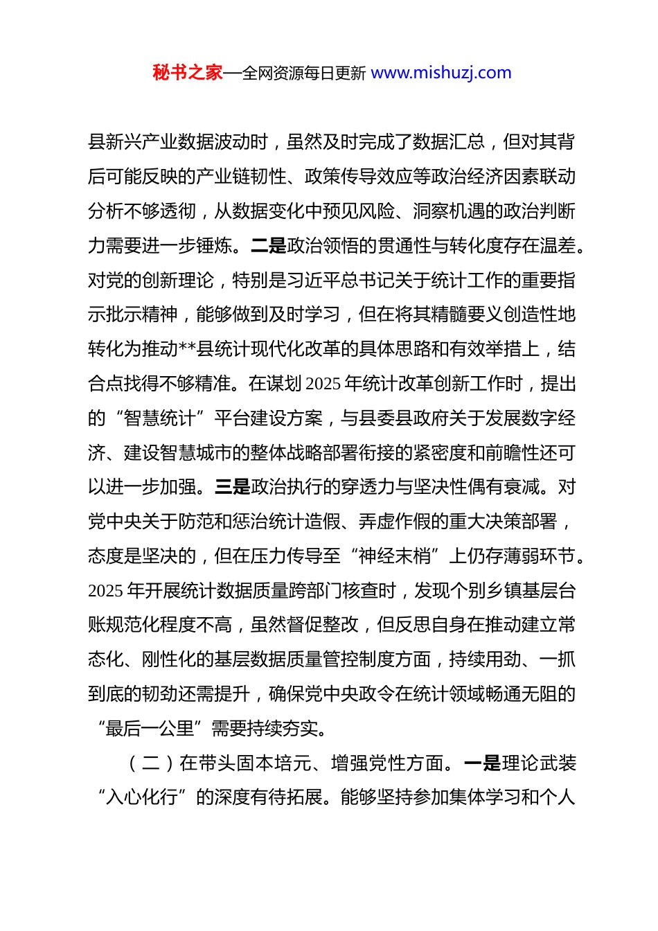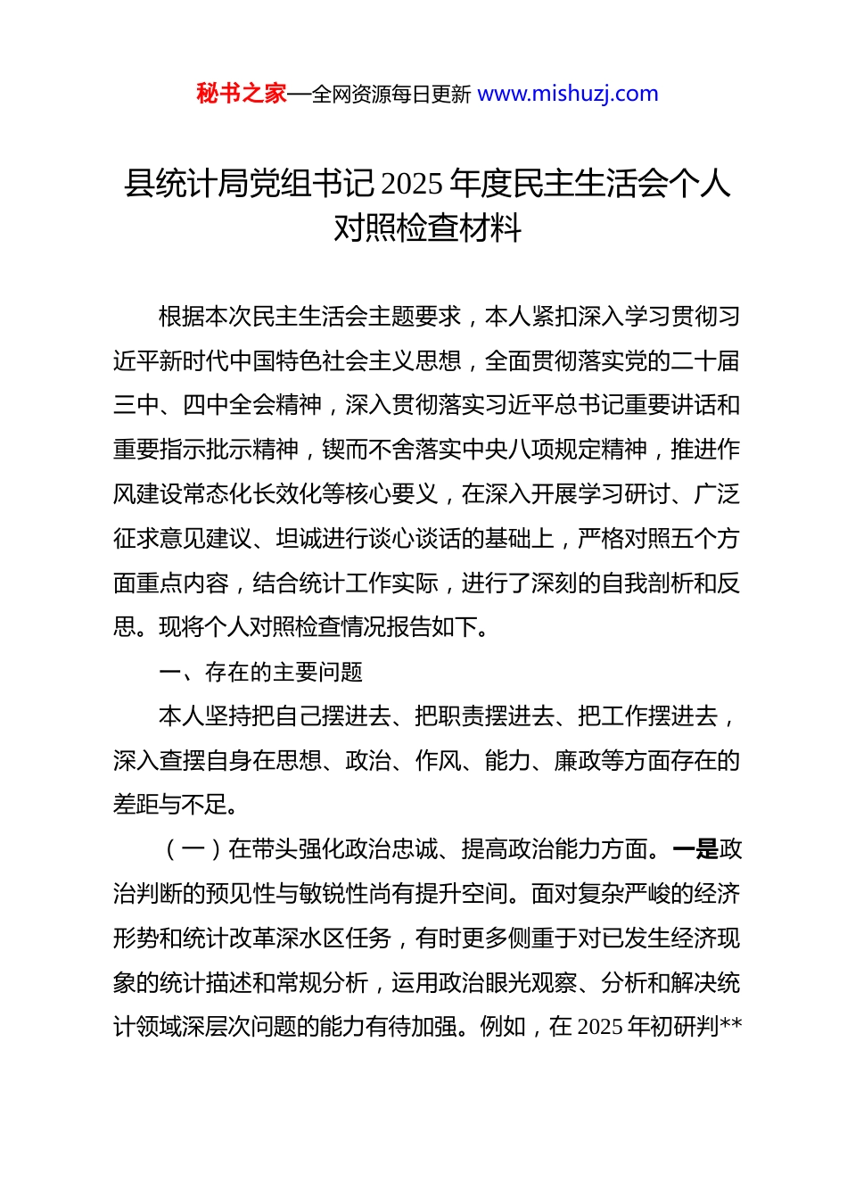 秘书之家—全网资源每日更新 www.mishuzj.com县统计局党组书记 2025 年度民主生活会个人对照检查材料 根据本次民主生活会主题要求,本人紧扣深入学习贯彻习近平新时代中国特色社会主义思想,全面贯彻落实党的二十届三中、四中全会精神,深入贯彻落实习近平总书记重要讲话和重要指示批示精神,锲而不舍落实中央八项规定精神,推进作风建设常态化长效化等核心要义,在深入开展学习研讨、广泛征求意见建议、坦诚进行谈心谈话的基础上,严格对照五个方面重点内容,结合统计工作实际,进行了深刻的自我剖析和反思。现将个人对照检查情况报告如下。一、存在的主要问题本人坚持把自己摆进去、把职责摆进去、把工作摆进去,深入查摆自身在思想、政治、作风、能力、廉政等方面存在的差距与不足。(一)在带头强化政治忠诚、提高政治能力方面。一是政治判断的预见性与敏锐性尚有提升空间。面对复杂严峻的经济形势和统计改革深水区任务,有时更多侧重于对已发生经济现象的统计描述和常规分析,运用政治眼光观察、分析和解决统计领域深层次问题的能力有待加强。例如,在 2025 年初研判**秘书之家—全网资源每日更新 www.mishuzj.com县新兴产业数据波动时,虽然及时完成了数据汇总,但对其背后可能反映的产业链韧性、政策传导效应等政治经济因素联动分析不够透彻,从数据变化中预见风险、洞察机遇的政治判断力需要进一步锤炼。二是政治领悟的贯通性与转化度存在温差。对党的创新理论,特别是习近平总书记关于统计工作的重要指示批示精神,能够做到及时学习,但在将其精髓要义创造性地转化为推动**县统计现代化改革的具体思路和有效举措上,结合点找得不够精准。在谋划 2025 年统计改革创新工作时,提出的“智慧统计”平台建设方案,与县委县政府关于发展数字经济、建设智慧城市的整体战略部署衔接的紧密度和前瞻性还可以进一步加强。三是政治执行的穿透力与坚决性偶有衰减。对党中央关于防范和惩治统计造假、弄虚作假的重大决策部署,态度是坚决的,但在压力传导至“神经末梢”上仍存薄弱环节。2025 年开展统计数据质量跨部门核查时,发现个别乡镇基层台账规范化程度不高,虽然督促整改,但反思自身在推动建立常态化、刚性化的基层数据质量管控制度方面,持续用劲、一抓到底的韧劲还需提升,确保党中央政令在统计领域畅通无阻的“最后一公里”需要持续夯实。(二)在带头固本培元、增强党性方面。一是理论武装“入心化行”的深度有待拓展。能够坚持参加集体学习和个人秘书之家—全网资源每日更新 www.mishuzj.com自学,但在系统性、穿透性理解习近平新时代中国特色社会主义思想,并用以改造主观世界、筑牢信仰之基上,距离“学思用贯通、知信行统一”的高标准还有差距。例如,在组织全局开展党的二十届四中全会精神专题学习时,虽然安排了讲座和研讨,但如何将全会关于“完善推动高质量发展统计体系”的要求,与破解**县当前统计调查制度方法中的难点问题更紧密地结合,引导党员干部深入思考、提出破题之策方面,学习载体的创新性和实效性可以进一步增强。二是党性锤炼“日用不觉”的自觉尚需强化。对照党章党规党纪进行自我检视的主动性、经常性不足,有时将遵守工作纪律等同于严守党性的全部要求。在繁忙的业务工作中,静下心来以革命先辈和先进典型为镜,涤荡思想、反思言行的“内功”修炼不够持续。2025 年第三季度,因全力推进一项上级部署的专项统计调查,将原定的支部组织生活会主题党课推迟,反映出在统筹业务与党性锻炼、确保党内政治生活严肃规范上,有时存在“事务主义”倾向。三是理想信念“落地生根”的实践结合不够紧密。深知统计工作是党和国家事业的重要组成部分,但有时在具体工作中,将这份崇高感转化为服务高质量发展的日常激情和持久动力存在波动。面对统计范围拓展、调查对象配合度下降等新挑战时,偶尔会产生畏难情绪或求稳心态,那种为党分忧、为国统计、秘书之家—全网资源每日更新 www.mishuzj.com为民调查的初心使命感和奋斗精神,需要时刻激发并融入每一次数据审核、每一篇分析报告之中。(三)在带头敬畏人民、敬畏组织、敬畏法纪方面。一是践行“四下...