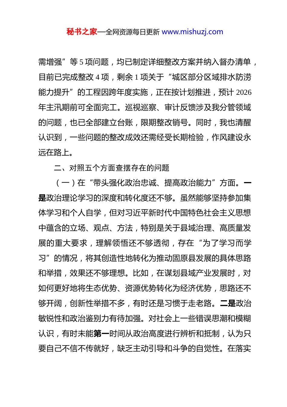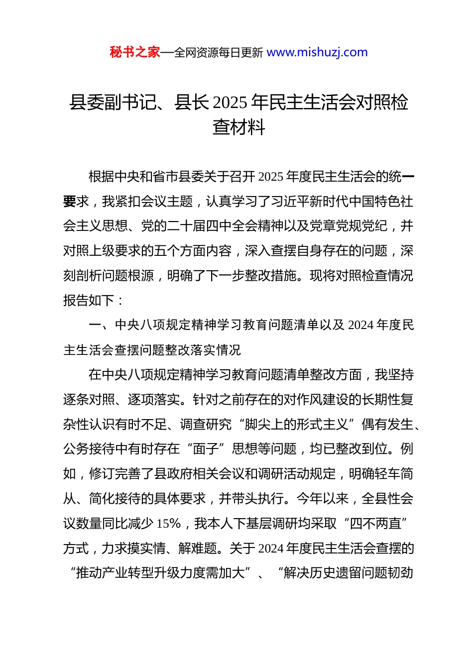 秘书之家—全网资源每日更新 www.mishuzj.com县委副书记、县长 2025 年民主生活会对照检查材料 根据中央和省市县委关于召开 2025 年度民主生活会的统一要求,我紧扣会议主题,认真学习了习近平新时代中国特色社会主义思想、党的二十届四中全会精神以及党章党规党纪,并对照上级要求的五个方面内容,深入查摆自身存在的问题,深刻剖析问题根源,明确了下一步整改措施。现将对照检查情况报告如下:一、中央八项规定精神学习教育问题清单以及 2024 年度民主生活会查摆问题整改落实情况在中央八项规定精神学习教育问题清单整改方面,我坚持逐条对照、逐项落实。针对之前存在的对作风建设的长期性复杂性认识有时不足、调查研究“脚尖上的形式主义”偶有发生、公务接待中有时存在“面子”思想等问题,均已整改到位。例如,修订完善了县政府相关会议和调研活动规定,明确轻车简从、简化接待的具体要求,并带头执行。今年以来,全县性会议数量同比减少 15%,我本人下基层调研均采取“四不两直”方式,力求摸实情、解难题。关于 2024 年度民主生活会查摆的“推动产业转型升级力度需加大”、“解决历史遗留问题韧劲秘书之家—全网资源每日更新 www.mishuzj.com需增强”等 5 项问题,均已制定详细整改方案并纳入督办清单,目前已完成整改 4 项,剩余 1 项关于“城区部分区域排水防涝能力提升”的工程因跨年度实施,正在按计划推进,预计 2026年主汛期前可全面完工。巡视巡察、审计反馈涉及我分管领域的问题,也已全部建立台账,限期整改销号。同时,我也清醒认识到,一些问题的整改成效还需经受长期检验,作风建设永远在路上。二、对照五个方面查摆存在的问题(一)在“带头强化政治忠诚、提高政治能力”方面。一是政治理论学习的深度和转化度还不够。虽然能够坚持参加集体学习和个人自学,但对习近平新时代中国特色社会主义思想中蕴含的立场、观点、方法,特别是关于县域治理、高质量发展的重大要求,理解领悟还不够透彻,存在“为了学习而学习”的情况,将其创造性地转化为推动固原县发展的具体思路和举措,效果还不够理想。比如,在谋划县域产业发展时,对如何更好地将生态优势、资源优势转化为经济优势,思路还不够开阔,创新性举措不多,有时还是习惯于走老路。二是政治敏锐性和政治鉴别力有待加强。对社会上一些错误思潮和模糊认识,有时未能第一时间从政治高度进行辨析和抵制,认为只要自己不信不传就好,缺乏主动引导和斗争的自觉性。在落实秘书之家—全网资源每日更新 www.mishuzj.com党中央决策部署和省市县委工作要求时,有时更多地考虑本县实际,对一些政策背后深层次的政治意图领悟不够快、不够准,导致工作推进有时存在“慢半拍”的情况。三是执行政治纪律和政治规矩的刚性有时不足。能够自觉遵守党的各项纪律,但在带头维护纪律的严肃性、同违反纪律的现象作斗争方面,有时存在“老好人”思想。比如,对分管部门个别同志在工作中偶尔发牢骚、讲怪话的现象,有时只是简单批评几句,没有深入帮助其从政治纪律角度认识危害,动真碰硬不够。(二)在“带头固本培元、增强党性”方面。一是党性锤炼的主动性自觉性有所减弱。随着职务提升和工作繁忙,有时不自觉地放松了对主观世界的持续改造,以事务工作代替党性锻炼。对比焦裕禄、谷文昌等先进典型,感觉自己在艰苦奋斗、无私奉献的精神境界上还有很大差距。比如,有时忙于日常运转和应急事务,静下心来系统学习党章党规、重温入党誓词、进行深刻的自我反思的时间相对少了。二是理想信念的根基扎得不够牢固。虽然对共产主义远大理想和中国特色社会主义信念是坚定的,但在面对发展中的困难挑战时,有时也会产生畏难情绪,缺乏那种“革命理想高于天”的豪情壮志和执着追求。在引导党员干部坚定理想信念方面,方式方法不够新颖,讲的道理有时不够鲜活生动,说服力感染力有待提升。三是宗旨意秘书之家—全网资源每日更新 www.mishuzj.com识树立得不够彻底。虽然经常下基层,但有时调研安排的点位、接触的群众还不够广泛,与群众坐在一条板凳上聊家常、听真话的机会少了些,对群众的一些具体困难和诉求,有时了解得...