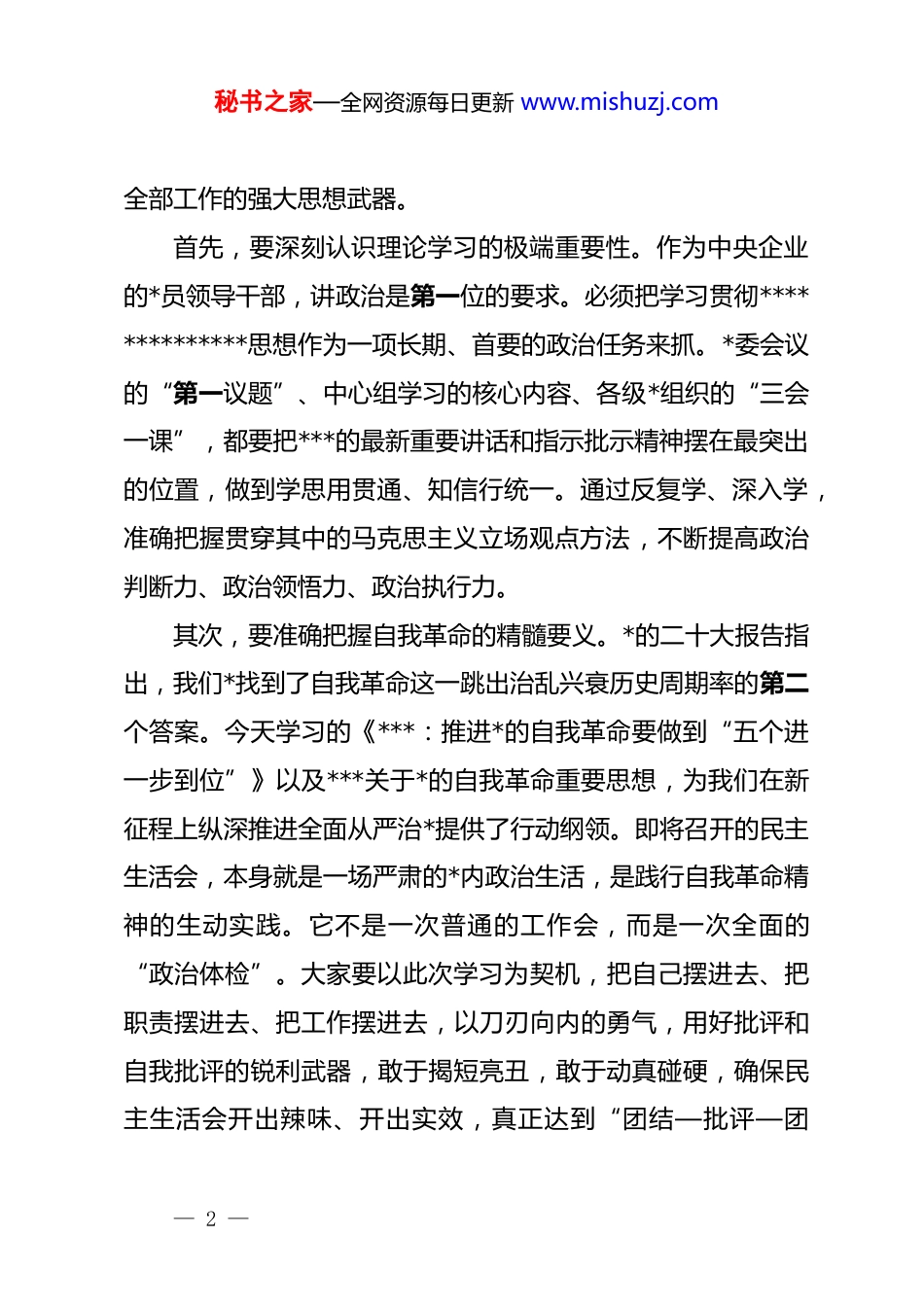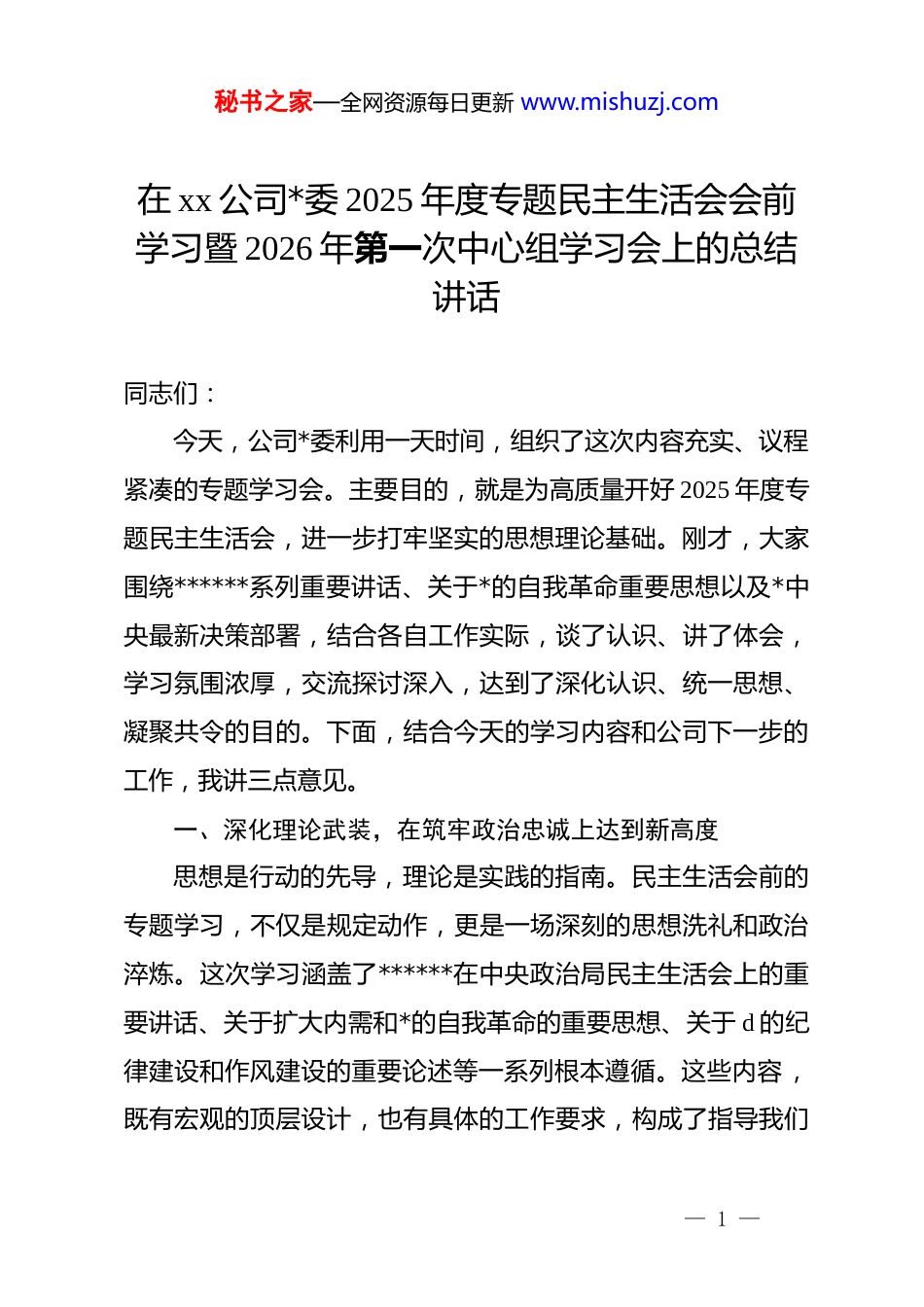 秘书之家—全网资源每日更新 www.mishuzj.com在 xx 公司*委 2025 年度专题民主生活会会前学习暨 2026 年第一次中心组学习会上的总结讲话同志们:今天,公司*委利用一天时间,组织了这次内容充实、议程紧凑的专题学习会。主要目的,就是为高质量开好 2025 年度专题民主生活会,进一步打牢坚实的思想理论基础。刚才,大家围绕******系列重要讲话、关于*的自我革命重要思想以及*中央最新决策部署,结合各自工作实际,谈了认识、讲了体会,学习氛围浓厚,交流探讨深入,达到了深化认识、统一思想、凝聚共令的目的。下面,结合今天的学习内容和公司下一步的工作,我讲三点意见。一、深化理论武装,在筑牢政治忠诚上达到新高度思想是行动的先导,理论是实践的指南。民主生活会前的专题学习,不仅是规定动作,更是一场深刻的思想洗礼和政治淬炼。这次学习涵盖了******在中央政治局民主生活会上的重要讲话、关于扩大内需和*的自我革命的重要思想、关于 d 的纪律建设和作风建设的重要论述等一系列根本遵循。这些内容,既有宏观的顶层设计,也有具体的工作要求,构成了指导我们— 1 —秘书之家—全网资源每日更新 www.mishuzj.com全部工作的强大思想武器。首先,要深刻认识理论学习的极端重要性。作为中央企业的*员领导干部,讲政治是第一位的要求。必须把学习贯彻**************思想作为一项长期、首要的政治任务来抓。*委会议的“第一议题”、中心组学习的核心内容、各级*组织的“三会一课”,都要把***的最新重要讲话和指示批示精神摆在最突出的位置,做到学思用贯通、知信行统一。通过反复学、深入学,准确把握贯穿其中的马克思主义立场观点方法,不断提高政治判断力、政治领悟力、政治执行力。其次,要准确把握自我革命的精髓要义。*的二十大报告指出,我们*找到了自我革命这一跳出治乱兴衰历史周期率的第二个答案。今天学习的《***:推进*的自我革命要做到“五个进一步到位”》以及***关于*的自我革命重要思想,为我们在新征程上纵深推进全面从严治*提供了行动纲领。即将召开的民主生活会,本身就是一场严肃的*内政治生活,是践行自我革命精神的生动实践。它不是一次普通的工作会,而是一次全面的“政治体检”。大家要以此次学习为契机,把自己摆进去、把职责摆进去、把工作摆进去,以刀刃向内的勇气,用好批评和自我批评的锐利武器,敢于揭短亮丑,敢于动真碰硬,确保民主生活会开出辣味、开出实效,真正达到“团结—批评—团— 2 —秘书之家—全网资源每日更新 www.mishuzj.com结”的目的。最后,要坚决扛起央企的职责使命。******对中央企业的工作作出了一系列****,为我们指明了前进方向。作为关系国计民生的骨干力量,我们必须时刻牢记“国之大者”,把企业的改革发展置于国家战略全局中去谋划和推进。筑牢政治忠诚,最终要体现在坚决贯彻落实*中央决策部署和 xx 集团战略安排的实际行动上。要通过这次学习,进一步强化身份认同和使命自觉,确保公司发展的航船,始终沿着*中央指引的正确方向破浪前行。二、坚持问题导向,在推动高质量发展上展现新作为学习的成效,最终要靠实践来检验。这次学习的各项内容,都与推动公司高质量发展息息相关。大家必须紧密联系公司当前面临的形势和任务,坚持问题导向,将学习成果切实转化为破解发展难题、增强发展动能的具体举措,以新担当新作为奋力开创公司发展新局面。第一,要以更高站位融入国家发展大局。2026 年是“十五五”规划的开局之年,做好今年的工作意义重大。从宏观经济形势看,我国经济长期向好的基本面没有改变,但需求收缩、供给冲击、预期转弱的三重压力依然存在。*中央明确提出要把扩大内需作为战略之举。作为建筑行业的“国家队”,我们是— 3 —秘书之家—全网资源每日更新 www.mishuzj.com扩大有效投资、畅通经济循环的主力军。学习***关于扩大内需的重要论述,就是要我们敏锐把握政策机遇,积极对接国家重大战略和区域发展规划。当前,要紧密围绕“十五五”规划中关于新质生产力培育、基础设施网络完善、区域协调发展等重大部署深入研究 xx 区域的市场潜力,特别是在新型城镇化、交通强国、水利...