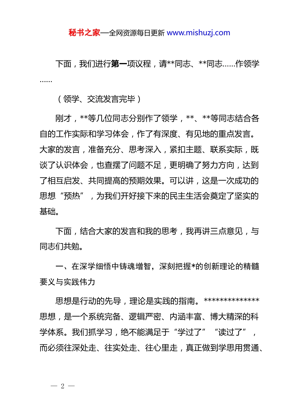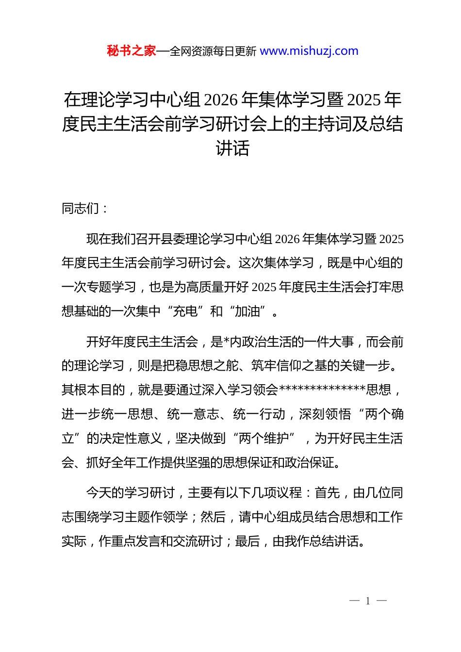 秘书之家—全网资源每日更新 www.mishuzj.com在理论学习中心组 2026 年集体学习暨 2025 年度民主生活会前学习研讨会上的主持词及总结讲话同志们:现在我们召开县委理论学习中心组 2026 年集体学习暨 2025年度民主生活会前学习研讨会。这次集体学习,既是中心组的一次专题学习,也是为高质量开好 2025 年度民主生活会打牢思想基础的一次集中“充电”和“加油”。开好年度民主生活会,是*内政治生活的一件大事,而会前的理论学习,则是把稳思想之舵、筑牢信仰之基的关键一步。其根本目的,就是要通过深入学习领会**************思想,进一步统一思想、统一意志、统一行动,深刻领悟“两个确立”的决定性意义,坚决做到“两个维护”,为开好民主生活会、抓好全年工作提供坚强的思想保证和政治保证。今天的学习研讨,主要有以下几项议程:首先,由几位同志围绕学习主题作领学;然后,请中心组成员结合思想和工作实际,作重点发言和交流研讨;最后,由我作总结讲话。— 1 —秘书之家—全网资源每日更新 www.mishuzj.com下面,我们进行第一项议程,请**同志、**同志……作领学……(领学、交流发言完毕)刚才,**等几位同志分别作了领学,**、**等同志结合各自的工作实际和学习体会,作了有深度、有见地的重点发言。大家的发言,准备充分、思考深入,紧扣主题、联系实际,既谈了认识体会,也查摆了问题不足,更明确了努力方向,达到了相互启发、共同提高的预期效果。可以讲,这是一次成功的思想“预热”,为我们开好接下来的民主生活会奠定了坚实的基础。下面,结合大家的发言和我的思考,我再讲三点意见,与同志们共勉。一、在深学细悟中铸魂增智,深刻把握*的创新理论的精髓要义与实践伟力思想是行动的先导,理论是实践的指南。**************思想,是一个系统完备、逻辑严密、内涵丰富、博大精深的科学体系。我们抓学习,绝不能满足于“学过了”“读过了”,而必须往深处走、往实处走、往心里走,真正做到学思用贯通、— 2 —秘书之家—全网资源每日更新 www.mishuzj.com知信行统一。(一)把握“两个结合”的根本要求,筑牢思想根基。***强调,“两个结合”是我们取得成功的最大法宝。一是要深刻理解“把马克思主义基本原理同中国具体实际相结合”的实践逻辑。这要求我们必须坚持一切从实际出发,把大政方针与我县的发展阶段、资源禀赋有效连接。我们不能当“传声筒”“收发室”,必须把上级精神转化为符合**县情的“施工图”“任务书”。二是要深刻感悟“把马克思主义基本原理同中华优秀传统文化相结合”的文化意蕴。中华优秀传统文化是我们最深厚的文化软实力,其中蕴含的“民为邦本”“天人合一”“革故鼎新”等思想,为我们观察时代、把握时代、引领时代提供了丰富的智慧滋养。我们要善于从中汲取力量,让我们的决策部署既有理论高度,更有文化温度和历史厚度。(二)聚焦“新质生产力”的发展要义,找准主攻方向。发展新质生产力是推动高质量发展的内在要求和重要着力点。我们县要实现换道超车、跨越发展,就必须牢牢牵住这个“牛鼻子”。一是要深刻认识科技创新这个核心要素。我们必须清醒地看到,我县目前研发投入占 gdp 比重仅为*%,高新技术企业数量仅有*家,与先进地区相比差距明显。这要求我们必须以— 3 —秘书之家—全网资源每日更新 www.mishuzj.com“慢不得”的紧迫感,全力支持企业加大研发投入,建好用好科创平台,真正让创新成为驱动发展的第一动力。二是要深刻把握产业升级这个主战场。发展新质生产力,不是要抛弃传统产业,而是要用新技术改造提升传统产业。对我县而言,要一手抓战略性新兴产业的培育壮大,比如在**新材料、**智能制造等领域谋求突破;另一手要抓**传统农业、**加工业的“数智赋能”和“绿色转型”,让老树发出新枝。去年,我县规上工业增加值增长*%,但其中高技术制造业占比仍然偏低,这是我们下一步需要着力破解的结构性难题。(三)贯穿“人民至上”的价值立场,永葆为民初心。江山就是人民,人民就是江山。我们的一切工作,出发点和落脚点都是为了让全县人民过上更好的日子。一是要在谋划发展时“多想想群众”。我们上...