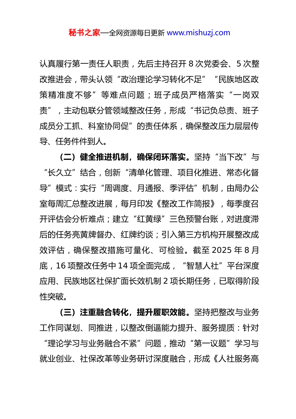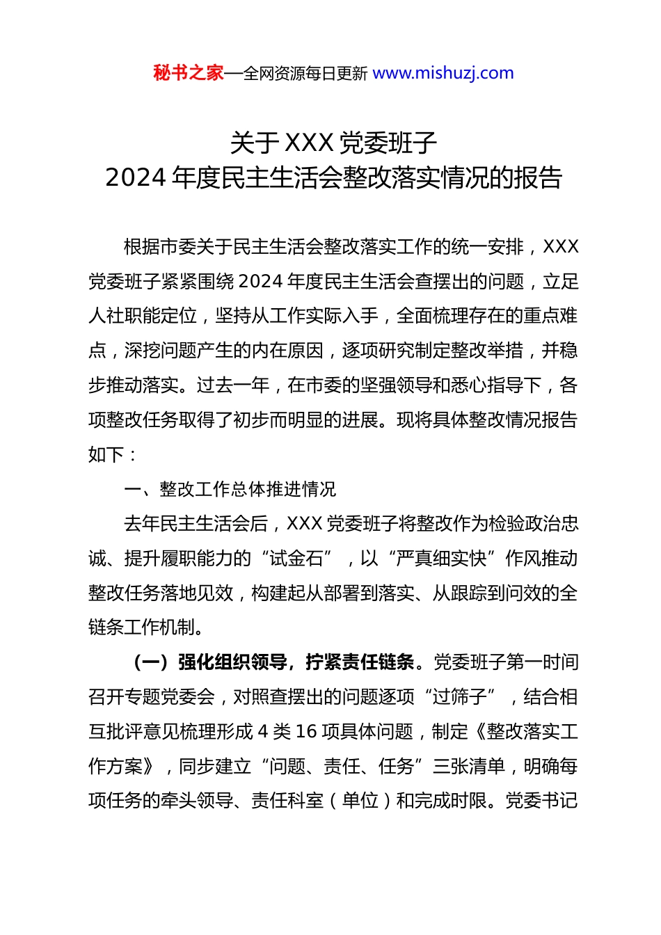 秘书之家—全网资源每日更新 www.mishuzj.com关于 XXX 党委班子2024 年度民主生活会整改落实情况的报告根据市委关于民主生活会整改落实工作的统一安排,XXX党委班子紧紧围绕 2024 年度民主生活会查摆出的问题,立足人社职能定位,坚持从工作实际入手,全面梳理存在的重点难点,深挖问题产生的内在原因,逐项研究制定整改举措,并稳步推动落实。过去一年,在市委的坚强领导和悉心指导下,各项整改任务取得了初步而明显的进展。现将具体整改情况报告如下:一、整改工作总体推进情况去年民主生活会后,XXX 党委班子将整改作为检验政治忠诚、提升履职能力的“试金石”,以“严真细实快”作风推动整改任务落地见效,构建起从部署到落实、从跟踪到问效的全链条工作机制。(一)强化组织领导,拧紧责任链条。党委班子第一时间召开专题党委会,对照查摆出的问题逐项“过筛子”,结合相互批评意见梳理形成 4 类 16 项具体问题,制定《整改落实工作方案》,同步建立“问题、责任、任务”三张清单,明确每项任务的牵头领导、责任科室(单位)和完成时限。党委书记秘书之家—全网资源每日更新 www.mishuzj.com认真履行第一责任人职责,先后主持召开 8 次党委会、5 次整改推进会,带头认领“政治理论学习转化不足”“民族地区政策精准度不够”等难点问题;班子成员严格落实“一岗双责”,主动包联分管领域整改任务,形成“书记负总责、班子成员分工抓、科室协同促”的责任体系,确保整改压力层层传导、任务件件到人。(二)健全推进机制,确保闭环落实。坚持“当下改”与“长久立”结合,创新“清单化管理、项目化推进、常态化督导”模式:实行“周调度、月通报、季评估”机制,由局办公室每周汇总整改进展,每月印发《整改工作简报》,每季度召开评估会分析难点;建立“红黄绿”三色预警台账,对进度滞后的任务亮黄牌督办、红牌约谈;引入第三方机构开展整改成效评估,确保整改措施可量化、可检验。截至 2025 年 8 月底,16 项整改任务中 14 项全面完成,“智慧人社”平台深度应用、民族地区社保扩面长效机制 2 项长期任务,已取得阶段性突破。(三)注重融合转化,提升履职效能。坚持把整改与业务工作同谋划、同推进,以整改倒逼能力提升、服务提质:针对“理论学习与业务融合不紧”问题,推动“第一议题”学习与就业创业、社保改革等业务研讨深度融合,形成《人社服务高秘书之家—全网资源每日更新 www.mishuzj.com质量发展行动方案》等成果;针对“服务群众堵点”问题,将整改成效转化为“减证便民”“跨省通办”等具体举措,群众满意度不断提升;通过整改,党委班子政治“三力”显著增强,干部队伍担当意识、创新意识明显提升,全年获评“全市民生保障先进集体”等荣誉 12 项,为人社事业发展注入强劲动力。二、重点问题整改落实情况(一)抓好“带头严守政治纪律和政治规矩,维护党的团结统一”方面的问题整改,筑牢政治忠诚根基。 针对“政治理论学习与业务融合不够紧密、对上级决策部署的落实有时存在重形式轻实效倾向、意识形态阵地管理需进一步加强”等问题,重点开展了以下工作:一是构建学用转化机制。创新理论加业务的双学模式,把习近平总书记关于人社工作的重要论述,例如“就业是最大的民生”,列为党委会和理论学习中心组的首学内容,并结合年度重点任务开展靶向研学。围绕稳就业专题,班子成员带队深入企业调研用工需求,形成《重点产业缺工清单及对策》;围绕社保改革专题,赴先进地区学习经验,制定《灵活就业人员参保扩面实施方案》。全年共开展专题研学 7 次,推动出台服务高质量发展的 25 条举措,其中“援企稳岗扩就业 10 条”直秘书之家—全网资源每日更新 www.mishuzj.com接带动企业新增岗位 3.2 万个。 二是严守政治纪律规矩。修订《党委议事决策规则》,明确凡属重大事项必须请示报告的刚性要求,全年就社保基金省级统筹、农民工工资支付监控平台建设等 32 项重点工作向市委、市政府作专题请示,确保政令畅通。组建意识形态加业务的双研判专班,针对社保政策调整、欠薪舆情等风险点,建立监测、研判、处置、复盘闭环机制,...