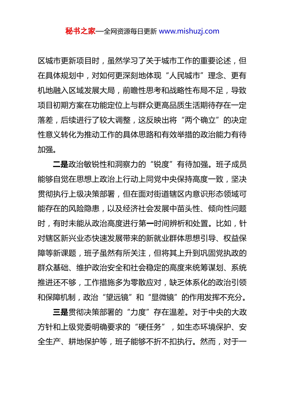 秘书之家—全网资源每日更新 www.mishuzj.com2025 年度班子对照检查材料(五个带头)根据中央、省委、市委和县委关于开好 XX 的统一部署和要求,XX 街道党工委班子紧扣会议主题,在深入开展学习研讨、广泛征求意见建议、坦诚进行谈心谈话的基础上,认真对照本次 XX 生活会明确的五个方面重点内容,深入查摆突出问题,深刻剖析问题根源,明确整改方向和措施。现将班子对照检查情况报告如下。一、存在的主要问题党工委班子坚持问题导向,对照党的创新理论,对照党章党规党纪,对照初心使命,对照群众期盼,对照先进典型,紧密联系街道工作实际和班子自身建设情况,深入查摆了以下五个方面存在的突出问题。(一)在带头强化政治忠诚、提高政治能力方面,政治判断力、政治领悟力、政治执行力仍需持续淬炼提升。一是理论武装向实践转化的“深度”尚有欠缺。班子能够坚持“第一议题”制度,及时跟进学习习近平总书记最新重要讲话和重要指示批示精神,但在系统把握、融会贯通上还不够彻底,运用党的创新理论指导街道发展实践、破解复杂难题的“结合点”和“突破口”找得不够精准。例如,在谋划 XX 片秘书之家—全网资源每日更新 www.mishuzj.com区城市更新项目时,虽然学习了关于城市工作的重要论述,但在具体规划中,对如何更深刻地体现“人民城市”理念、更有机地融入区域发展大局,前瞻性思考和战略性布局不足,导致项目初期方案在功能定位上与群众更高品质生活期待存在一定落差,后续进行了较大调整,这反映出将“两个确立”的决定性意义转化为推动工作的具体思路和有效举措的政治能力有待加强。二是政治敏锐性和洞察力的“锐度”有待加强。班子成员能够自觉在思想上政治上行动上同党中央保持高度一致,坚决贯彻执行上级决策部署,但在面对街道辖区内意识形态领域可能存在的风险隐患,以及经济社会发展中苗头性、倾向性问题时,有时未能从政治高度进行第一时间辨析和处置。比如,针对辖区新兴业态快速发展带来的新就业群体思想引导、权益保障等新课题,班子虽然有所关注,但将其上升到巩固党执政的群众基础、维护政治安全和社会稳定的高度来统筹谋划、系统推进还不够,工作措施多为零散应对,缺乏体系化的政治引领和保障机制,政治“望远镜”和“显微镜”的作用发挥不充分。三是贯彻决策部署的“力度”存在温差。对于中央的大政方针和上级党委明确要求的“硬任务”,如生态环境保护、安全生产、耕地保护等,班子能够不折不扣执行。然而,对于一秘书之家—全网资源每日更新 www.mishuzj.com些需要创造性落实、久久为功的“软任务”,有时存在“上热中温下冷”的现象,压力传导层层递减。例如,在落实“碳达峰碳中和”战略部署向基层延伸方面,更多停留在宣传倡导层面,对于如何结合街道实际,在社区节能改造、绿色生活方式推广等方面形成可量化、可考核的具体行动方案,缺乏一抓到底的狠劲和韧劲,使得宏伟蓝图在“最后一公里”的落地效果打了折扣,政治执行力在全面性、均衡性上尚有提升空间。(二)在带头固本培元、增强党性方面,理想信念的根基和党性修养的纯度仍需加固提纯。一是理想信念的“压舱石”作用在复杂考验前偶有松动。班子成员总体上理想信念是坚定的,但在长期面对基层纷繁复杂的事务、改革发展稳定的多重压力时,有时会不自觉地陷入事务主义,静下心来从世界观、人生观、价值观层面进行深刻反思和持续改造的自觉性、主动性有所减弱。例如,在处理XX 历史遗留信访积案过程中,面对当事人长期缠访、诉求多元的复杂局面,个别班子成员一度产生“畏难厌战”情绪,认为这是历史原因造成,难以彻底解决,思想上出现了“绕道走”的苗头,未能始终秉持“人民至上”的初心和“事不避难”的党性原则去全力攻坚,这本质上是理想信念在具体矛盾挑战面前的“钝化”。秘书之家—全网资源每日更新 www.mishuzj.com二是党性锻炼的“大熔炉”温度时高时低。班子成员能够参加组织生活,但有时将民主生活会、组织生活会等同于一般工作会议,批评与自我批评的“辣味”不足,尤其是在相互批评时,“好人主义”思想仍有市场,怕伤和气、怕影响团结,点问题往往隔靴搔痒,未能真...