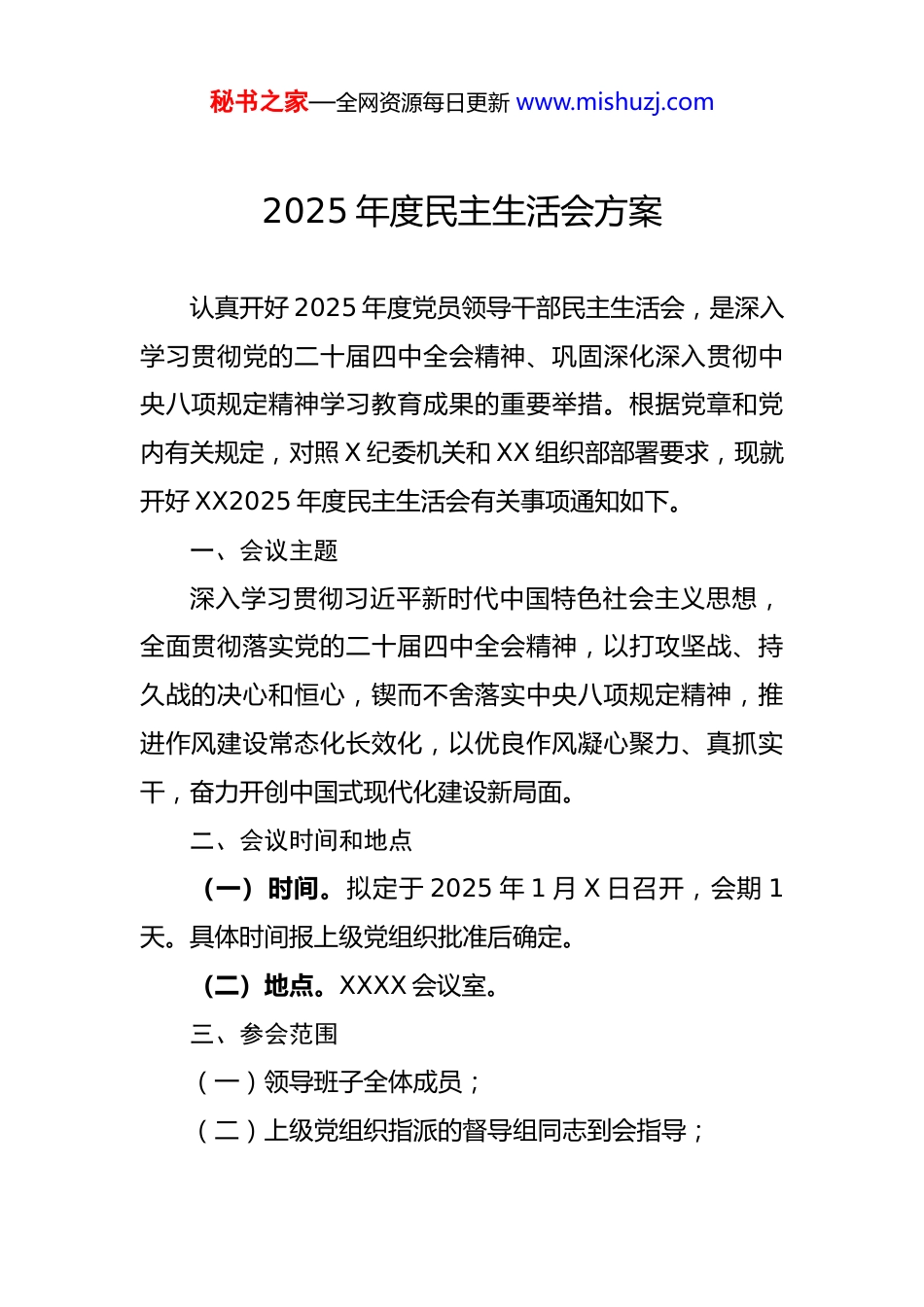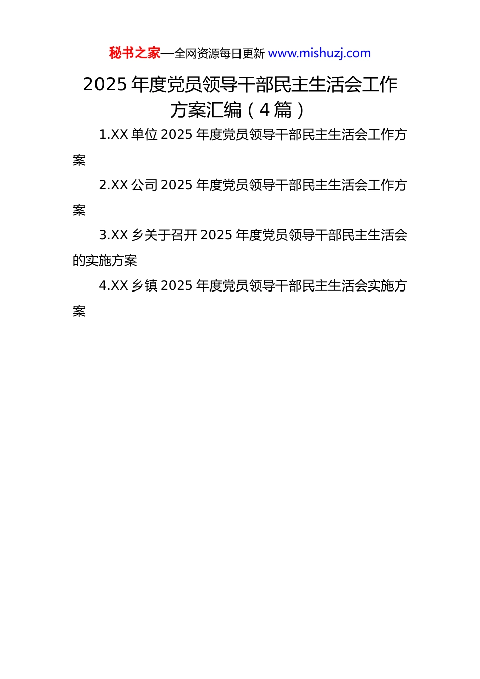 秘书之家—全网资源每日更新 www.mishuzj.com2025 年度党员领导干部民主生活会工作方案汇编(4 篇)1.XX 单位 2025 年度党员领导干部民主生活会工作方案2.XX 公司 2025 年度党员领导干部民主生活会工作方案3.XX 乡关于召开 2025 年度党员领导干部民主生活会的实施方案4.XX 乡镇 2025 年度党员领导干部民主生活会实施方案秘书之家—全网资源每日更新 www.mishuzj.com2025 年度民主生活会方案认真开好 2025 年度党员领导干部民主生活会,是深入学习贯彻党的二十届四中全会精神、巩固深化深入贯彻中央八项规定精神学习教育成果的重要举措。根据党章和党内有关规定,对照 X 纪委机关和 XX 组织部部署要求,现就开好 XX2025 年度民主生活会有关事项通知如下。一、会议主题深入学习贯彻习近平新时代中国特色社会主义思想,全面贯彻落实党的二十届四中全会精神,以打攻坚战、持久战的决心和恒心,锲而不舍落实中央八项规定精神,推进作风建设常态化长效化,以优良作风凝心聚力、真抓实干,奋力开创中国式现代化建设新局面。二、会议时间和地点(一)时间。拟定于 2025 年 1 月 X 日召开,会期 1天。具体时间报上级党组织批准后确定。(二)地点。XXXX 会议室。三、参会范围(一)领导班子全体成员;(二)上级党组织指派的督导组同志到会指导;秘书之家—全网资源每日更新 www.mishuzj.com(三)部分党员代表、干部代表、群众代表列席会议。四、会前准备(一)深化学习研讨(1 月 10 日前完成)。领导班子和党员领导干部要把学习贯彻习近平新时代中国特色社会主义思想和党的二十届四中全会精神贯穿民主生活会始终,深入学习领会习近平总书记关于党的建设的重要思想、关于党的自我革命的重要思想以及关于加强党的纪律建设、作风建设的重要论述,学习贯彻习近平总书记在二十届中央政治局第二十一次集体学习时的重要讲话和深入贯彻中央八项规定精神学习教育时的重要指示精神,学习贯彻习近平总书记在党的二十届四中全会上的重要讲话精神,学习贯彻习近平总书记关于山东工作的重要讲话重要指示批示精神,学习贯彻中央八项规定及其实施细则精神,学习《习近平谈治国理政》第五卷和党章、《中国共产党纪律处分条例》、《中共中央办公厅关于锲而不舍落实中央八项规定精神推进作风建设常态化长效化的意见》(中办发〔2025〕57 号)等,学习贯彻山东省委十二届十次全会精神,深刻认识作风建设的重要性紧迫性,进一步增强转作风树新风的政治自觉、思想自觉、行动自觉,切实把思想和行动统一到党中央决策部署上来,打牢开好秘书之家—全网资源每日更新 www.mishuzj.com民主生活会的思想基础。(二)广泛征求意见(1 月 11 日前完成)。采取适当形式,广泛征求党员、干部和群众的意见建议。一是 XXX 同志主持召开党员干部代表征求意见座谈会,由 XXXX 制定工作方案并组织实施。二是 XXX 同志主持职工代表征求意见座谈会,由 XXXX 制定工作方案并组织实施。征求到的意见建议由 XXXX 收集汇总,原汁原味反馈给 XX 领导班子及班子成员,为 XX 领导班子及班子成员查摆问题、分析原因和制定整改措施提供参考。班子成员对征求到的意见和认领的班子问题认真梳理、消化吸收,充分体现到个人发言提纲中。(三)深入谈心谈话(1 月 12 日前完成)。由党政办公室协调班子成员于 2025 年 1 月 X 日前,充分安排时间开展谈心谈话。谈心谈话要开诚布公、推心置腹,领导班子成员之间,班子成员与分管单位/部门/处室主要负责同志、与本人组织关系所在党支部党员代表必谈,既谈收获体会又谈差距不足,既谈自身缺点又谈对方问题。特别是要就贯彻中央八项规定精神、遵守党的纪律规矩方面存在的苗头性、倾向性问题以及拟在会上提出的批评意见进行充分沟通、交换看法。要把问题谈开、把思想谈通、把意见谈实,为开展批评和自我批评打好基础。秘书之家—全网资源每日更新 www.mishuzj.com1.主要负责同志带头开展谈心谈话。XXX 同志带头与其他班子成员谈心谈话,对每位班子成员的思想、工作情况作出评价,肯定成绩,同时结合征求意见的情况,对每位班子成...