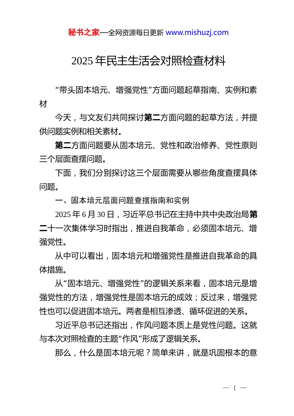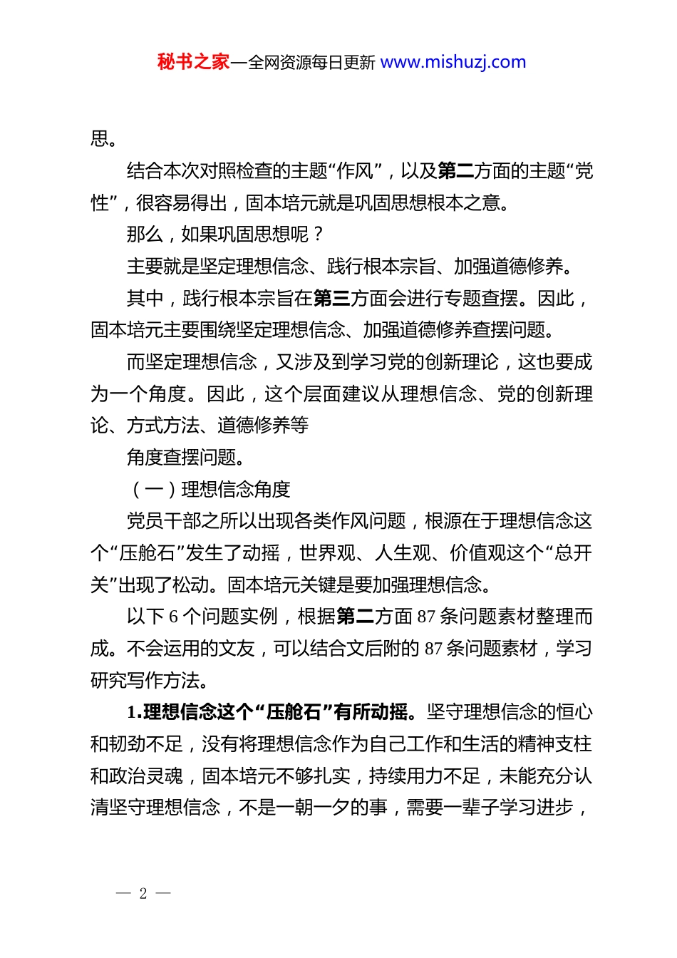 秘书之家—全网资源每日更新 www.mishuzj.com2025 年民主生活会对照检查材料“”带头固本培元、增强党性 方面问题起草指南、实例和素材今天,与文友们共同探讨第二方面问题的起草方法,并提供问题实例和相关素材。第二方面问题要从固本培元、党性和政治修养、党性原则三个层面查摆问题。下面,我们分别探讨这三个层面需要从哪些角度查摆具体问题。一、固本培元层面问题查摆指南和实例2025 年 6 月 30 日,习近平总书记在主持中共中央政治局第二十一次集体学习时指出,推进自我革命,必须固本培元、增强党性。从中可以看出,固本培元和增强党性是推进自我革命的具体措施。“”从 固本培元、增强党性 的逻辑关系来看,固本培元是增强党性的方法,增强党性是固本培元的成效;反过来,增强党性也可以促进固本培元。两者是相互渗透、循环促进的关系。习近平总书记还指出,作风问题本质上是党性问题。这就“”与本次对照检查的主题 作风 形成了逻辑关系。那么,什么是固本培元呢?简单来讲,就是巩固根本的意— 1 —秘书之家—全网资源每日更新 www.mishuzj.com思。“”结合本次对照检查的主题 作风 ,以及第二“方面的主题 党”性 ,很容易得出,固本培元就是巩固思想根本之意。那么,如果巩固思想呢?主要就是坚定理想信念、践行根本宗旨、加强道德修养。其中,践行根本宗旨在第三方面会进行专题查摆。因此,固本培元主要围绕坚定理想信念、加强道德修养查摆问题。而坚定理想信念,又涉及到学习党的创新理论,这也要成为一个角度。因此,这个层面建议从理想信念、党的创新理论、方式方法、道德修养等角度查摆问题。(一)理想信念角度党员干部之所以出现各类作风问题,根源在于理想信念这“”“个 压舱石 发生了动摇,世界观、人生观、价值观这个 总开”关 出现了松动。固本培元关键是要加强理想信念。以下 6 个问题实例,根据第二方面 87 条问题素材整理而成。不会运用的文友,可以结合文后附的 87 条问题素材,学习研究写作方法。1.“”理想信念这个 压舱石 有所动摇。坚守理想信念的恒心和韧劲不足,没有将理想信念作为自己工作和生活的精神支柱和政治灵魂,固本培元不够扎实,持续用力不足,未能充分认清坚守理想信念,不是一朝一夕的事,需要一辈子学习进步,— 2 —秘书之家—全网资源每日更新 www.mishuzj.com一辈子改造提升,学习马克思主义基本原理及其中国化时代化最新成果,不够全面系统、及时深入,政治历练与实践锻炼不够积极主动,没有将贯穿其中的立场观点方法,有效融入到坚守理想信念的具体实践中,理想信念的自我学习教育,未能真正转化为思想自觉和行动自觉,导致改造主观世界的成效不够显著。(二)党的创新理论和方式方法角度“”这个方面不建议围绕 学懂弄通做实 查摆问题,尽量围“”绕 作风、学风 查摆问题。2.理论联系实际的学风有所放松。坚持用党的创新理论固本培元的劲头不足,理论根基不牢,有时未能辩证、灵活地运用党的创新理论研究新情况、解决新问题,导致应对复杂局面、解决棘手问题的政治能力有所欠缺,政治品格有所弱化,学习成果没有高效转化为提高党性觉悟、推动事业高质量发展的实际能力。对党的创新理论学习不够深入,方法不够科学,未能充分体悟习近平新时代中国特色社会主义思想中的道理学理哲理,对于如何将蕴含其中的政治品格、价值追求、精神境界、作风操守等要求,有效融入到具体工作实际,缺少系统性地思考和研究,从党的创新理论中汲取思想滋养、精神动力的成效还不够明显。(三)道德修养角度“道德修养是党员、干部的人生必修课,是固本培元的 总开— 3 —秘书之家—全网资源每日更新 www.mishuzj.com”关 ,只有不断提升个人道德境界,才能坚守共产党人的精神家园。3.“”道德修养的 总开关 拧得不够紧。在汲取固本培元的智慧方面存在差距,从中华优秀传统文化中学习领会道德伦理和道德精髓不全面、不具体,从高尚情操和君子人格中汲取道德力量不足,未能在见贤思齐中有效提升思想境界、涵养道德情操,对照先进典型,自己的内在自觉和日常修为仍然存在薄弱环节,有时在小事小节上,...