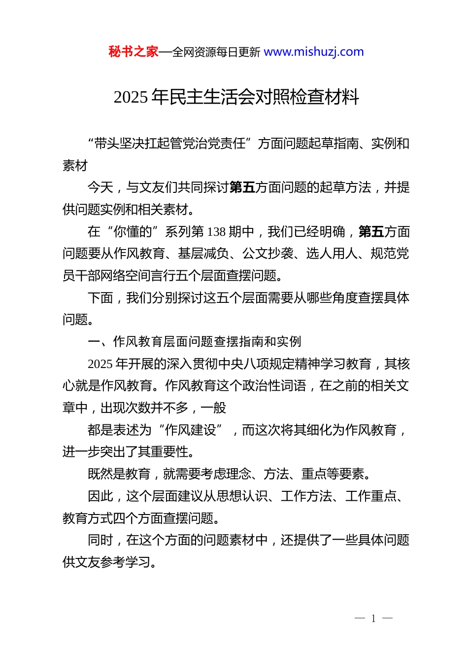 秘书之家—全网资源每日更新 www.mishuzj.com2025 年民主生活会对照检查材料“带头坚决扛起管党治党责任”方面问题起草指南、实例和素材今天,与文友们共同探讨第五方面问题的起草方法,并提供问题实例和相关素材。在“你懂的”系列第 138 期中,我们已经明确,第五方面问题要从作风教育、基层减负、公文抄袭、选人用人、规范党员干部网络空间言行五个层面查摆问题。下面,我们分别探讨这五个层面需要从哪些角度查摆具体问题。一、作风教育层面问题查摆指南和实例2025 年开展的深入贯彻中央八项规定精神学习教育,其核心就是作风教育。作风教育这个政治性词语,在之前的相关文章中,出现次数并不多,一般都是表述为“作风建设”,而这次将其细化为作风教育,进一步突出了其重要性。既然是教育,就需要考虑理念、方法、重点等要素。因此,这个层面建议从思想认识、工作方法、工作重点、教育方式四个方面查摆问题。同时,在这个方面的问题素材中,还提供了一些具体问题供文友参考学习。— 1 —秘书之家—全网资源每日更新 www.mishuzj.com以下 12 个问题实例,根据第五方面 200 条问题素材整理而成。不会运用的文友,可以结合文后附的 200 条问题素材,学习研究写作方法。(一)思想认识角度1.对常态化开展作风教育的理解有偏差。经常抓、深入抓、持久抓的思想观念不够完整准确,没有认识到过硬作风的形成是一个艰难过程,认为常态化开展作风教育就是对分管干部经常拍拍肩膀、拉拉袖子、咬咬耳朵,没有从政治上认识作风教育的重要性、必要性和紧迫性,没有把政治标准和政治要求贯穿作风教育的始终,透过干部作风看干部党性的意识不足,对分管干部的小事小节不够较真,对于个别分管干部穿上“隐身衣”、躲进“青纱帐”的作风问题纠正得不够严格和彻底,对分管干部的精神状态、思想观念、素质能力、作风形象抓得不够均衡、持续用力不足,防微杜渐、常抓不懈做得不到位。未能时刻把作风教育摆上重要位置,也未能有机融入到日常工作中,抓作风促工作、抓工作强作风的良性循环尚未完全形成。(二)工作方法角度2.作风建设的制度成果尚未完全转化为治理效能。将教育引导作为抓作风建设的主要方式,运用法治思维和法治方式有所欠缺,制度的约束力有所欠缺,刚性不足。对于作风建设地区性、行业性、阶段性特点的常态化分析坚持得不够好,未能— 2 —秘书之家—全网资源每日更新 www.mishuzj.com及时根据违反作风要求的新情形,不断健全和完善作风建设的新机制,对于一些见诸各项制度文件的规定,也未能及时整合运用,作风建设制度的着力点把握得不够严实,导致制度建设存在漏洞和真空地带。缺少改革精神和系统观念,梳理评估已有的制度规定和经验做法不够及时和细致,未能第一时间将贯彻中央八项规定精神的好做法好经验上升为制度。(三)教育方式角度3.作风教育的针对性和时代性不强。未能从党员干部实际需求的角度出发强化作风教育,自己的语言风格固化,教育载体不够丰富和灵活,特别是借助融媒体和大数据等时代优势不够充分,作风教育内容未能贴近党员干部工作和生活实际,化抽象的作风为具体的要求不够彻底,导致优良作风未能在党员干部的头脑中生根发芽、也未能及时变成行动自觉。对革命、建设、改革各时期的优良作风典范梳理不够全面系统,对身边先进典型挖掘和宣扬不够到位,未能将这些先进典型身上展现出的优良作风,有效转化为价值追求和行为准则,导致一些党员干部在日常工作、学习和生活中,未能时刻以高标准要求自己。作风教育“精准滴灌”不够到位,未能充分考虑党员干部队伍构成的多元性,对不同年龄段、不同经历的党员干部,往往采用“上下一般粗”的教育方式,施教方法不够科学,没有做到有效适配,使作风教育成果打了折扣。二、基层减负层面问题查摆指南和实例— 3 —秘书之家—全网资源每日更新 www.mishuzj.com2025 年 8 月 6 日中共中央办公厅、国务院办公厅印发了《整治形式主义为基层减负若干规定》,首次以党内法规形式制定出台为基层减负的制度规范,明确了 7 方面 21 条具体规定。同时,要想推动基层减负工作走深走实,就要把加强党...
