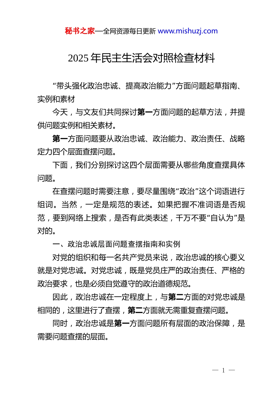 秘书之家—全网资源每日更新 www.mishuzj.com2025 年民主生活会对照检查材料“”带头强化政治忠诚、提高政治能力 方面问题起草指南、实例和素材今天,与文友们共同探讨第一方面问题的起草方法,并提供问题实例和相关素材。第一方面问题要从政治忠诚、政治能力、政治责任、战略定力四个层面查摆问题。下面,我们分别探讨这四个层面需要从哪些角度查摆具体问题。“”在查摆问题时需要注意,要尽量围绕 政治 这个词语进行组词。当然,一定是规范的表述。如果把握不准词语是否规“”范,要到网络上搜索,是否有此类表述,千万不要 自认为 是对的。一、政治忠诚层面问题查摆指南和实例对党的组织和每一名共产党员来说,政治忠诚的核心要义就是对党忠诚。对党忠诚,既是党员庄严的政治责任、严格的政治要求,也是必须自觉遵守的政治道德规范。因此,政治忠诚在一定程度上,与第二方面的对党忠诚是相同的,这里进行了查摆,第二方面就无需重复查摆问题。同时,政治忠诚是第一方面问题所有层面的政治保障,是需要问题查摆的层面。— 1 —秘书之家—全网资源每日更新 www.mishuzj.com那么,政治忠诚这个层面的问题,需要从哪些角度查摆呢?(一)思想认识角度实事求是讲,一些文友对于政治忠诚,并没有明确的概念和认知,或是认为这只是政治性的原则要求,或是认为这是抽象性的概念,或是认为这只是对于有一定级别的领导干部才适用。当然,这些观点都是错误的。政治忠诚核心要义就是对党忠诚,对党忠诚就有了具体内容。习近平总书记在广东考察时对开展主题教育提出明确要“”“求,对 以学铸魂 作出深刻阐释,其中在阐述 铸牢对党忠”“诚 时强调, 自觉坚持党的全面领导、坚定维护党中央权威和集中统一领导,不断提高政治判断力、政治领悟力、政治执行力,始终在政治立场、政治方向、政治原则、政治道路上同党中央保持高度一致,把对党忠诚体现到贯彻落实好党中央决策”部署的实际行动上 。因此,政治忠诚不是抽象的,而是具体的,可以落实的。但这个方面,很多领导干部做得并不好,需要进行问题查摆。以下 10 个问题实例,根据第一方面 138 条问题素材整理而成。不会运用的文友,可以结合文后附的 138 条问题素材,学习研究写作方法。1.对政治忠诚理解和把握不够精准。政治站位不够高,未— 2 —秘书之家—全网资源每日更新 www.mishuzj.com能时时事事都站在党和国家的政治高度,充分认识政治忠诚的重要性、必要性和紧迫性,有时认为自己只是基层领导干部,距离政治认同、政治信仰等政治忠诚的基本维度比较远,学习和践行党的基本理论、基本路线、基本方略不够积极和主动,“也不够系统和全面,没有彻底理解 政治忠诚的核心要义就是对”“党忠诚 的政治要求,政治领悟力不足,没有将 对党忠诚不是”抽象的而是具体的 的政治认同铸入灵魂、融入血液,在落实党的理论和路线方针政策的过程中,在推进高质量发展的过程中,有时未能做到尽心尽力、尽善尽美。(二)责任使命角度这个角度与上一个思想认识的角度类似,都是从自身出发查摆问题,主要就是查摆思想认识层面的问题。但责任使命角度侧重比较具体的问题内容,主要包括学习党史和中华优秀传统文化。2.践行政治忠诚筑不够严实。在筑牢政治忠诚的具体实践中,思想淬炼和政治历练不经常、不到位,未能将学习党史和中华优秀传统文化作为重要的职责使命,对党的成长历史、奋斗历程、重大决策和历史性贡献了解和掌握得不够全面和具体,对传统文化中艺术、文学、哲学的现实价值体会不够系统和深刻,政治素养和思想境界不够高,学以致用不够及时有效,面对外来文化通过经济、娱乐、文化等方面影响自己以及分管干部的生活方式、价值观念的严峻现实,缺少从党史和中— 3 —秘书之家—全网资源每日更新 www.mishuzj.com华优秀传统文化中汲取智慧力量的主动意识和政治能力,创造性转化和创新性发展持续用力不足,拿不出多维培塑的有效办法,导致自己及个别分管干部的理论自信和文化自信,未能及时转化成对党忠诚的自觉性。(三)一岗双责、教育培训、工作方法角度这三个角度虽然是分开分类,但强调的都是对干部的思...