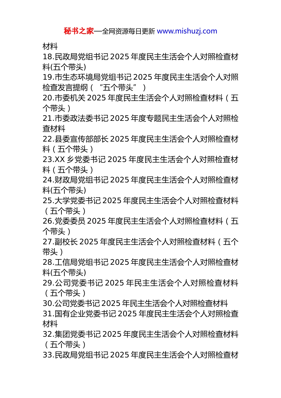 秘书之家—全网资源每日更新 www.mishuzj.com2025 年度民主生活会个人对照检查材料汇编(39 篇)1.局党组书记 2025 年度民主生活会个人对照检查材料(五个带头)2.XX 县长 2025 年度民主生活会个人对照检查材料3.2025 年度民主生活会个人对照检查材料(五个带头)4.2025 年度民主生活会个人对照检查(医保)5.公司党委书记 2025 年度民主生活会个人对照检查材料(五个带头)6.区政法委书记 2025 年度民主生活会个人对照检查材料7.市农业农村局党组书记 2025 年度民主生活会个人对照检查发言提纲8.市水利局党组书记 2025 年度民主生活会个人对照检查材料9.书记 2025 年度民主生活会个人对照检查材料10.县委常委、常务副县长 2025 年度民主生活会个人对照检查材料(五个带头)11.乡镇组织委员 2025 年度民主生活会个人对照检查材料12.职业技术学院党委书记 2025 年度民主生活会个人对照检查材料(五个带头)13.中学党委书记 2025 年度民主生活会个人对照检查材料(五个带头)14.分管城建副区长 2025 年度民主生活会个人对照检查材料(五个带头)15.分管人大教科文卫工作市人大常委会副主任 2025 年度民主生活会个人对照检查材料(五个带头)16.高校党委组织部长 2025 年度民主生活会个人对照检查材料(五个带头)17.国有企业党委书记 2025 年度民主生活会个人对照检查秘书之家—全网资源每日更新 www.mishuzj.com材料18.民政局党组书记 2025 年度民主生活会个人对照检查材料(五个带头)19.市生态环境局党组书记 2025 年度民主生活会个人对照检查发言提纲(“五个带头”)20.市委机关 2025 年度民主生活会个人对照检查材料(五个带头)21.市委政法委书记 2025 年度专题民主生活会个人对照检查材料22.县委宣传部部长 2025 年度民主生活会个人对照检查材料(五个带头)23.XX 乡党委书记 2025 年度民主生活会个人对照检查材料(五个带头)24.财政局党组书记 2025 年度民主生活会个人对照检查材料(五个带头)25.大学党委书记 2025 年度民主生活会个人对照检查材料(五个带头)26.党委委员 2025 年度民主生活会个人对照检查材料(五个带头)27.副校长 2025 年度民主生活会个人对照检查材料(五个带头)28.工信局党组书记 2025 年度民主生活会个人对照检查材料(五个带头)29.公司党委书记 2025 年民主生活会个人对照检查材料(五个带头)30.公司党委书记 2025 年民主生活会个人对照检查材料31.国有企业党委书记 2025 年度民主生活会个人对照检查材料32.集团党委书记 2025 年度民主生活会个人对照检查材料(五个带头)33.民政局党组书记 2025 年度民主生活会个人对照检查材秘书之家—全网资源每日更新 www.mishuzj.com料(五个带头)34.区政法委书记 2025 年度民主生活会个人对照检查材料35.市纪委书记 2025 年度民主生活会个人对照检查材料36.市农业农村局党组书记 2025 年度民主生活会个人对照检查发言提纲37.县委常委、常务副县长 2025 年度民主生活会个人对照检查材料(五个带头)38.学校党委书记专题民主生活会个人对照检查材料39.中学党委书记 2025 年度民主生活会个人对照检查材料(五个带头)局党组书记 2025 年度民主生活会个人对照检查材料(五个带头)根据本次民主生活会主题要求,本人紧扣深入学习贯彻习近平新时代中国特色社会主义思想,全面贯彻落实党的二十届三中、四中全会精神,锲而不舍落实中央八项规定精神,推进作风建设常态化长效化等核心要求,在深入开展学习研讨、广泛征求意见建议、坦诚进行谈心谈话的基础上,严格对照五个方面重点内容,紧密结合个人思想、学习和工作实际,深入查摆问题,深刻剖析根源,明确整改方向。现将个人对照检查情况报告如下。一、存在的主要问题(一)在带头强化政治忠诚、提高政治能力方面。一是政治判断的“望远镜”焦距有时模糊。对“两个确立”决定性意义的领悟,在将其蕴含的立场观点方法转化为应秘书之家—全网资源每日更新 www.mishuzj.com对复杂监管形势的具体策略上,存在时差和温差。例如,在谋划 2025 年全县市场监管工作要点时,虽然强调了服务...