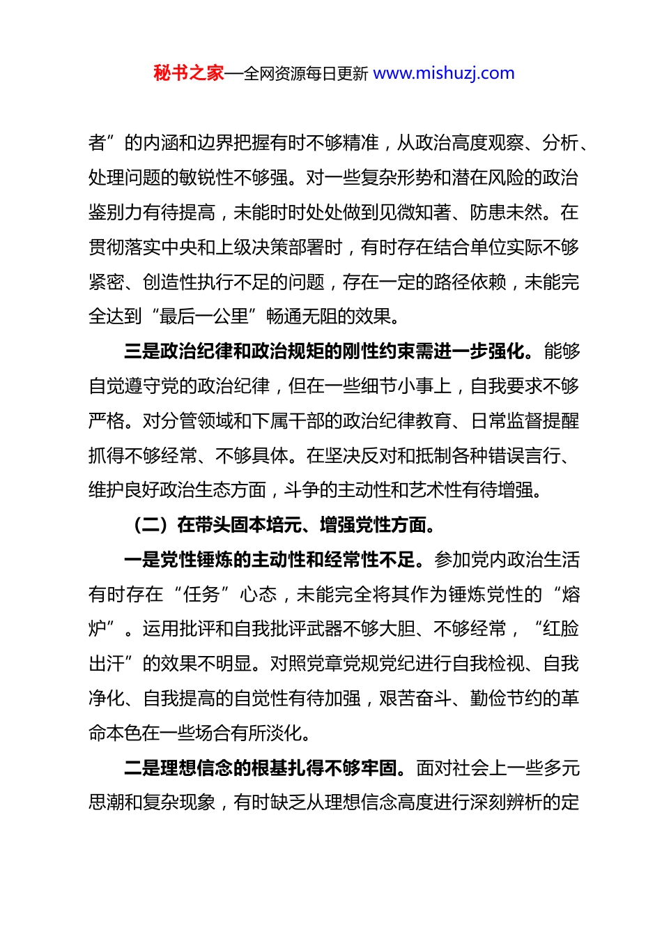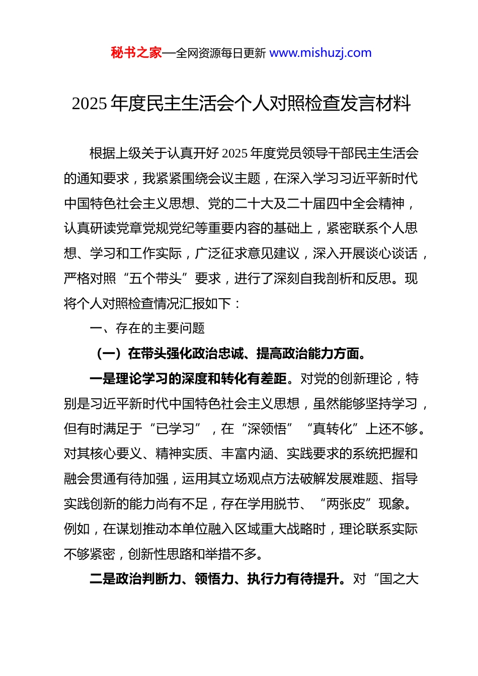 秘书之家—全网资源每日更新 www.mishuzj.com2025 年度民主生活会个人对照检查发言材料根据上级关于认真开好 2025 年度党员领导干部民主生活会的通知要求,我紧紧围绕会议主题,在深入学习习近平新时代中国特色社会主义思想、党的二十大及二十届四中全会精神,认真研读党章党规党纪等重要内容的基础上,紧密联系个人思想、学习和工作实际,广泛征求意见建议,深入开展谈心谈话,严格对照“五个带头”要求,进行了深刻自我剖析和反思。现将个人对照检查情况汇报如下:一、存在的主要问题(一)在带头强化政治忠诚、提高政治能力方面。一是理论学习的深度和转化有差距。对党的创新理论,特别是习近平新时代中国特色社会主义思想,虽然能够坚持学习,但有时满足于“已学习”,在“深领悟”“真转化”上还不够。对其核心要义、精神实质、丰富内涵、实践要求的系统把握和融会贯通有待加强,运用其立场观点方法破解发展难题、指导实践创新的能力尚有不足,存在学用脱节、“两张皮”现象。例如,在谋划推动本单位融入区域重大战略时,理论联系实际不够紧密,创新性思路和举措不多。二是政治判断力、领悟力、执行力有待提升。对“国之大秘书之家—全网资源每日更新 www.mishuzj.com者”的内涵和边界把握有时不够精准,从政治高度观察、分析、处理问题的敏锐性不够强。对一些复杂形势和潜在风险的政治鉴别力有待提高,未能时时处处做到见微知著、防患未然。在贯彻落实中央和上级决策部署时,有时存在结合单位实际不够紧密、创造性执行不足的问题,存在一定的路径依赖,未能完全达到“最后一公里”畅通无阻的效果。三是政治纪律和政治规矩的刚性约束需进一步强化。能够自觉遵守党的政治纪律,但在一些细节小事上,自我要求不够严格。对分管领域和下属干部的政治纪律教育、日常监督提醒抓得不够经常、不够具体。在坚决反对和抵制各种错误言行、维护良好政治生态方面,斗争的主动性和艺术性有待增强。(二)在带头固本培元、增强党性方面。一是党性锤炼的主动性和经常性不足。参加党内政治生活有时存在“任务”心态,未能完全将其作为锤炼党性的“熔炉”。运用批评和自我批评武器不够大胆、不够经常,“红脸出汗”的效果不明显。对照党章党规党纪进行自我检视、自我净化、自我提高的自觉性有待加强,艰苦奋斗、勤俭节约的革命本色在一些场合有所淡化。二是理想信念的根基扎得不够牢固。面对社会上一些多元思潮和复杂现象,有时缺乏从理想信念高度进行深刻辨析的定秘书之家—全网资源每日更新 www.mishuzj.com力。在长期、复杂、艰苦的环境考验面前,理想信念的“压舱石”作用发挥还不够充分。对标革命先辈和先进典型,自我革命的精神和境界存在差距。三是组织观念和党员意识有待强化。在执行民主集中制方面,有时酝酿讨论不够充分,听取各方面意见特别是不同意见的耐心和广度有待提升。以普通党员身份参加所在支部活动有时不够积极主动,与基层党员群众的直接思想交流不够深入。向组织请示报告个人有关事项能够做到,但在思想动态、工作难点等方面的主动汇报沟通可以更及时、更充分。(三)在带头敬畏人民、敬畏组织、敬畏法纪方面。一是践行以人民为中心的发展思想有温差。深入基层一线、深入群众“解剖麻雀”式调研不够经常,对群众的急难愁盼问题掌握得不够全面、精准。有时坐在办公室听汇报、看材料多,与群众面对面、心贴心交流少,服务群众的针对性、实效性有待提高。在推动解决历史遗留问题或复杂民生诉求时,攻坚克难的韧劲和“钉钉子”精神还需加强。二是对组织的敬畏之心有所欠缺。对组织的培养、信任和重托心存感激,但在思考如何更好履职尽责、创造性地开展工作以回报组织方面,主动性、前瞻性不足。有时存在“等靠要”思想,面对组织交办的急难险重任务,迎难而上、主动破秘书之家—全网资源每日更新 www.mishuzj.com题的锐气有所减退。三是法纪意识和规矩意识的底线思维树得不够牢。对党纪国法的学习理解有时停留在“知道”层面,未能完全内化为行动自觉和日常习惯。在自觉接受监督、习惯在监督下工作生活方面做得不够到位。对分管领域和身边工作人员的纪法教育、警示教育...