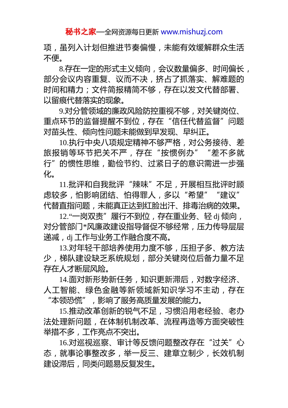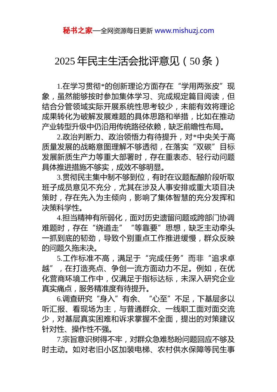 秘书之家—全网资源每日更新 www.mishuzj.com2025 年民主生活会批评意见(50 条)1.在学习贯彻*的创新理论方面存在“学用两张皮”现象,虽然能够按时参加集体学习、完成规定篇目阅读,但结合分管领域实际开展系统性思考较少,未能有效将理论成果转化为破解发展难题的具体思路和举措,比如在推动产业转型升级中仍沿用传统路径依赖,缺乏前瞻性布局。2.政治判断力、政治领悟力有待提升,对*中央关于高质量发展的战略意图理解不够透彻,在落实“双碳”目标发展新质生产力等重大部署时,存在重表态、轻行动问题具体推进措施不够实,成效不够明显。3.贯彻民主集中制不够到位,有时在议题酝酿阶段听取班子成员意见不充分,尤其在涉及人事安排或重大项目决策时,存在先入为主倾向,影响了集体智慧的充分发挥和决策科学性。4.担当精神有所弱化,面对历史遗留问题或跨部门协调难题时,存在“绕道走”“等靠要”思想,缺乏主动牵头一抓到底的韧劲,导致个别重点工作推进缓慢,群众反映的问题久拖未决。5.工作标准不高,满足于“完成任务”而非“追求卓越”,在打造亮点、争创一流方面动力不足。例如,在优化营商环境工作中,仅满足于指标达标,未深入研究企业真实痛点,服务精准度有待提升。6.调查研究“身入”有余、“心至”不足,下基层多以听汇报、看现场为主,与普通群众、一线职工面对面交流少,对基层真实困难和诉求掌握不全面,提出的对策建议针对性、操作性不强。7.宗旨意识树得不牢,对群众急难愁盼问题回应不够及时主动。如对老旧小区加装电梯、农村供水保障等民生事秘书之家—全网资源每日更新 www.mishuzj.com项,虽列入计划但推进节奏偏慢,未能有效缓解群众生活不便。8.存在一定的形式主义倾向,会议数量偏多、时间偏长,部分会议内容重复、议而不决,挤占了抓落实、解难题的时间和精力;文件简报精简不够,存在以发文代替部署、以留痕代替落实的现象。9.对分管领域的廉政风险防控重视不够,对关键岗位、重点环节的监督提醒不到位,存在“信任代替监督”问题对苗头性、倾向性问题未能做到早发现、早纠正。10.执行中央八项规定精神不够严格,对公务接待、差旅报销等环节把关不严,存在“按惯例办”“差不多就行”的惯性思维,勤俭节约、过紧日子的意识需进一步强化。11.批评和自我批评“辣味”不足,开展相互批评时顾虑较多,怕影响团结、怕得罪人,多以“希望”“建议”代替直指问题,未能真正达到红脸出汗、排毒治病的效果。12.“一岗双责”履行不到位,存在重业务、轻 dj 倾向,对分管部门*风廉政建设指导督促不够经常,压力传导层层递减,dj 工作与业务工作融合度不高。13.对年轻干部培养使用力度不够,压担子多、教方法少,梯队建设缺乏系统规划,部分关键岗位后备力量不足存在人才断层风险。14.面对新形势新任务,知识更新滞后,对数字经济、人工智能、绿色金融等新领域新知识学习不主动,存在“本领恐慌”,影响了服务高质量发展的能力。15.推动改革创新的锐气不足,习惯沿用老经验、老办法处理新问题,在体制机制改革、流程再造等方面突破性举措不多,工作亮点不突出。16.对巡视巡察、审计等反馈问题整改存在“过关”心态,就事论事整改多,举一反三、建章立制少,长效机制建设滞后,同类问题易反复发生。秘书之家—全网资源每日更新 www.mishuzj.com17.在推动乡村振兴中统筹谋划不够,对产业发展、乡村治理、人居环境整治等重点工作协同推进不足,存在“单打一”现象,整体成效打折扣。18.服务企业意识有待加强,在招商引资和项目落地过程中,重签约轻服务,对企业后续运营中遇到的用地、用工、融资等难题协调解决不及时。19.对意识形态工作重视不够,对分管领域舆情风险研判不足,对网络空间错误言论斗争不够坚决,阵地管理存在薄弱环节。20.个人有关事项报告不够严谨细致,个别事项填报说明不清,存在漏报、模糊表述等情况,反映出纪律规矩意识需进一步增强。21.家风建设重视不够,对配偶、子女及身边工作人员教育提醒不经常,对其社会交往圈关注不多,廉洁“后院”防线需加固。22.在推动共同富裕方面思路不宽,对低收入群体增收、公共服务均等化等重点任务...