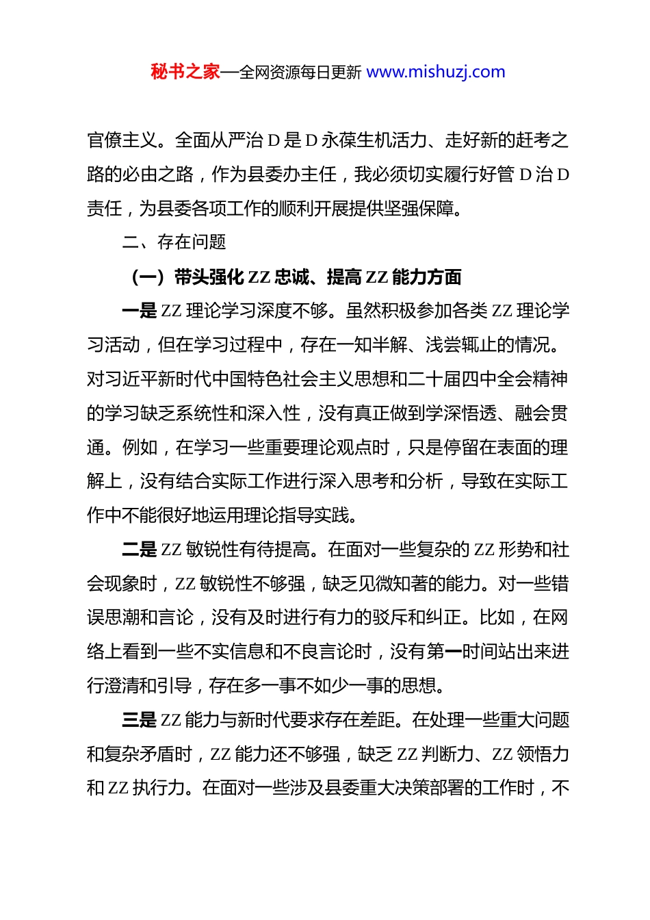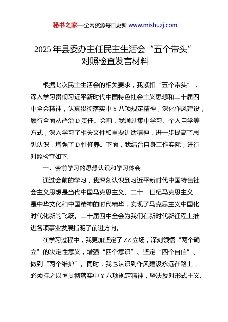 秘书之家—全网资源每日更新 www.mishuzj.com2025 年县委办主任民主生活会“五个带头”对照检查发言材料根据此次民主生活会的相关要求,我紧扣“五个带头”,深入学习贯彻习近平新时代中国特色社会主义思想和二十届四中全会精神,认真贯彻落实中 Y 八项规定精神,深化作风建设,履行全面从严治 D 责任。会前,我通过集中学习、个人自学等方式,深入学习了相关文件和重要讲话精神,进一步提高了思想认识,增强了 D 性修养。下面,我结合自身工作实际,进行对照检查如下。一、会前学习的思想认识和学习体会通过会前的学习,我深刻认识到习近平新时代中国特色社会主义思想是当代中国马克思主义、二十一世纪马克思主义,是中华文化和中国精神的时代精华,实现了马克思主义中国化时代化新的飞跃。二十届四中全会为我们在新时代新征程上推进各项事业发展指明了前进方向。在学习过程中,我更加坚定了 ZZ 立场,深刻领悟“两个确立”的决定性意义,增强“四个意识”、坚定“四个自信”、做到“两个维护”。同时,我也认识到作风建设永远在路上,必须持之以恒贯彻落实中 Y 八项规定精神,坚决反对形式主义、秘书之家—全网资源每日更新 www.mishuzj.com官僚主义。全面从严治 D 是 D 永葆生机活力、走好新的赶考之路的必由之路,作为县委办主任,我必须切实履行好管 D 治 D责任,为县委各项工作的顺利开展提供坚强保障。二、存在问题(一)带头强化 ZZ 忠诚、提高 ZZ 能力方面一是 ZZ 理论学习深度不够。虽然积极参加各类 ZZ 理论学习活动,但在学习过程中,存在一知半解、浅尝辄止的情况。对习近平新时代中国特色社会主义思想和二十届四中全会精神的学习缺乏系统性和深入性,没有真正做到学深悟透、融会贯通。例如,在学习一些重要理论观点时,只是停留在表面的理解上,没有结合实际工作进行深入思考和分析,导致在实际工作中不能很好地运用理论指导实践。二是 ZZ 敏锐性有待提高。在面对一些复杂的 ZZ 形势和社会现象时,ZZ 敏锐性不够强,缺乏见微知著的能力。对一些错误思潮和言论,没有及时进行有力的驳斥和纠正。比如,在网络上看到一些不实信息和不良言论时,没有第一时间站出来进行澄清和引导,存在多一事不如少一事的思想。三是 ZZ 能力与新时代要求存在差距。在处理一些重大问题和复杂矛盾时,ZZ 能力还不够强,缺乏 ZZ 判断力、ZZ 领悟力和 ZZ 执行力。在面对一些涉及县委重大决策部署的工作时,不秘书之家—全网资源每日更新 www.mishuzj.com能从 ZZ 高度去分析和解决问题,导致工作推进不够顺利。(二)带头固本培元、增强 D 性方面一是 D 性修养不够自觉。在日常工作和生活中,有时会放松对自己的要求,缺乏自我约束和自我监督。没有时刻以一名优秀共产 D 员的标准严格要求自己,存在随波逐流的思想。例如,在参加一些集体活动时,有时会因为个人原因而迟到早退,没有充分体现出 D 员的先锋模范作用。二是理想信念不够坚定。在面对一些困难和挫折时,理想信念容易出现动摇。对 D 的事业缺乏长期的、坚定的信心,存在短期行为和功利思想。比如,在工作中遇到一些难题时,没有持之以恒地去努力解决,而是产生了畏难情绪,甚至想放弃。三是组织纪律性有待加强。在遵守 D 的组织纪律方面,有时存在打折扣、搞变通的情况。对县委的一些决策部署,没有严格按照要求去执行,存在拖延、敷衍的现象。例如,在落实一些工作任务时,没有及时向县委汇报工作进展情况,导致县委对工作情况掌握不及时。(三)带头敬畏人民、敬畏组织、敬畏法纪方面一是宗旨意识不够牢固。在工作中,有时没有真正把人民群众的利益放在首位,存在脱离群众的现象。对群众的需求和诉求了解不够深入,没有及时为群众解决实际问题。比如,在秘书之家—全网资源每日更新 www.mishuzj.com开展一些调研活动时,只是走马观花地看了看,没有真正与群众进行深入交流,导致对群众的实际情况掌握不全面。二是对组织的敬畏之心有所淡化。在工作中,有时会过于强调个人的意见和想法,对组织的决定和安排不够尊重。在一些重大问题上,没有充分征求组织的意见和建议,...