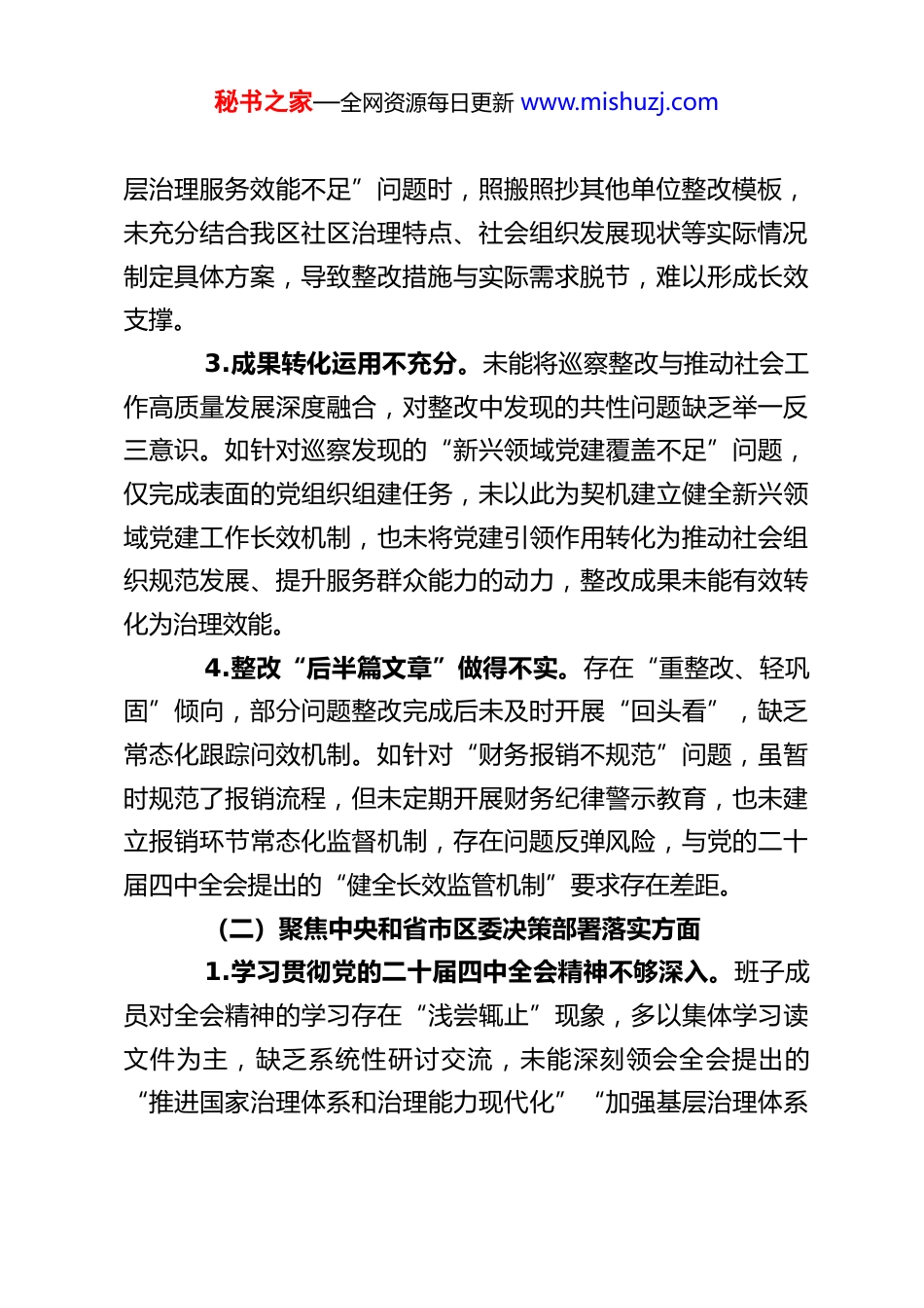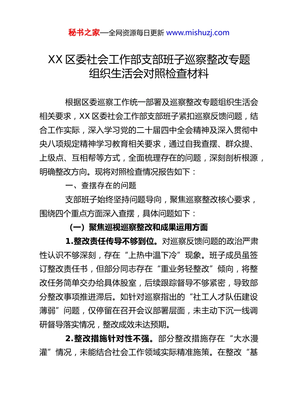 秘书之家—全网资源每日更新 www.mishuzj.comXX 区委社会工作部支部班子巡察整改专题组织生活会对照检查材料根据区委巡察工作统一部署及巡察整改专题组织生活会相关要求,XX 区委社会工作部支部班子紧扣巡察反馈问题,结合工作实际,深入学习党的二十届四中全会精神及深入贯彻中央八项规定精神学习教育相关要求,通过自我查摆、群众提、上级点、互相帮等方式,全面梳理存在的问题,深刻剖析根源,明确整改方向。现将对照检查情况报告如下:一、查摆存在的问题支部班子始终坚持问题导向,聚焦巡察整改核心要求,围绕四个重点方面深入查摆,具体问题如下:(一)聚焦巡视巡察整改和成果运用方面1.整改责任传导不够到位。对巡察反馈问题的政治严肃性认识不够深刻,存在“上热中温下冷”现象。班子成员虽签订整改责任书,但部分同志存在“重业务轻整改”倾向,将整改任务简单交办给具体股室,后续跟踪督导不够紧密,导致部分整改事项推进滞后。如针对巡察指出的“社工人才队伍建设薄弱”问题,仅停留在召开会议部署层面,未主动下沉一线调研督导落实情况,整改成效未达预期。2.整改措施针对性不强。部分整改措施存在“大水漫灌”情况,未能结合社会工作领域实际精准施策。在整改“基秘书之家—全网资源每日更新 www.mishuzj.com层治理服务效能不足”问题时,照搬照抄其他单位整改模板,未充分结合我区社区治理特点、社会组织发展现状等实际情况制定具体方案,导致整改措施与实际需求脱节,难以形成长效支撑。3.成果转化运用不充分。未能将巡察整改与推动社会工作高质量发展深度融合,对整改中发现的共性问题缺乏举一反三意识。如针对巡察发现的“新兴领域党建覆盖不足”问题,仅完成表面的党组织组建任务,未以此为契机建立健全新兴领域党建工作长效机制,也未将党建引领作用转化为推动社会组织规范发展、提升服务群众能力的动力,整改成果未能有效转化为治理效能。4.整改“后半篇文章”做得不实。存在“重整改、轻巩固”倾向,部分问题整改完成后未及时开展“回头看”,缺乏常态化跟踪问效机制。如针对“财务报销不规范”问题,虽暂时规范了报销流程,但未定期开展财务纪律警示教育,也未建立报销环节常态化监督机制,存在问题反弹风险,与党的二十届四中全会提出的“健全长效监管机制”要求存在差距。(二)聚焦中央和省市区委决策部署落实方面1.学习贯彻党的二十届四中全会精神不够深入。班子成员对全会精神的学习存在“浅尝辄止”现象,多以集体学习读文件为主,缺乏系统性研讨交流,未能深刻领会全会提出的“推进国家治理体系和治理能力现代化”“加强基层治理体系秘书之家—全网资源每日更新 www.mishuzj.com和治理能力建设”等核心要求与社会工作的内在联系。在实际工作中,未能将全会精神充分融入基层政权建设、社区治理创新等重点工作,导致工作谋划缺乏前瞻性、针对性。2.落实上级决策部署存在“温差”。对中央和省市区委关于社会工作的决策部署,如“加强社工人才队伍建设”“推动志愿服务常态化”等要求,存在执行不及时、落实不到位情况。部分工作停留在“开会部署、发文要求”层面,缺乏后续跟踪问效。如推进“一社区一社工站”建设时,因前期调研不充分、资源整合不到位,导致部分站点建成后服务内容单一,未能充分发挥专业服务作用,与上级“提升基层服务效能”的要求存在差距。3.服务大局能力有待提升。围绕区委中心工作谋划社会工作不够紧密,在统筹推进乡村振兴、基层治理现代化等重点工作中,未能充分发挥社会工作“链接资源、专业服务、协调关系”的优势。如在乡村振兴工作中,仅简单开展走访慰问活动,未结合农村实际需求培育本土社工人才、发展农村社会组织,未能形成专业化、常态化的帮扶机制,服务大局的主动性和实效性不足。4.创新意识和攻坚能力不足。面对社会工作发展中的新问题、新挑战,如新兴领域社会组织监管难、社工服务市场化程度低等,缺乏突破性思维和有效解决办法。习惯于按部就班开展工作,对数字化赋能社工服务、培育特色社工服务品牌等秘书之家—全网资源每日更新 www.mishuzj.com创新工作探索不够。在推进“两新”组织党建与业务融合时...