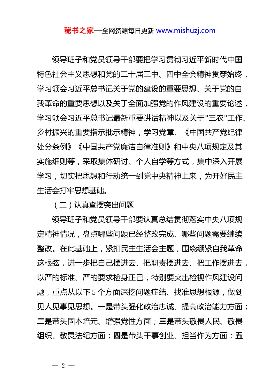 秘书之家—全网资源每日更新 www.mishuzj.comXX 乡镇 2025 年度党员领导干部民主生活会实施方案(精品)为深入贯彻落实中共 XX 县纪委机关、中共 XX 县委组织部《关于开好 2025 年度党员领导干部民主生活会的通知》要求,XX 乡镇党委将于近期召开 2025 年度民主生活会。为做好民主生活会各项准备工作,特制订如下方案。一、会议主题认真开好 2025 年度民主生活会,是深入学习贯彻党的二十届三中、四中全会精神、巩固拓展深入贯彻中央八项规定精神学习教育成果的重要举措。本次民主生活会主题是:深入学习贯彻习近平新时代中国特色社会主义思想,全面贯彻落实党的二十届三中、四中全会精神,深入贯彻落实习近平总书记重要讲话和重要指示批示精神,以打攻坚战、持久战的决心和恒心,锲而不舍落实中央八项规定精神,推进作风建设常态化长效化,以优良作风凝心聚力、真抓实干,聚焦高质量发展首要任务,扎实推进中国式现代化,为实现"十五五"良好开局奠定坚实基础。二、会前准备(一)深入开展理论学习— 1 —秘书之家—全网资源每日更新 www.mishuzj.com领导班子和党员领导干部要把学习贯彻习近平新时代中国特色社会主义思想和党的二十届三中、四中全会精神贯穿始终,学习领会习近平总书记关于党的建设的重要思想、关于党的自我革命的重要思想以及关于全面加强党的作风建设的重要论述,学习领会习近平总书记最新重要讲话精神以及关于"三农"工作、乡村振兴的重要指示批示精神,学习党章、《中国共产党纪律处分条例》《中国共产党廉洁自律准则》和中央八项规定及其实施细则等,采取集体研讨、个人自学等方式,集中深入开展学习,切实把思想和行动统一到党中央精神上来,为开好民主生活会打牢思想基础。(二)认真查摆突出问题领导班子和党员领导干部要认真总结贯彻落实中央八项规定精神情况,盘点哪些问题已经整改完成、哪些问题需要继续整改。在此基础上,紧扣民主生活会主题,围绕绷紧自我革命这根弦,进一步把自己摆进去、把职责摆进去、把工作摆进去,以严的标准、严的要求检身正己,特别要突出检视作风建设问题,重点从以下 5 个方面深挖问题症结、找准思想根源,做到见人见事见思想。一是带头强化政治忠诚、提高政治能力方面;二是带头固本培元、增强党性方面;三是带头敬畏人民、敬畏组织、敬畏法纪方面;四是带头干事创业、担当作为方面;五— 2 —秘书之家—全网资源每日更新 www.mishuzj.com是带头坚决扛起管党治党责任方面。要针对查摆问题逐一明确整改方向,既解决个性问题,又解决共性问题,有针对性地建章立制,坚决防止类似问题再次发生。(三)广泛征求意见建议,深入开展谈心谈话乡镇领导班子要坚持发扬民主、开门纳谏,采取发放征求意见表、座谈交流等方式,围绕民主生活会主题、要求重点查摆的问题等,广泛征求党员、干部和基层群众意见建议;同时,主要负责同志与班子成员之间、班子成员相互之间要进行谈心谈话,谈心谈话要一对一、面对面,既谈收获体会又谈差距不足,既谈自身缺点又谈对方问题,达到加深共识、增进团结目的。(四)认真撰写对照检查材料和个人发言提纲在前期认真组织学习、谈心谈话的基础上,主要负责同志要主持研究起草领导班子对照检查材料,带头动手撰写个人对照检查材料和个人发言材料,并审阅把关班子成员个人发言提纲。要逐项对照 5 个方面、逐条查找、逐项梳理,找准查实存在的突出问题,深入进行党性分析,深刻挖掘问题根源,有针对性地制定整改措施。要直奔主题,不搞官样文章,不硬性纠结于字数。(五)认真开展批评与自我批评— 3 —秘书之家—全网资源每日更新 www.mishuzj.com班子成员要发扬自我革命精神,严肃认真开展批评与自我批评,打扫政治灰尘,净化政治灵魂,达到坚持真理、修正错误、增进团结的目的。(六)做好情况通报及报告民主生活会上,主要负责同志要对上年度查摆问题和整改落实情况进行通报,对群众反映、巡视巡察反馈、组织约谈函询、个人需报告的重大事项和有关问题逐项作出说明,受到谈话函询且存在违纪问题的要作出检讨,受到问责的要作出深刻检查。如无以上情形的,要作出零报告。...