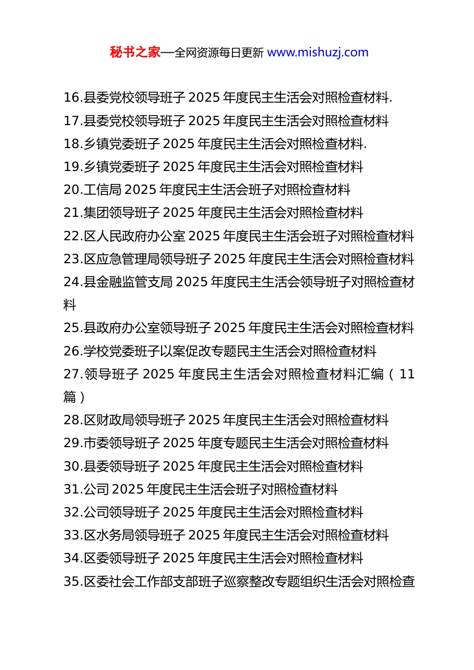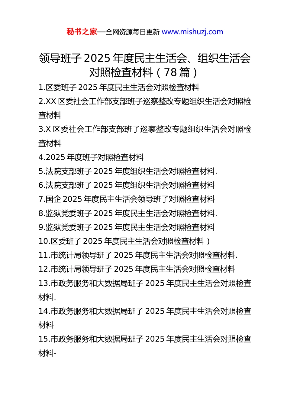 秘书之家—全网资源每日更新 www.mishuzj.com领导班子 2025 年度民主生活会、组织生活会对照检查材料(78 篇)1.区委班子 2025 年度民主生活会对照检查材料2.XX 区委社会工作部支部班子巡察整改专题组织生活会对照检查材料3.X 区委社会工作部支部班子巡察整改专题组织生活会对照检查材料4.2025 年度班子对照检查材料5.法院支部班子 2025 年度组织生活会对照检查材料.6.法院支部班子 2025 年度组织生活会对照检查材料7.国企 2025 年度民主生活会领导班子对照检查材料8.监狱党委班子 2025 年度民主生活会对照检查材料.9.监狱党委班子 2025 年度民主生活会对照检查材料10.区委班子 2025 年度民主生活会对照检查材料)11.市统计局领导班子 2025 年度民主生活会对照检查材料.12.市统计局领导班子 2025 年度民主生活会对照检查材料13.市政务服务和大数据局班子 2025 年度民主生活会对照检查材料.14.市政务服务和大数据局班子 2025 年度民主生活会对照检查材料15.市政务服务和大数据局班子 2025 年度民主生活会对照检查材料-秘书之家—全网资源每日更新 www.mishuzj.com16.县委党校领导班子 2025 年度民主生活会对照检查材料.17.县委党校领导班子 2025 年度民主生活会对照检查材料18.乡镇党委班子 2025 年度民主生活会对照检查材料.19.乡镇党委班子 2025 年度民主生活会对照检查材料20.工信局 2025 年度民主生活会班子对照检查材料21.集团领导班子 2025 年度民主生活会对照检查材料22.区人民政府办公室 2025 年度民主生活会班子对照检查材料23.区应急管理局领导班子 2025 年度民主生活会对照检查材料24.县金融监管支局 2025 年度民主生活会领导班子对照检查材料25.县政府办公室领导班子 2025 年度民主生活会对照检查材料26.学校党委班子以案促改专题民主生活会对照检查材料27.领导班子 2025 年度民主生活会对照检查材料汇编(11篇)28.区财政局领导班子 2025 年度民主生活会对照检查材料29.市委领导班子 2025 年度专题民主生活会对照检查材料30.县委领导班子 2025 年度民主生活会对照检查材料31.公司 2025 年度民主生活会班子对照检查材料32.公司领导班子 2025 年度民主生活会对照检查材料33.区水务局领导班子 2025 年度民主生活会对照检查材料34.区委领导班子 2025 年度民主生活会对照检查材料35.区委社会工作部支部班子巡察整改专题组织生活会对照检查秘书之家—全网资源每日更新 www.mishuzj.com材料36.市第一中学党委 2025 年度民主生活会班子对照检查材料37.市委 2025 年度民主生活会领导班子对照检查材料38.市文化馆领导班子 2025 年度民主生活会对照检查材料39.学校党委领导班子 2025 年度民主生活会对照检查材料40.医院党委领导班子 2025 年度民主生活会对照检查材料41.医院党委领导班子 2025 年度民主生活会对照检查材料42.镇党委班子 2025 年度民主生活会“五个带头”对照检查发言43.职业技术学院党委领导班子 2025 年度民主生活会对照检查材料44.2025 年度宣传部领导班子对照检查材料45.办公室领导班子 2025 年民主生活会对照检查材料46.公司领导班子 2025 年度民主生活会对照检查材料47.领导班子 2025 年度民主生活会对照检查材料(5 个带头)48.市工信局领导班子 2025 年度民主生活会对照检查材料49.市人大常委会党组领导班子 2025 年度民主生活会对照检查材料50.市审计局领导班子 2025 年度民主生活会对照检查材料51.县委组织部领导班子 2025 年度民主生活会对照检查材料52.XX 市中医医院党委领导班子 2025 年度民主生活会对照检查材料秘书之家—全网资源每日更新 www.mishuzj.com53.局党组领导班子 2025 年专题民主生活会对照检查材料汇编(8 篇)54.领导班子 2025 年度民主生活会对照检查材料55.领导班子 2025 年度民主生活会对照检查材料56.领导班子 2025 年专题民主生活会对照检查材料汇编(3篇)(集团公司)57.区文联党组 2025 年度民主生活会班子对照检查材料58.人大领导班子 2025 年度民主生活会对照检查材料59.县委领导班子 2025 年专...