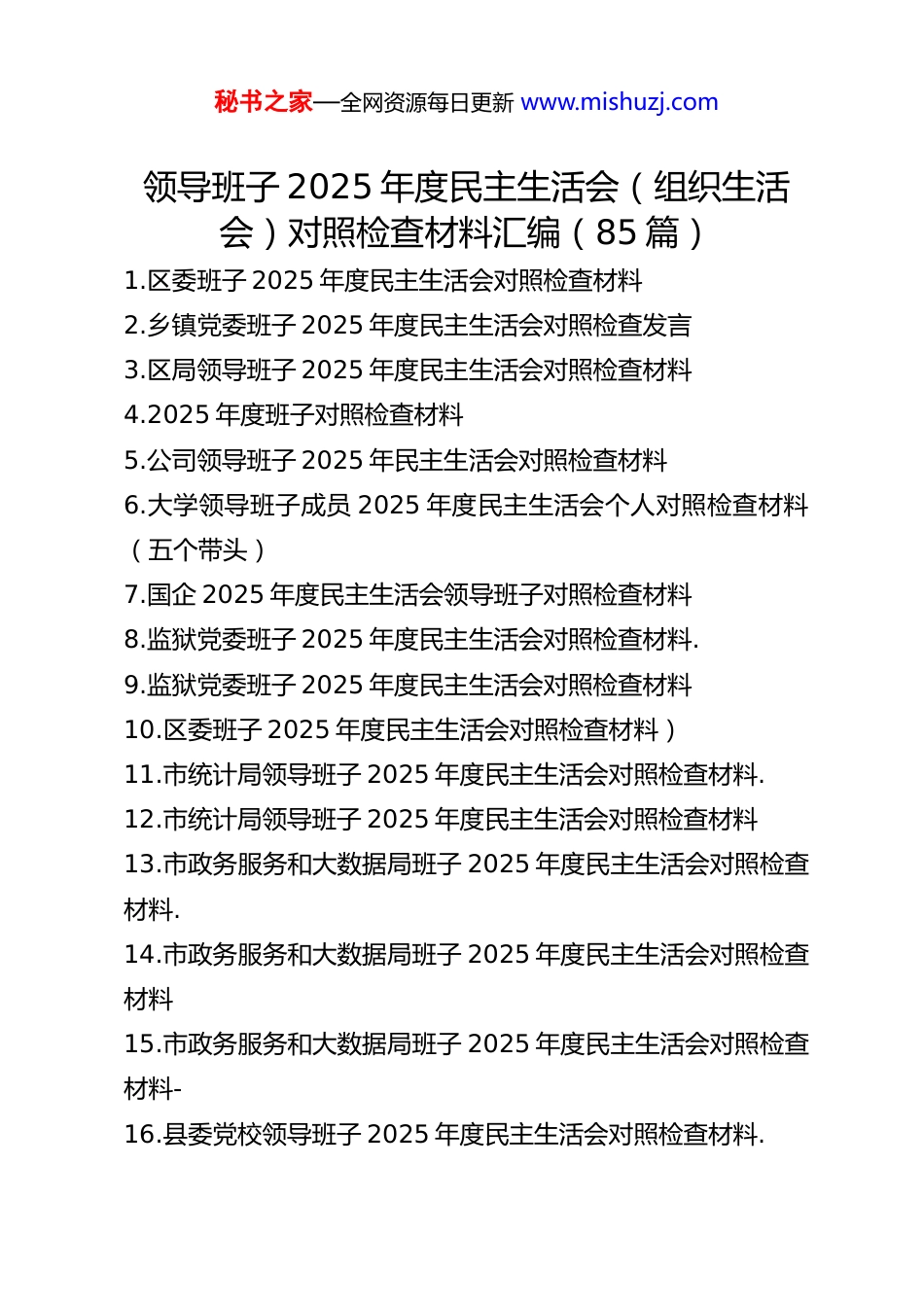 秘书之家—全网资源每日更新 www.mishuzj.com领导班子 2025 年度民主生活会(组织生活会)对照检查材料汇编(85 篇)1.区委班子 2025 年度民主生活会对照检查材料2.乡镇党委班子 2025 年度民主生活会对照检查发言3.区局领导班子 2025 年度民主生活会对照检查材料4.2025 年度班子对照检查材料5.公司领导班子 2025 年民主生活会对照检查材料6.大学领导班子成员 2025 年度民主生活会个人对照检查材料(五个带头)7.国企 2025 年度民主生活会领导班子对照检查材料8.监狱党委班子 2025 年度民主生活会对照检查材料.9.监狱党委班子 2025 年度民主生活会对照检查材料10.区委班子 2025 年度民主生活会对照检查材料)11.市统计局领导班子 2025 年度民主生活会对照检查材料.12.市统计局领导班子 2025 年度民主生活会对照检查材料13.市政务服务和大数据局班子 2025 年度民主生活会对照检查材料.14.市政务服务和大数据局班子 2025 年度民主生活会对照检查材料15.市政务服务和大数据局班子 2025 年度民主生活会对照检查材料-16.县委党校领导班子 2025 年度民主生活会对照检查材料.秘书之家—全网资源每日更新 www.mishuzj.com17.县委党校领导班子 2025 年度民主生活会对照检查材料18.乡镇党委班子 2025 年度民主生活会对照检查材料.19.乡镇党委班子 2025 年度民主生活会对照检查材料20.工信局 2025 年度民主生活会班子对照检查材料21.集团领导班子 2025 年度民主生活会对照检查材料22.区人民政府办公室 2025 年度民主生活会班子对照检查材料23.区应急管理局领导班子 2025 年度民主生活会对照检查材料24.县金融监管支局 2025 年度民主生活会领导班子对照检查材料25.县政府办公室领导班子 2025 年度民主生活会对照检查材料26.学校党委班子以案促改专题民主生活会对照检查材料27.领导班子 2025 年度民主生活会对照检查材料汇编(11篇)28.区财政局领导班子 2025 年度民主生活会对照检查材料29.市委领导班子 2025 年度专题民主生活会对照检查材料30.县委领导班子 2025 年度民主生活会对照检查材料31.公司 2025 年度民主生活会班子对照检查材料32.公司领导班子 2025 年度民主生活会对照检查材料33.区水务局领导班子 2025 年度民主生活会对照检查材料34.区委领导班子 2025 年度民主生活会对照检查材料35.区委社会工作部支部班子巡察整改专题组织生活会对照检查材料秘书之家—全网资源每日更新 www.mishuzj.com36.市第一中学党委 2025 年度民主生活会班子对照检查材料37.市委 2025 年度民主生活会领导班子对照检查材料38.市文化馆领导班子 2025 年度民主生活会对照检查材料39.学校党委领导班子 2025 年度民主生活会对照检查材料40.医院党委领导班子 2025 年度民主生活会对照检查材料41.医院党委领导班子 2025 年度民主生活会对照检查材料42.镇党委班子 2025 年度民主生活会“五个带头”对照检查发言43.职业技术学院党委领导班子 2025 年度民主生活会对照检查材料44.2025 年度宣传部领导班子对照检查材料45.办公室领导班子 2025 年民主生活会对照检查材料46.公司领导班子 2025 年度民主生活会对照检查材料47.领导班子 2025 年度民主生活会对照检查材料(5 个带头)48.市工信局领导班子 2025 年度民主生活会对照检查材料49.市人大常委会党组领导班子 2025 年度民主生活会对照检查材料50.市审计局领导班子 2025 年度民主生活会对照检查材料51.县委组织部领导班子 2025 年度民主生活会对照检查材料52.XX 市中医医院党委领导班子 2025 年度民主生活会对照检查材料53.局党组领导班子 2025 年专题民主生活会对照检查材料汇编秘书之家—全网资源每日更新 www.mishuzj.com(8 篇)54.领导班子 2025 年度民主生活会对照检查材料55.领导班子 2025 年度民主生活会对照检查材料56.领导班子 2025 年专题民主生活会对照检查材料汇编(3篇)(集团公司)57.区文联党组 2025 年度民主生活会班子对照检查材料58.人大领导班子 2025 年度民主生活会对照检查材料59.县委领导班子 2025 年专题民...