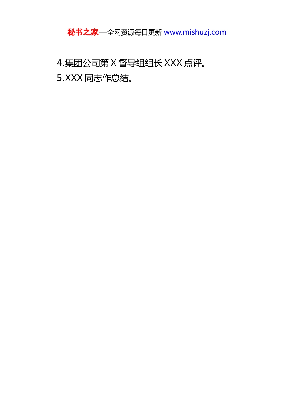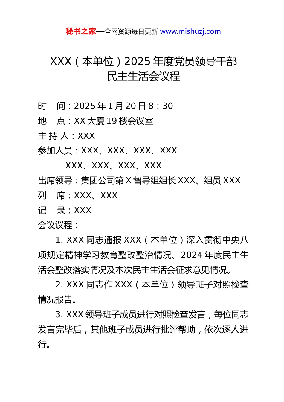 秘书之家—全网资源每日更新 www.mishuzj.comXXX(本单位)2025 年度党员领导干部民主生活会议程时 间:2025 年 1 月 20 日 8:30地 点:XX 大厦 19 楼会议室主 持 人:XXX参加人员:XXX、XXX、XXX、XXX XXX、XXX、XXX、XXX出席领导:集团公司第 X 督导组组长 XXX、组员 XXX列 席:XXX、XXX记 录:XXX会议议程:1. XXX 同志通报 XXX(本单位)深入贯彻中央八项规定精神学习教育整改整治情况、2024 年度民主生活会整改落实情况及本次民主生活会征求意见情况。2. XXX 同志作 XXX(本单位)领导班子对照检查情况报告。3. XXX 领导班子成员进行对照检查发言,每位同志发言完毕后,其他班子成员进行批评帮助,依次逐人进行。秘书之家—全网资源每日更新 www.mishuzj.com4.集团公司第 X 督导组组长 XXX 点评。5.XXX 同志作总结。