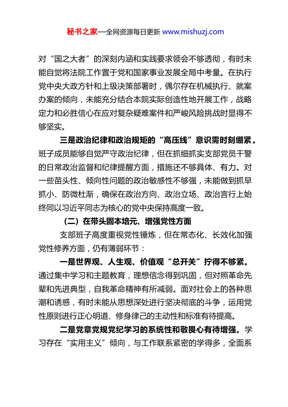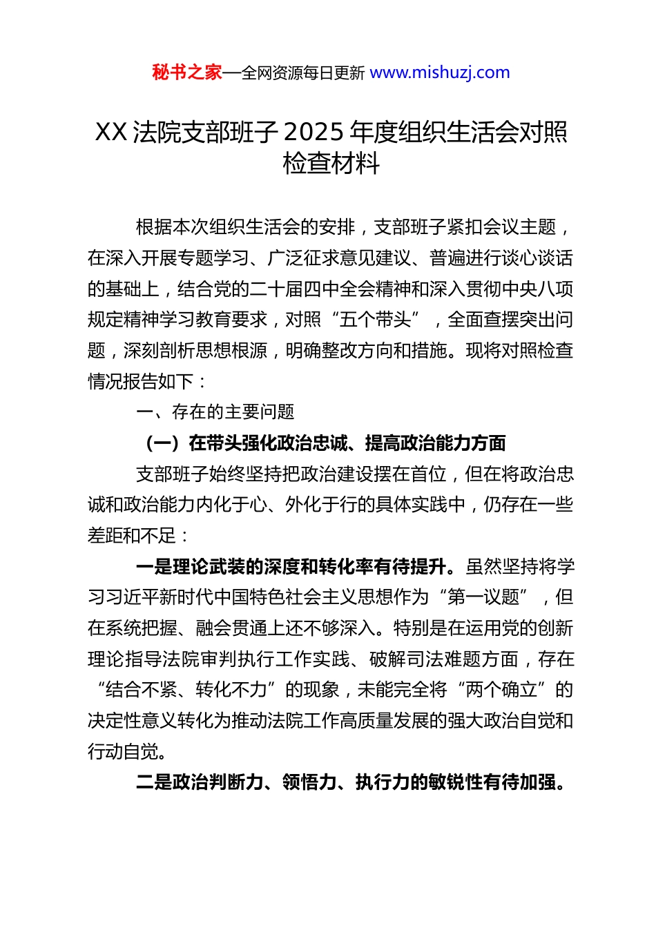 秘书之家—全网资源每日更新 www.mishuzj.comXX 法院支部班子 2025 年度组织生活会对照检查材料根据本次组织生活会的安排,支部班子紧扣会议主题,在深入开展专题学习、广泛征求意见建议、普遍进行谈心谈话的基础上,结合党的二十届四中全会精神和深入贯彻中央八项规定精神学习教育要求,对照“五个带头”,全面查摆突出问题,深刻剖析思想根源,明确整改方向和措施。现将对照检查情况报告如下:一、存在的主要问题(一)在带头强化政治忠诚、提高政治能力方面支部班子始终坚持把政治建设摆在首位,但在将政治忠诚和政治能力内化于心、外化于行的具体实践中,仍存在一些差距和不足:一是理论武装的深度和转化率有待提升。虽然坚持将学习习近平新时代中国特色社会主义思想作为“第一议题”,但在系统把握、融会贯通上还不够深入。特别是在运用党的创新理论指导法院审判执行工作实践、破解司法难题方面,存在“结合不紧、转化不力”的现象,未能完全将“两个确立”的决定性意义转化为推动法院工作高质量发展的强大政治自觉和行动自觉。二是政治判断力、领悟力、执行力的敏锐性有待加强。秘书之家—全网资源每日更新 www.mishuzj.com对“国之大者”的深刻内涵和实践要求领会不够透彻,有时未能自觉将法院工作置于党和国家事业发展全局中考量。在执行党中央大政方针和上级决策部署时,偶尔存在机械执行、就案办案的倾向,未能充分结合本院实际创造性地开展工作,战略定力和必胜信心在应对复杂疑难案件和严峻风险挑战时显得不够坚实。三是政治纪律和政治规矩的“高压线”意识需时刻绷紧。班子成员能够自觉严守政治纪律,但在抓细抓实支部党员干警的日常政治监督和纪律提醒方面,措施还不够具体、有力。对一些苗头性、倾向性问题的政治敏感性不够强,未能做到抓早抓小、防微杜渐,确保在政治方向、政治立场、政治言行上始终同以习近平同志为核心的党中央保持高度一致。(二)在带头固本培元、增强党性方面支部班子高度重视党性锤炼,但在常态化、长效化加强党性修养方面,仍有薄弱环节:一是世界观、人生观、价值观“总开关”拧得不够紧。通过集中学习和主题教育,理想信念得到巩固,但对照革命先辈和先进典型,自我革命精神有所减弱。面对社会上的各种思潮和诱惑,有时未能从思想深处进行坚决彻底的斗争,运用党性原则进行正心明道、修身律己的主动性和标准有待提高。二是党章党规党纪学习的系统性和敬畏心有待增强。学习存在“实用主义”倾向,与工作联系紧密的学得多,全面系秘书之家—全网资源每日更新 www.mishuzj.com统、原原本本研学不够。对《中国共产党纪律处分条例》等党内法规的严肃性和权威性认识深刻,但在日常教育提醒中,未能完全做到使铁的纪律转化为党员干警的日常习惯和自觉遵循,用纪律规矩校准思想行为偏差的精度不足。三是宗旨意识和为民情怀的实践载体不够丰富。虽然牢记司法为民初心,但在如何更有效地将理想信念、对党忠诚转化为“让人民群众在每一个司法案件中感受到公平正义”的具体行动上,探索创新不足。深入基层了解群众真实司法需求的频率和深度不够,运用法治思维和法治方式解决人民群众急难愁盼问题的能力有待进一步提升。(三)在带头敬畏人民、敬畏组织、敬畏法纪方面支部班子深知“三个敬畏”的重要性,但在将其转化为严格自律和规范用权的具体行为上,仍有改进空间:一是践行新时代党的群众路线的深度有待拓展。落实“四下基层”制度有时停留于完成调研任务,未能完全沉下去倾听群众心声、解决实际问题。对保障和改善民生相关的案件(如劳动争议、物业纠纷、消费者权益保护等),虽然在法律框架内公正处理,但对其背后深层次的社会矛盾和群众情感体察不够细腻,办案的政治效果、社会效果、法律效果有机统一有待加强。二是贯彻民主集中制的质量和规范性有待提高。支部班子议事决策能够遵循规则,但在会前充分酝酿、会上充分发扬秘书之家—全网资源每日更新 www.mishuzj.com民主方面,有时议题准备不够充分,讨论未能完全深入。班子成员在分管领域内勇于负责、大胆工作,但在涉及全局性、交叉性工作时,主动沟通协调、凝聚共识的意识需要增强,...