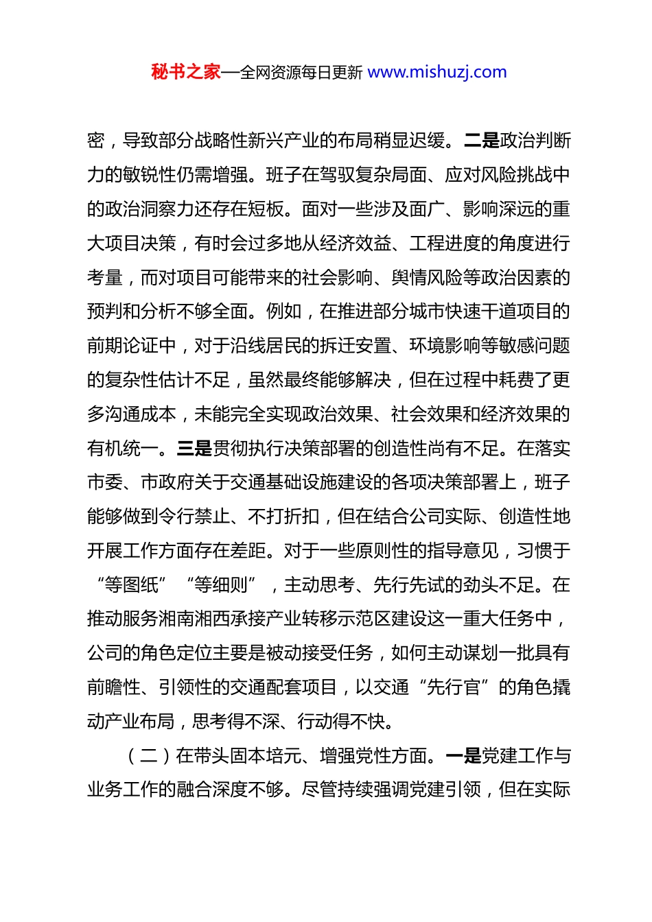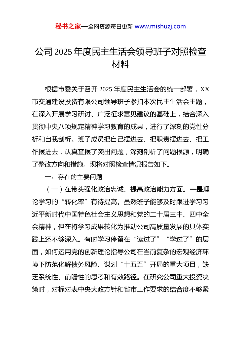 秘书之家—全网资源每日更新 www.mishuzj.com公司 2025 年度民主生活会领导班子对照检查材料 根据市委关于召开 2025 年度民主生活会的统一部署,XX市交通建设投资有限公司领导班子紧扣本次民主生活会主题,在深入开展学习研讨、广泛征求意见建议的基础上,结合深入贯彻中央八项规定精神学习教育的成果,进行了深刻的党性分析和自我剖析。班子成员把自己摆进去、把职责摆进去、把工作摆进去,认真查摆了突出问题,深刻剖析了问题根源,明确了整改方向和措施。现将对照检查情况报告如下。一、存在的主要问题(一)在带头强化政治忠诚、提高政治能力方面。一是理论学习的“转化率”有待提高。虽然班子能够及时跟进学习习近平新时代中国特色社会主义思想和党的二十届三中、四中全会精神,但在将学习成果转化为推动公司高质量发展的具体实践上还不够深入。有时学习停留在“读过了”“学过了”的层面,如何运用党的创新理论指导公司在当前复杂的宏观经济环境下防范化解债务风险、谋划“十五五”开局的重大项目,缺乏系统性、前瞻性的思考和有效路径。在研究公司重大投资决策时,对标对表中央大政方针和省市工作要求的结合度不够紧秘书之家—全网资源每日更新 www.mishuzj.com密,导致部分战略性新兴产业的布局稍显迟缓。二是政治判断力的敏锐性仍需增强。班子在驾驭复杂局面、应对风险挑战中的政治洞察力还存在短板。面对一些涉及面广、影响深远的重大项目决策,有时会过多地从经济效益、工程进度的角度进行考量,而对项目可能带来的社会影响、舆情风险等政治因素的预判和分析不够全面。例如,在推进部分城市快速干道项目的前期论证中,对于沿线居民的拆迁安置、环境影响等敏感问题的复杂性估计不足,虽然最终能够解决,但在过程中耗费了更多沟通成本,未能完全实现政治效果、社会效果和经济效果的有机统一。三是贯彻执行决策部署的创造性尚有不足。在落实市委、市政府关于交通基础设施建设的各项决策部署上,班子能够做到令行禁止、不打折扣,但在结合公司实际、创造性地开展工作方面存在差距。对于一些原则性的指导意见,习惯于“等图纸”“等细则”,主动思考、先行先试的劲头不足。在推动服务湘南湘西承接产业转移示范区建设这一重大任务中,公司的角色定位主要是被动接受任务,如何主动谋划一批具有前瞻性、引领性的交通配套项目,以交通“先行官”的角色撬动产业布局,思考得不深、行动得不快。(二)在带头固本培元、增强党性方面。一是党建工作与业务工作的融合深度不够。尽管持续强调党建引领,但在实际秘书之家—全网资源每日更新 www.mishuzj.com操作中,“两张皮”的现象依然存在。党建活动与破解项目建设难题、推动公司改革发展的结合点找得不准。例如,在推进北三环等重点项目建设过程中,虽然成立了党员突击队,但如何发挥党支部战斗堡垒作用,系统性地协调解决跨部门、跨区域的征地拆迁、管线迁移等“硬骨头”问题,机制尚不健全,导致党建工作的成效未能最大化地体现在项目进度和质量上。二是运用批评和自我批评武器不够有力。在民主生活会或组织生活会上,班子成员之间开展相互批评时,有时还存在“你好我好大家好”的思想,多是提出工作建议,缺少一些“红脸出汗”的辣味。在剖析一些项目进度滞后或成本超支的问题时,往往对客观因素如政策变化、市场波动等分析得比较多,而对于班子自身在决策、管理、监督等方面的主观责任,深挖细究、坦诚亮丑的勇气还不足。三是党性锤炼的日常自觉性有待加强。班子成员能够积极参加集中学习和专题教育,但在“八小时之外”的自我净化、自我完善上有所放松。对一些社会上的不良风气和错误思潮,缺乏旗帜鲜明地抵制和斗争。在学习贯彻党章党规党纪方面,有时满足于通读一遍,未能真正做到逐条逐句深入领会、内化于心,用党性原则约束言行的“防火墙”筑得还不够牢固。(三)在带头敬畏人民、敬畏组织、敬畏法纪方面。一是秘书之家—全网资源每日更新 www.mishuzj.com践行群众路线的方式方法不够鲜活。班子成员虽然也开展基层调研,但“下”的次数多,“沉”的时间少,真正深入项目一线、深入群众家中倾听真实声音、解决实际...