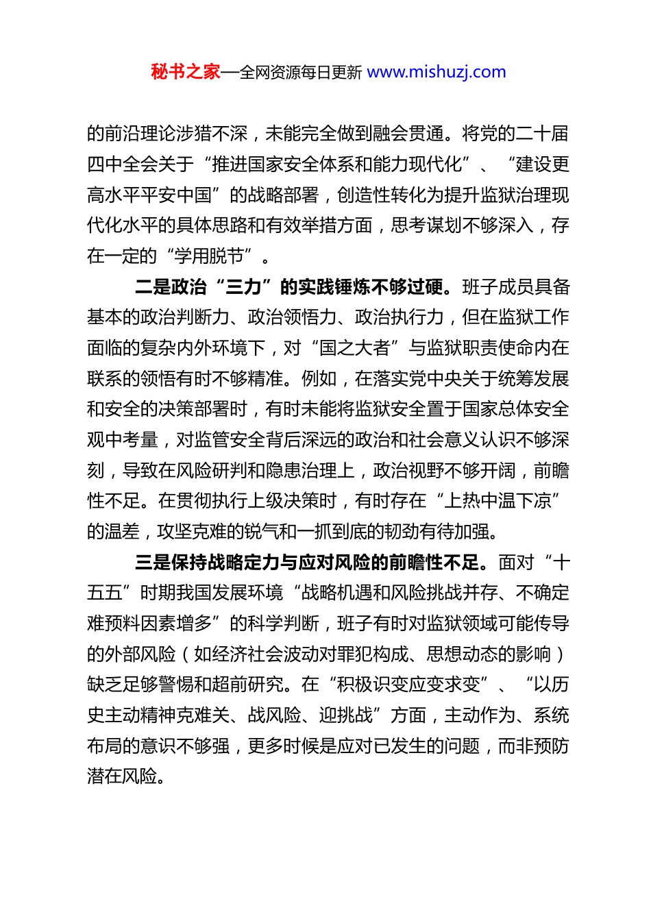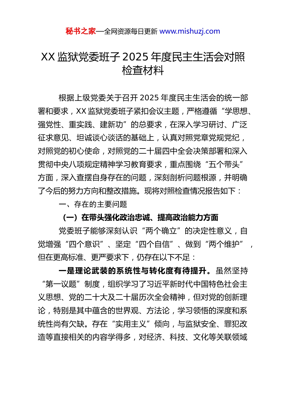 秘书之家—全网资源每日更新 www.mishuzj.comXX 监狱党委班子 2025 年度民主生活会对照检查材料根据上级党委关于召开 2025 年度民主生活会的统一部署和要求,XX 监狱党委班子紧扣会议主题,严格遵循“学思想、强党性、重实践、建新功”的总要求,在深入学习研讨、广泛征求意见、坦诚谈心谈话的基础上,认真对照党章党规党纪,对照党的初心使命,对照党的二十届四中全会决策部署和深入贯彻中央八项规定精神学习教育要求,重点围绕“五个带头”方面,深入查摆自身存在的问题,深刻剖析问题根源,并明确了今后的努力方向和整改措施。现将对照检查情况报告如下:一、存在的主要问题(一)在带头强化政治忠诚、提高政治能力方面党委班子能够深刻认识“两个确立”的决定性意义,自觉增强“四个意识”、坚定“四个自信”、做到“两个维护”,但在更高标准、更严要求下,仍存在以下不足:一是理论武装的系统性与转化度有待提升。虽然坚持“第一议题”制度,组织学习了习近平新时代中国特色社会主义思想、党的二十大及二十届历次全会精神,但对党的创新理论,特别是其中蕴含的世界观、方法论,学习领悟的深度和系统性尚有欠缺。存在“实用主义”倾向,与监狱安全、罪犯改造等直接相关的内容学得多,对经济、科技、文化等关联领域秘书之家—全网资源每日更新 www.mishuzj.com的前沿理论涉猎不深,未能完全做到融会贯通。将党的二十届四中全会关于“推进国家安全体系和能力现代化”、“建设更高水平平安中国”的战略部署,创造性转化为提升监狱治理现代化水平的具体思路和有效举措方面,思考谋划不够深入,存在一定的“学用脱节”。二是政治“三力”的实践锤炼不够过硬。班子成员具备基本的政治判断力、政治领悟力、政治执行力,但在监狱工作面临的复杂内外环境下,对“国之大者”与监狱职责使命内在联系的领悟有时不够精准。例如,在落实党中央关于统筹发展和安全的决策部署时,有时未能将监狱安全置于国家总体安全观中考量,对监管安全背后深远的政治和社会意义认识不够深刻,导致在风险研判和隐患治理上,政治视野不够开阔,前瞻性不足。在贯彻执行上级决策时,有时存在“上热中温下凉”的温差,攻坚克难的锐气和一抓到底的韧劲有待加强。三是保持战略定力与应对风险的前瞻性不足。面对“十五五”时期我国发展环境“战略机遇和风险挑战并存、不确定难预料因素增多”的科学判断,班子有时对监狱领域可能传导的外部风险(如经济社会波动对罪犯构成、思想动态的影响)缺乏足够警惕和超前研究。在“积极识变应变求变”、“以历史主动精神克难关、战风险、迎挑战”方面,主动作为、系统布局的意识不够强,更多时候是应对已发生的问题,而非预防潜在风险。秘书之家—全网资源每日更新 www.mishuzj.com(二)在带头固本培元、增强党性方面班子注重党性修养,但对照“解决好世界观、人生观、价值观总开关问题”的高标准,仍有差距:一是党性修养的常态化锤炼抓得不紧。存在“重业务、轻党性”的倾向,将大量精力投入监管安全、生产运营等具体事务,对主观世界的改造有所放松。党内政治生活的“炉火”温度不够高,在民主生活会、组织生活会上,运用批评和自我批评武器有时“辣味”不足,以工作建议代替思想交锋,未能真正触及灵魂、涤荡思想。二是理想信念教育的渗透力感染力不强。对班子成员和党员干部的理想信念教育,多依赖于集中学习、专题党课等传统形式,在日常管理和监督中融入理想信念考核与引导不够。面对多元社会思潮,教育引导干警队伍始终保持坚定政治立场、恪守法治精神、甘于奉献牺牲的方式方法不够鲜活有效,运用党的创新理论主动辨析、抵制错误观念的能力有待提升。三是纪律规矩内化于心、外化于行的自觉性有差距。虽然组织学习了党章党规党纪,但部分同志存在“学归学、做归做”的现象。对照中央八项规定精神及实施细则,对一些“小节”、“小事”不够警惕,认为监狱环境相对封闭,社会关注度低,自我要求有所松动。例如,在规范公务接待、节约办公资源等方面,未能时时处处以最高标准严格要求。(三)在带头敬畏人民、敬畏组织、敬畏法纪方面秘书之家—全网资源每日更新...