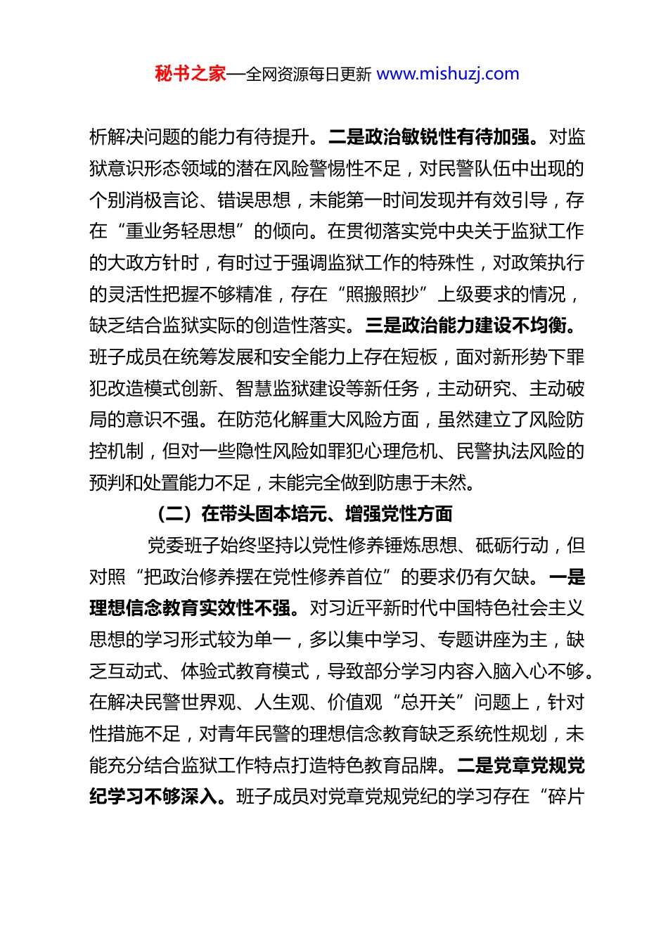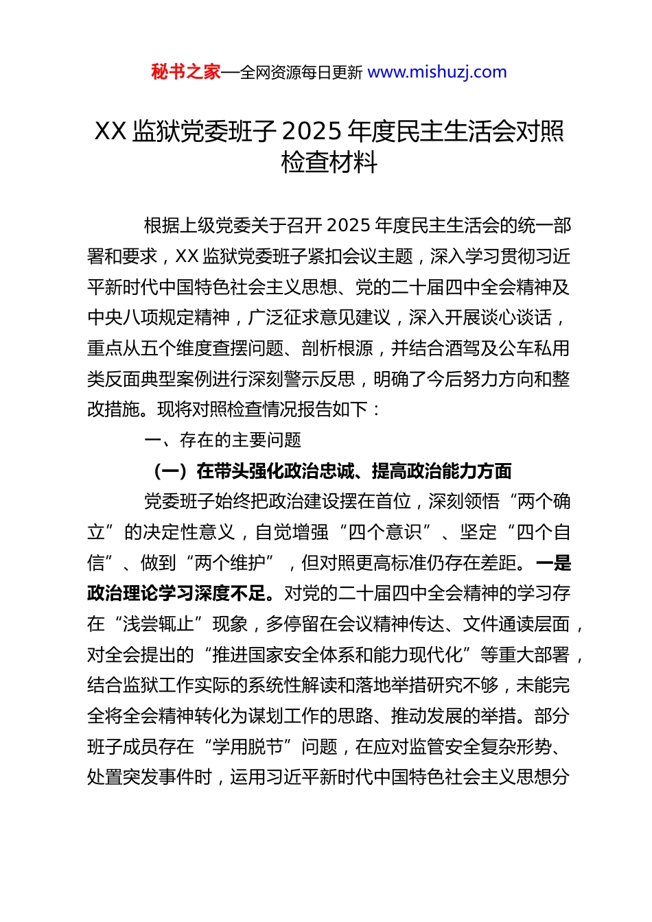 秘书之家—全网资源每日更新 www.mishuzj.comXX 监狱党委班子 2025 年度民主生活会对照检查材料根据上级党委关于召开 2025 年度民主生活会的统一部署和要求,XX 监狱党委班子紧扣会议主题,深入学习贯彻习近平新时代中国特色社会主义思想、党的二十届四中全会精神及中央八项规定精神,广泛征求意见建议,深入开展谈心谈话,重点从五个维度查摆问题、剖析根源,并结合酒驾及公车私用类反面典型案例进行深刻警示反思,明确了今后努力方向和整改措施。现将对照检查情况报告如下:一、存在的主要问题(一)在带头强化政治忠诚、提高政治能力方面党委班子始终把政治建设摆在首位,深刻领悟“两个确立”的决定性意义,自觉增强“四个意识”、坚定“四个自信”、做到“两个维护”,但对照更高标准仍存在差距。一是政治理论学习深度不足。对党的二十届四中全会精神的学习存在“浅尝辄止”现象,多停留在会议精神传达、文件通读层面,对全会提出的“推进国家安全体系和能力现代化”等重大部署,结合监狱工作实际的系统性解读和落地举措研究不够,未能完全将全会精神转化为谋划工作的思路、推动发展的举措。部分班子成员存在“学用脱节”问题,在应对监管安全复杂形势、处置突发事件时,运用习近平新时代中国特色社会主义思想分秘书之家—全网资源每日更新 www.mishuzj.com析解决问题的能力有待提升。二是政治敏锐性有待加强。对监狱意识形态领域的潜在风险警惕性不足,对民警队伍中出现的个别消极言论、错误思想,未能第一时间发现并有效引导,存在“重业务轻思想”的倾向。在贯彻落实党中央关于监狱工作的大政方针时,有时过于强调监狱工作的特殊性,对政策执行的灵活性把握不够精准,存在“照搬照抄”上级要求的情况,缺乏结合监狱实际的创造性落实。三是政治能力建设不均衡。班子成员在统筹发展和安全能力上存在短板,面对新形势下罪犯改造模式创新、智慧监狱建设等新任务,主动研究、主动破局的意识不强。在防范化解重大风险方面,虽然建立了风险防控机制,但对一些隐性风险如罪犯心理危机、民警执法风险的预判和处置能力不足,未能完全做到防患于未然。(二)在带头固本培元、增强党性方面党委班子始终坚持以党性修养锤炼思想、砥砺行动,但对照“把政治修养摆在党性修养首位”的要求仍有欠缺。一是理想信念教育实效性不强。对习近平新时代中国特色社会主义思想的学习形式较为单一,多以集中学习、专题讲座为主,缺乏互动式、体验式教育模式,导致部分学习内容入脑入心不够。在解决民警世界观、人生观、价值观“总开关”问题上,针对性措施不足,对青年民警的理想信念教育缺乏系统性规划,未能充分结合监狱工作特点打造特色教育品牌。二是党章党规党纪学习不够深入。班子成员对党章党规党纪的学习存在“碎片秘书之家—全网资源每日更新 www.mishuzj.com化”问题,对《中国共产党纪律处分条例》《中华人民共和国监狱法》等法律法规的具体条款掌握不够精准,在日常工作中运用党纪国法规范执法行为、约束自身言行的自觉性有待提升。部分班子成员在参加组织生活时,批评与自我批评不够严肃认真,存在“老好人”思想,未能真正达到“红脸出汗、排毒治病”的效果。三是党性修养锤炼不够经常。在日常工作中,班子成员更多关注业务指标完成情况,对党性修养的常态化锤炼重视不够。在面对工作压力、个人利益与集体利益冲突时,个别同志存在本位主义倾向,缺乏“功成不必在我、功成必定有我”的境界担当,党性修养的自觉性和主动性有待加强。(三)在带头敬畏人民、敬畏组织、敬畏法纪方面党委班子始终坚持以人民为中心的发展思想,严守组织纪律和法律法规,但对照“三个敬畏”的要求仍存在薄弱环节。一是践行群众路线不够扎实。落实“四下基层”制度不够到位,班子成员深入监区、深入民警职工一线调研不够频繁,存在“走马观花”现象。对民警职工反映强烈的职业发展、工作压力、生活保障等“急难愁盼”问题,解决力度和效率有待提升,如部分监区办公条件改善滞后、民警心理健康疏导机制不够健全等问题,未能及时得到有效解决,影响了队伍的凝聚力和向心力。二是民主集中制执行不够严格...