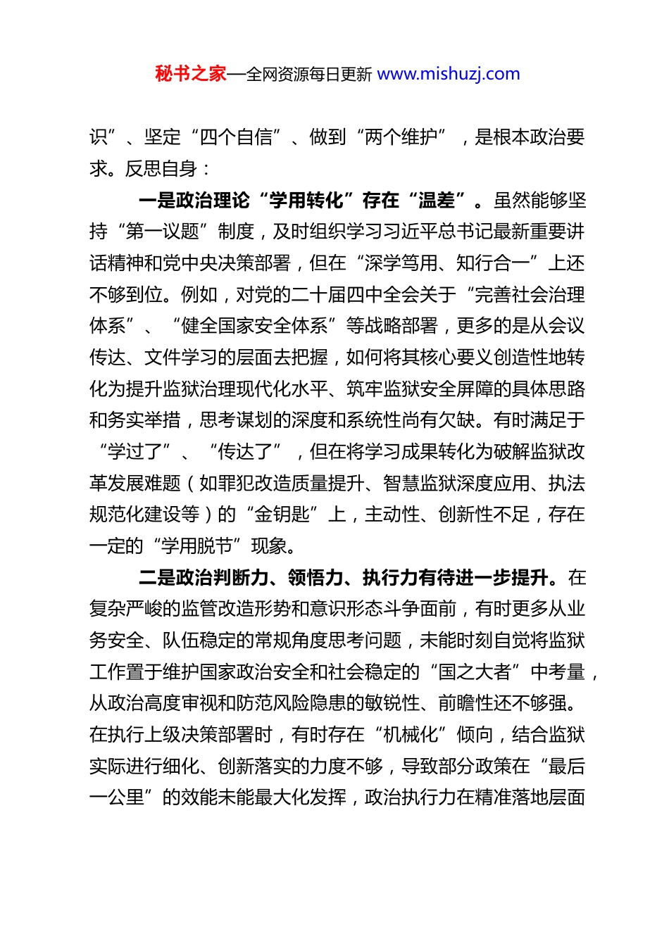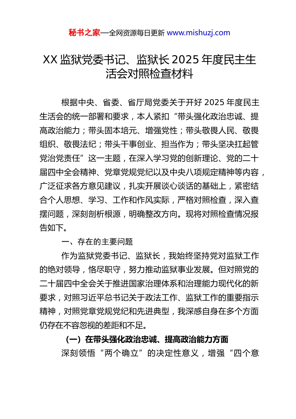 秘书之家—全网资源每日更新 www.mishuzj.comXX 监狱党委书记、监狱长 2025 年度民主生活会对照检查材料根据中央、省委、省厅局党委关于开好 2025 年度民主生活会的统一部署和要求,本人紧扣“带头强化政治忠诚、提高政治能力;带头固本培元、增强党性;带头敬畏人民、敬畏组织、敬畏法纪;带头干事创业、担当作为;带头坚决扛起管党治党责任”这一主题,在深入学习党的创新理论、党的二十届四中全会精神、党章党规党纪以及中央八项规定精神等内容,广泛征求各方意见建议,扎实开展谈心谈话的基础上,紧密结合个人思想、学习、工作和作风实际,严格对照检查,深入查摆问题,深刻剖析根源,明确整改方向。现将对照检查情况报告如下。一、存在的主要问题作为监狱党委书记、监狱长,我始终坚持党对监狱工作的绝对领导,恪尽职守,努力推动监狱事业发展。但对照党的二十届四中全会关于推进国家治理体系和治理能力现代化的新要求,对照习近平总书记关于政法工作、监狱工作的重要指示精神,对照党章党规党纪和先进典型,我深感自身在多个方面仍存在不容忽视的差距和不足。(一)在带头强化政治忠诚、提高政治能力方面深刻领悟“两个确立”的决定性意义,增强“四个意秘书之家—全网资源每日更新 www.mishuzj.com识”、坚定“四个自信”、做到“两个维护”,是根本政治要求。反思自身:一是政治理论“学用转化”存在“温差”。虽然能够坚持“第一议题”制度,及时组织学习习近平总书记最新重要讲话精神和党中央决策部署,但在“深学笃用、知行合一”上还不够到位。例如,对党的二十届四中全会关于“完善社会治理体系”、“健全国家安全体系”等战略部署,更多的是从会议传达、文件学习的层面去把握,如何将其核心要义创造性地转化为提升监狱治理现代化水平、筑牢监狱安全屏障的具体思路和务实举措,思考谋划的深度和系统性尚有欠缺。有时满足于“学过了”、“传达了”,但在将学习成果转化为破解监狱改革发展难题(如罪犯改造质量提升、智慧监狱深度应用、执法规范化建设等)的“金钥匙”上,主动性、创新性不足,存在一定的“学用脱节”现象。二是政治判断力、领悟力、执行力有待进一步提升。在复杂严峻的监管改造形势和意识形态斗争面前,有时更多从业务安全、队伍稳定的常规角度思考问题,未能时刻自觉将监狱工作置于维护国家政治安全和社会稳定的“国之大者”中考量,从政治高度审视和防范风险隐患的敏锐性、前瞻性还不够强。在执行上级决策部署时,有时存在“机械化”倾向,结合监狱实际进行细化、创新落实的力度不够,导致部分政策在“最后一公里”的效能未能最大化发挥,政治执行力在精准落地层面秘书之家—全网资源每日更新 www.mishuzj.com尚有提升空间。三是政治引领与业务融合不够紧密。在部署推进监狱中心工作时,有时将政治建设与业务工作视为“两条线”,未能完全做到同谋划、同部署、同考核,党建引领业务发展的“融合剂”作用发挥不充分。例如,在部署监管安全、教育改造、劳动生产等任务时,对其蕴含的政治属性、承载的政治责任强调不够充分,导致少数民警可能仅将其视为单纯业务工作,政治站位未能有效提升。(二)在带头固本培元、增强党性方面党性是党员干部立身、立业、立言、立德的基石。对照检查,发现:一是党性锻炼的主动性、经常性有欠缺。能够参加组织的各项学习教育活动,但在主动、自觉地将党性修养融入日常工作生活“全天候”方面做得不够。有时以事务性工作繁忙为由,放松了对主观世界的持续改造,运用党性原则进行自我检视、自我净化、自我提高的“内驱力”有所减弱。对照党章党规党纪进行“政治体检”的频率和深度不足,未能真正做到“吾日三省吾身”。二是理想信念教育的穿透力、感染力有待加强。作为党委书记,在抓全狱党员民警理想信念教育方面,方式方法有时偏向传统,与新时代民警思想特点结合不够紧密。虽然安排了理论学习、党课报告,但在如何运用红色资源、反面典型案例、秘书之家—全网资源每日更新 www.mishuzj.com身边先进事迹等开展沉浸式、互动式教育,真正触及灵魂、解决世界观、人生观、价值观“总开关”问题上,创新手段不多,...