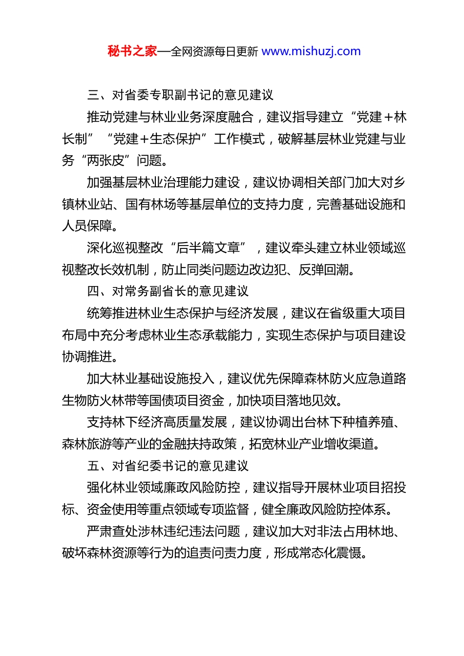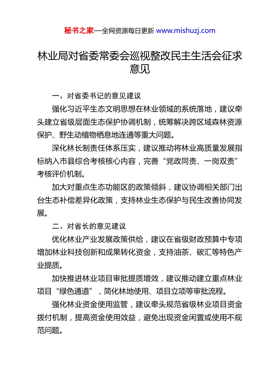 秘书之家—全网资源每日更新 www.mishuzj.com林业局对省委常委会巡视整改民主生活会征求意见一、对省委书记的意见建议强化习近平生态文明思想在林业领域的系统落地,建议牵头建立省级层面生态保护协调机制,统筹解决跨区域森林资源保护、野生动植物栖息地连通等重大问题。深化林长制责任体系压实,建议推动将林业高质量发展指标纳入市县综合考核核心内容,完善“党政同责、一岗双责”考核评价机制。加大对重点生态功能区的政策倾斜,建议协调相关部门出台生态补偿差异化政策,支持林业生态保护与民生改善协同发展。二、对省长的意见建议优化林业产业发展政策供给,建议在省级财政预算中专项增加林业科技创新和成果转化资金,支持油茶、碳汇等特色产业提质。加快推进林业项目审批提质增效,建议推动建立重点林业项目“绿色通道”,简化林地使用、项目立项等审批流程。强化林业资金使用监管,建议牵头规范省级林业项目资金拨付机制,提高资金使用效益,避免出现资金闲置或使用不规范问题。秘书之家—全网资源每日更新 www.mishuzj.com三、对省委专职副书记的意见建议推动党建与林业业务深度融合,建议指导建立“党建+林长制”“党建+生态保护”工作模式,破解基层林业党建与业务“两张皮”问题。加强基层林业治理能力建设,建议协调相关部门加大对乡镇林业站、国有林场等基层单位的支持力度,完善基础设施和人员保障。深化巡视整改“后半篇文章”,建议牵头建立林业领域巡视整改长效机制,防止同类问题边改边犯、反弹回潮。四、对常务副省长的意见建议统筹推进林业生态保护与经济发展,建议在省级重大项目布局中充分考虑林业生态承载能力,实现生态保护与项目建设协调推进。加大林业基础设施投入,建议优先保障森林防火应急道路生物防火林带等国债项目资金,加快项目落地见效。支持林下经济高质量发展,建议协调出台林下种植养殖、森林旅游等产业的金融扶持政策,拓宽林业产业增收渠道。五、对省纪委书记的意见建议强化林业领域廉政风险防控,建议指导开展林业项目招投标、资金使用等重点领域专项监督,健全廉政风险防控体系。严肃查处涉林违纪违法问题,建议加大对非法占用林地、破坏森林资源等行为的追责问责力度,形成常态化震慑。秘书之家—全网资源每日更新 www.mishuzj.com深化林业系统作风建设,建议针对巡视发现的形式主义问题,推动开展林业系统专项整治,切实改进工作作风。六、对省委政法委书记的意见建议完善涉林执法联动机制,建议牵头建立公安、林业、自然资源等多部门联合执法体系,提升对破坏森林资源行为的打击效能。强化自然保护地执法规范化建设,建议指导明确自然保护地内违法行为执法主体和职责边界,避免执法缺位或推诿。加强林业领域矛盾纠纷化解,建议推动建立涉林信访问题闭环处理机制,有效解决林地权属纠纷、生态补偿争议等群众关切问题。七、对省委组织部部长的意见建议优化林业干部队伍结构,建议加大林业专业人才招录和培养力度,重点引进林学、生态保护等专业人才,缓解基层林业人才短缺问题。加强林业干部能力建设,建议将习近平生态文明思想和林业法律法规纳入干部培训必修内容,提升干部专业履职能力。完善林业系统干部考核激励机制,建议建立符合林业工作特点的干部考核评价体系,激发基层干部干事创业热情。八、对省委宣传部部长的意见建议加大生态保护宣传力度,建议将林业生态保护纳入全省宣传工作重点,常态化开展习近平生态文明思想科普宣传。秘书之家—全网资源每日更新 www.mishuzj.com打造林业品牌宣传矩阵,建议指导各地挖掘林业特色资源加强“地理标志产品+林业”品牌推介,提升优质林产品影响力。强化涉林舆情引导,建议建立林业领域重大舆情快速响应机制,及时回应社会关切,营造良好舆论氛围。九、对省委秘书长的意见建议强化林业工作统筹协调,建议推动建立省委常委会定期研究林业工作机制,及时协调解决林业发展中的跨部门难点问题。提升林业工作督查实效,建议在省级督查考核中增加林业重点工作专项督查,推动巡视整改任务和重大政策落地见效。畅通基层林业诉求反馈渠道,建议建立基层林业工作者意见建议直达机制,及时收集...