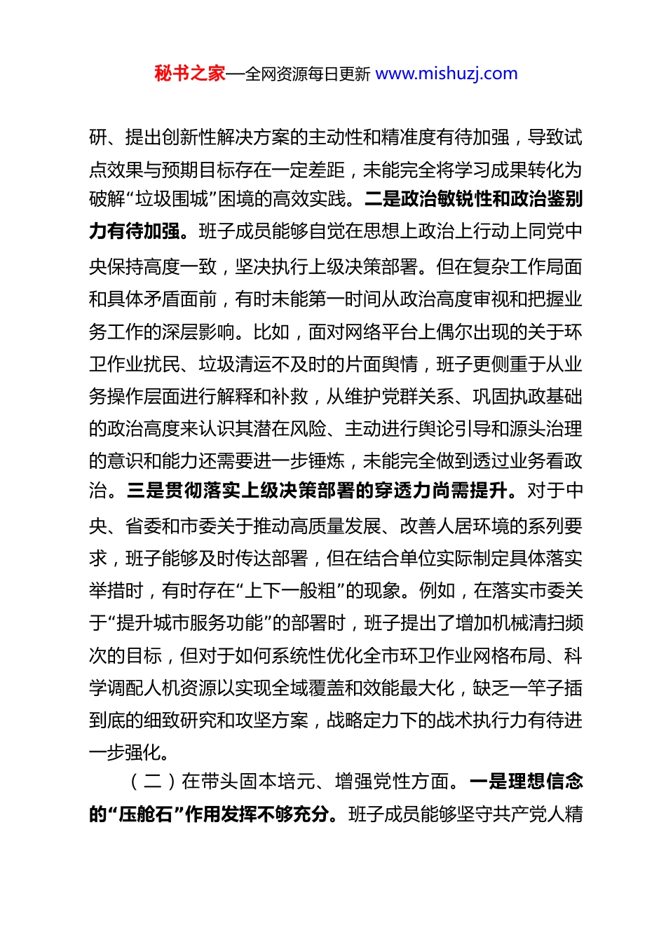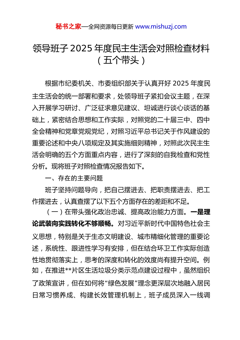 秘书之家—全网资源每日更新 www.mishuzj.com领导班子 2025 年度民主生活会对照检查材料(五个带头)根据市纪委机关、市委组织部关于认真开好 2025 年度民主生活会的统一部署和要求,处领导班子紧扣会议主题,在深入开展学习研讨、广泛征求意见建议、坦诚进行谈心谈话的基础上,紧密结合思想和工作实际,对照党的二十届三中、四中全会精神和党章党规党纪,对照习近平总书记关于作风建设的重要论述和中央八项规定及其实施细则精神,对照此次民主生活会明确的五个方面重点内容,进行了深刻的自我检查和党性分析。现将班子对照检查情况报告如下。一、存在的主要问题班子坚持问题导向,把自己摆进去、把职责摆进去、把工作摆进去,认真查摆了以下五个方面存在的差距和不足。(一)在带头强化政治忠诚、提高政治能力方面。一是理论武装向实践转化不够顺畅。对习近平新时代中国特色社会主义思想,特别是关于生态文明建设、城市精细化管理的重要论述,系统性、跟进性学习有安排,但在结合环卫工作实际创造性地贯彻落实上,思考的深度和转化的效度尚有提升空间。例如,在推进**片区生活垃圾分类示范点建设过程中,虽然组织“”了政策宣讲,但在如何将 绿色发展 理念更深层次地融入居民日常习惯养成、构建长效管理机制上,班子成员深入一线调秘书之家—全网资源每日更新 www.mishuzj.com研、提出创新性解决方案的主动性和精准度有待加强,导致试点效果与预期目标存在一定差距,未能完全将学习成果转化为“”破解 垃圾围城 困境的高效实践。二是政治敏锐性和政治鉴别力有待加强。班子成员能够自觉在思想上政治上行动上同党中央保持高度一致,坚决执行上级决策部署。但在复杂工作局面和具体矛盾面前,有时未能第一时间从政治高度审视和把握业务工作的深层影响。比如,面对网络平台上偶尔出现的关于环卫作业扰民、垃圾清运不及时的片面舆情,班子更侧重于从业务操作层面进行解释和补救,从维护党群关系、巩固执政基础的政治高度来认识其潜在风险、主动进行舆论引导和源头治理的意识和能力还需要进一步锤炼,未能完全做到透过业务看政治。三是贯彻落实上级决策部署的穿透力尚需提升。对于中央、省委和市委关于推动高质量发展、改善人居环境的系列要求,班子能够及时传达部署,但在结合单位实际制定具体落实“”举措时,有时存在 上下一般粗 的现象。例如,在落实市委关“”于 提升城市服务功能 的部署时,班子提出了增加机械清扫频次的目标,但对于如何系统性优化全市环卫作业网格布局、科学调配人机资源以实现全域覆盖和效能最大化,缺乏一竿子插到底的细致研究和攻坚方案,战略定力下的战术执行力有待进一步强化。(二)在带头固本培元、增强党性方面。一是理想信念“”的 压舱石 作用发挥不够充分。班子成员能够坚守共产党人精秘书之家—全网资源每日更新 www.mishuzj.com“”神追求,但面对环卫工作 苦、脏、累、险 的职业特点和部分社会偏见,有时在言传身教、鼓舞一线职工士气方面,方式方法较为传统,运用党的创新理论中蕴含的立场观点方法来诠释平凡岗位不平凡价值、凝聚队伍思想共识的穿透力和感染力不足。在**垃圾填埋场生态修复项目攻坚期,面对技术难题和艰苦环境,班子侧重于任务分解和工期督导,但在利用党性教育激发党员技术骨干先锋模范作用、带领团队啃下硬骨头的思想动员深度上还可以做得更好。二是党性原则的刚性约束有时让位于工作便利。虽然班子成员认真学习党章党规党纪,但在日“”“常管理决策中,偶尔存在 为了把事情办成 而打政策 擦边”球 或简化程序的想法。例如,在去年更新一批小型环卫车辆时,考虑到采购流程周期较长可能影响旺季保洁,曾有过是否“”可以通过 特事特办 方式加快进度的讨论,虽然最终严格按程序办理,但反映出在严格遵守组织程序、制度规矩方面,思想“”深处的 安全阀 拧得不够紧,用党性原则正心明道、修身律己的自觉性仍需时刻警醒。三是批评与自我批评的武器运用不够经常有力。班子内部能够保持团结,但在民主生活会上之外的“”日常工作中, 一团和气 思想仍有市场。开展相互批评时,有时顾虑较多,怕影响团...