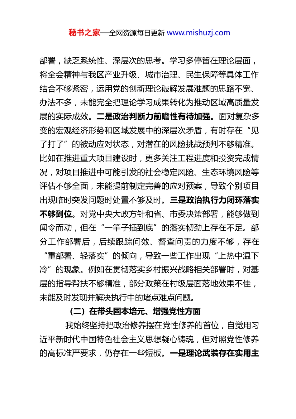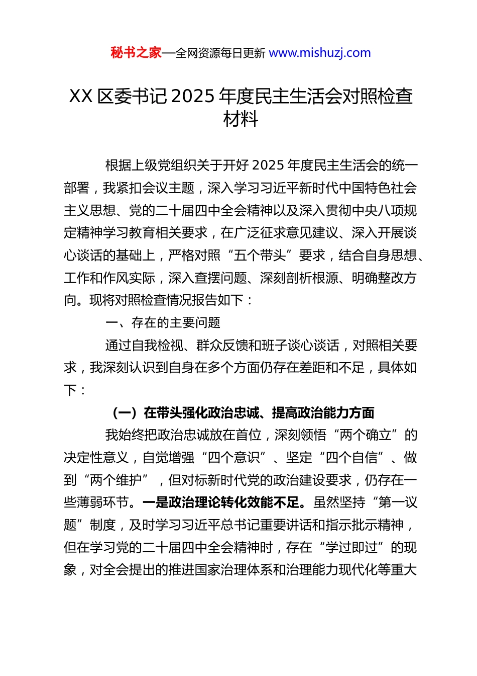 秘书之家—全网资源每日更新 www.mishuzj.comXX 区委书记 2025 年度民主生活会对照检查材料根据上级党组织关于开好 2025 年度民主生活会的统一部署,我紧扣会议主题,深入学习习近平新时代中国特色社会主义思想、党的二十届四中全会精神以及深入贯彻中央八项规定精神学习教育相关要求,在广泛征求意见建议、深入开展谈心谈话的基础上,严格对照“五个带头”要求,结合自身思想、工作和作风实际,深入查摆问题、深刻剖析根源、明确整改方向。现将对照检查情况报告如下:一、存在的主要问题通过自我检视、群众反馈和班子谈心谈话,对照相关要求,我深刻认识到自身在多个方面仍存在差距和不足,具体如下:(一)在带头强化政治忠诚、提高政治能力方面我始终把政治忠诚放在首位,深刻领悟“两个确立”的决定性意义,自觉增强“四个意识”、坚定“四个自信”、做到“两个维护”,但对标新时代党的政治建设要求,仍存在一些薄弱环节。一是政治理论转化效能不足。虽然坚持“第一议题”制度,及时学习习近平总书记重要讲话和指示批示精神,但在学习党的二十届四中全会精神时,存在“学过即过”的现象,对全会提出的推进国家治理体系和治理能力现代化等重大秘书之家—全网资源每日更新 www.mishuzj.com部署,缺乏系统性、深层次的思考。学习多停留在理论层面,将全会精神与我区产业升级、城市治理、民生保障等具体工作结合不够紧密,运用党的创新理论破解发展难题的思路不宽、办法不多,未能完全把理论学习成果转化为推动区域高质量发展的实际成效。二是政治判断力前瞻性有待加强。面对复杂多变的宏观经济形势和区域发展中的深层次矛盾,有时存在“见子打子”的被动应对状态,对潜在的风险挑战预判不够精准。比如在推进重大项目建设时,更多关注工程进度和投资完成情况,对项目推进中可能引发的社会稳定风险、生态环境风险等评估不够全面,未能提前制定完善的应对预案,导致个别项目出现临时突发问题时处置不够及时。三是政治执行力闭环落实不够到位。对党中央大政方针和省、市委决策部署,能够做到闻令而动,但在“一竿子插到底”的落实韧劲上存在不足。部分工作部署后,后续跟踪问效、督查问责的力度不够,存在“重部署、轻落实”的倾向,导致一些工作出现“上热中温下冷”的现象。例如在贯彻落实乡村振兴战略相关部署时,对基层的指导帮扶不够精准,部分政策在村级层面落地效果不佳,未能及时发现并解决执行中的堵点难点问题。(二)在带头固本培元、增强党性方面我始终坚持把政治修养摆在党性修养的首位,自觉用习近平新时代中国特色社会主义思想凝心铸魂,但对照党性修养的高标准严要求,仍存在一些短板。一是理论武装存在实用主秘书之家—全网资源每日更新 www.mishuzj.com义倾向。学习党章党规党纪和党的创新理论时,存在“用什么学什么、缺什么补什么”的现象,对与工作联系紧密的内容钻研较多,对马克思主义基本原理、党的历史等系统性学习不够深入。在深入贯彻中央八项规定精神学习教育中,更多关注具体条款的学习,对其背后蕴含的作风建设规律和政治要求领悟不够透彻,未能从思想根源上筑牢抵制歪风邪气的防线。二是党内政治生活“辣味”不足。在民主生活会、组织生活会上,开展批评与自我批评时,有时碍于情面,存在“老好人”思想。批评他人时,多讲工作问题、少谈思想根源,多提希望建议、少点要害问题;自我批评时,避重就轻、遮遮掩掩,未能真正达到“红脸出汗、排毒治病”的效果,党内政治生活的政治性、时代性、原则性、战斗性有待增强。三是党性锤炼融入日常不够。虽然能够牢记共产党人的精神追求,但在日常工作和生活中,将党性要求转化为自觉行动的意识不够强。面对一些非原则性问题,有时存在“多一事不如少一事”的懈怠思想,缺乏“越是艰险越向前”的斗争精神;在处理急难险重任务时,偶尔会产生畏难情绪,攻坚克难的锐气有所减退,党性修养的锤炼未能贯穿始终。(三)在带头敬畏人民、敬畏组织、敬畏法纪方面我始终牢记党的根本宗旨,严格遵守党的组织纪律和法律法规,但在践行“三个敬畏”的自觉性和坚定性上仍需提升。一是践行群众路线不够扎实。虽然坚...