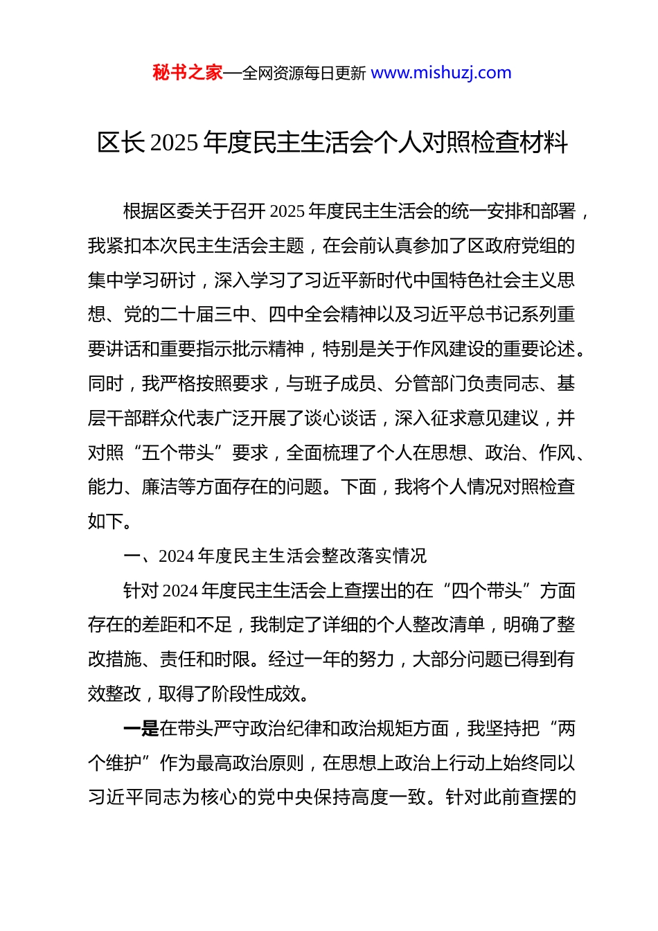 秘书之家—全网资源每日更新 www.mishuzj.com区长 2025 年度民主生活会个人对照检查材料 根据区委关于召开 2025 年度民主生活会的统一安排和部署,我紧扣本次民主生活会主题,在会前认真参加了区政府党组的集中学习研讨,深入学习了习近平新时代中国特色社会主义思想、党的二十届三中、四中全会精神以及习近平总书记系列重要讲话和重要指示批示精神,特别是关于作风建设的重要论述。同时,我严格按照要求,与班子成员、分管部门负责同志、基层干部群众代表广泛开展了谈心谈话,深入征求意见建议,并对照“五个带头”要求,全面梳理了个人在思想、政治、作风、能力、廉洁等方面存在的问题。下面,我将个人情况对照检查如下。一、2024 年度民主生活会整改落实情况针对 2024 年度民主生活会上查摆出的在“四个带头”方面存在的差距和不足,我制定了详细的个人整改清单,明确了整改措施、责任和时限。经过一年的努力,大部分问题已得到有效整改,取得了阶段性成效。一是在带头严守政治纪律和政治规矩方面,我坚持把“两个维护”作为最高政治原则,在思想上政治上行动上始终同以习近平同志为核心的党中央保持高度一致。针对此前查摆的秘书之家—全网资源每日更新 www.mishuzj.com“对上级决策部署的本地化研究结合不够”问题,我牵头建立了重点工作“研究—部署—督办—反馈”闭环落实机制,确保中央、省市各项决策在**区不折不扣落地生根。二是在带-头增强党性、砥砺作风方面,我坚持把加强党性锻炼作为终身课题。针对“服务群众‘最后一公里’有时存在堵点”的问题,我带头落实“四下基层”制度,全年深入街道、社区、企业超过 60 天,现场协调解决了包括老旧电梯加装、背街小巷治理等一批群众急难愁盼问题。三是在带头勇于担责、敢于创新方面,我聚焦高质量发展首要任务,积极应对挑战。针对“面对经济下行压力,推动产业转型升级的创新举措不多”的问题,我带队赴先进地区考察学习,积极推动我区数字经济与实体经济融合发展,成功引进了 3 家行业头部企业落户,为**区产业结构优化注入了新的动力。四是在带头履行全面从严治党政治责任方面,我坚决扛起政府系统党风廉政建设“第一责任人”责任。针对“对分管领域干部的日常监督提醒不够”的问题,我坚持每季度与区政府班子成员、重点部门“一把手”开展廉政谈话,对苗头性、倾向性问题及时提醒、咬耳扯袖,推动管党治党责任层层压实。同时,我也清醒地认识到,一些深层次问题的整改还需持秘书之家—全网资源每日更新 www.mishuzj.com续用力、久久为功。例如,如何建立更为有效的机制,彻底根治形式主义、官僚主义的顽瘴痼疾,仍是我需要不断探索和解决的课题。我将把这些问题带到这次民主生活会中,并结合新查摆的问题,一体制定整改措施,持续抓好落实。二、存在的问题对照本次民主生活会“五个带头”的要求,我坚持把自己摆进去、把职责摆进去、把工作摆进去,深入查摆了自身存在的突出问题。(一)在带头强化政治忠诚、提高政治能力方面一是对“两个确立”的决定性意义的实践转化还不够到位。在日常工作中,能够坚定拥护“两个确立”、坚决做到“两个维护”,但在将这一深刻领悟转化为推动**区高质量发展的具体实践和实际成效上,还存在一定的差距。有时在贯彻落实上级重大决策部署时,满足于开会传达、发文部署、任务分解,但在如何结合**区作为中心城区的实际,创造性地抓好落实,特别是提前预判政策落地过程中可能出现的堵点、难点,并制定前瞻性、针对性的配套措施方面,思考得不够深、谋划得不够远。二是运用政治眼光观察和分析经济社会问题的能力有待提升。面对当前复杂严峻的宏观经济形势,有时更多地是从经济秘书之家—全网资源每日更新 www.mishuzj.com数据、产业指标等技术层面去分析问题、谋划对策,而从政治高度去审视和把握经济工作的方向性、全局性问题还不够。例如,在推进金融风险防范化解工作中,虽然采取了一系列措施压降地方债务,但对于如何从维护政治安全和社会稳定的高度,构建更为长效的风险防控体系,从根源上铲除风险滋生的土壤,思考和研究的深度还显不足。三是应对复杂局面、驾驭风险...