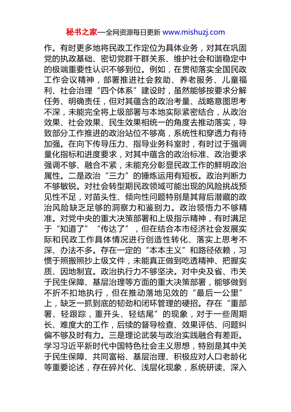 秘书之家—全网资源每日更新 www.mishuzj.com市民政局党组书记 2025 年度专题民主生活会对照检查发言提纲(“五个带头”)根据市委关于召开 2025 年度专题民主生活会的统一部署和局党组具体安排,我坚持以习近平新时代中国特色社会主义思想为指导,深入学习贯彻党的二十大和二十届三中、四中全会精神,全面落实习近平总书记关于民政工作的重要论述和指示批示精神,聚焦“五个带头”要求,坚持把理论学习、查摆问题、剖析根源、整改落实有机贯通、一体推进。会前,本人认真研读规定学习篇目,积极参加党组理论学习中心组研讨交流,广泛开展谈心谈话,深入基层民政服务机构、社区、社会组织等一线走访调研,并通过书面、座谈等方式,面向机关党员干部、直属单位负责人、服务对象代表、社会组织代表及社会各界广泛征求意见建议,累计收集各类意见建议 46 条。在此基础上,本人紧密联系个人思想、学习、工作和作风实际,对照“五个带头”要求,进行深刻的党性分析和自我剖析,认真查摆了自身存在的突出问题,深入剖析了问题产生的思想根源,并明确了今后的整改方向和具体措施。一、存在的主要问题(一)在带头强化政治忠诚、提高政治能力方面。总体上看,本人能够自觉在思想上政治上行动上同以习近平同志为核心的党中央保持高度一致,坚定拥护“两个确立”,坚决做到“两个维护”,但在将政治忠诚和政治能力全面、精准、高效地融入并引领新时代民政工作实践方面,仍存在一些差距和不足。一是政治忠诚的实践转化深度有欠缺。对“民政工作关系民生、连着民心”这一重大政治论断的深刻内涵和实践要求领悟不够透彻,未能时时处处站在“国之大者”的高度审视、谋划和推进民政工秘书之家—全网资源每日更新 www.mishuzj.com作。有时更多地将民政工作定位为具体业务,对其在巩固党的执政基础、密切党群干群关系、维护社会和谐稳定中的极端重要性认识不够到位。例如,在贯彻落实全国民政工作会议精神,部署推进社会救助、养老服务、儿童福利、社会治理“四个体系”建设时,虽然能够按要求分解任务、明确责任,但对其蕴含的政治考量、战略意图思考不深,未能完全将上级部署与本地实际紧密结合,从政治效果、社会效果、民生效果相统一的角度去推动落实,导致部分工作推进的政治站位不够高,系统性和穿透力有待加强。在向下传导压力、指导业务科室时,有时过于强调量化指标和进度要求,对其中蕴含的政治标准、政治要求强调不够、融合不紧,未能充分彰显民政工作的鲜明政治属性。二是政治“三力”的锤炼运用有短板。政治判断力不够敏锐。对社会转型期民政领域可能出现的风险挑战预见性不足,对苗头性、倾向性问题特别是其背后潜藏的政治风险缺乏足够的洞察力和鉴别力。政治领悟力不够精准。对党中央的重大决策部署和上级指示精神,有时满足于“知道了”“传达了”,但在结合本市经济社会发展实际和民政工作具体情况进行创造性转化、落实上思考不深、办法不多。存在一定的“本本主义”和路径依赖,习惯于照搬照抄上级文件,未能真正做到吃透精神、把握实质、因地制宜。政治执行力不够坚决。对中央及省、市关于民生保障、基层治理等方面的重大决策部署,能够做到不折不扣地执行,但在推动落地见效的“最后一公里”上,缺乏一抓到底的韧劲和闭环管理的硬招。存在“重部署、轻跟踪,重开头、轻结尾”的现象,对于一些周期长、难度大的工作,后续的督导检查、效果评估、问题纠偏不够及时有力。三是理论武装与政治实践融合有差距。学习习近平新时代中国特色社会主义思想,特别是其中关于民生保障、共同富裕、基层治理、积极应对人口老龄化等重要论述,存在碎片化、浅层化现象,系统研读、深入秘书之家—全网资源每日更新 www.mishuzj.com思考不够,对其核心要义、精神实质、实践要求的理解把握不够透彻,未能完全做到融会贯通、知行合一。参加中心组学习有时存在“被动接受”心态,研讨交流的深度和碰撞不够,将党的创新理论转化为指导民政实践、破解工作难题的思路、方法、举措的能力有待提升。例如,在理解和落实“积极应对人口老龄化国家战略”时,对战略的全局性、系统性、长期性认识不足,...