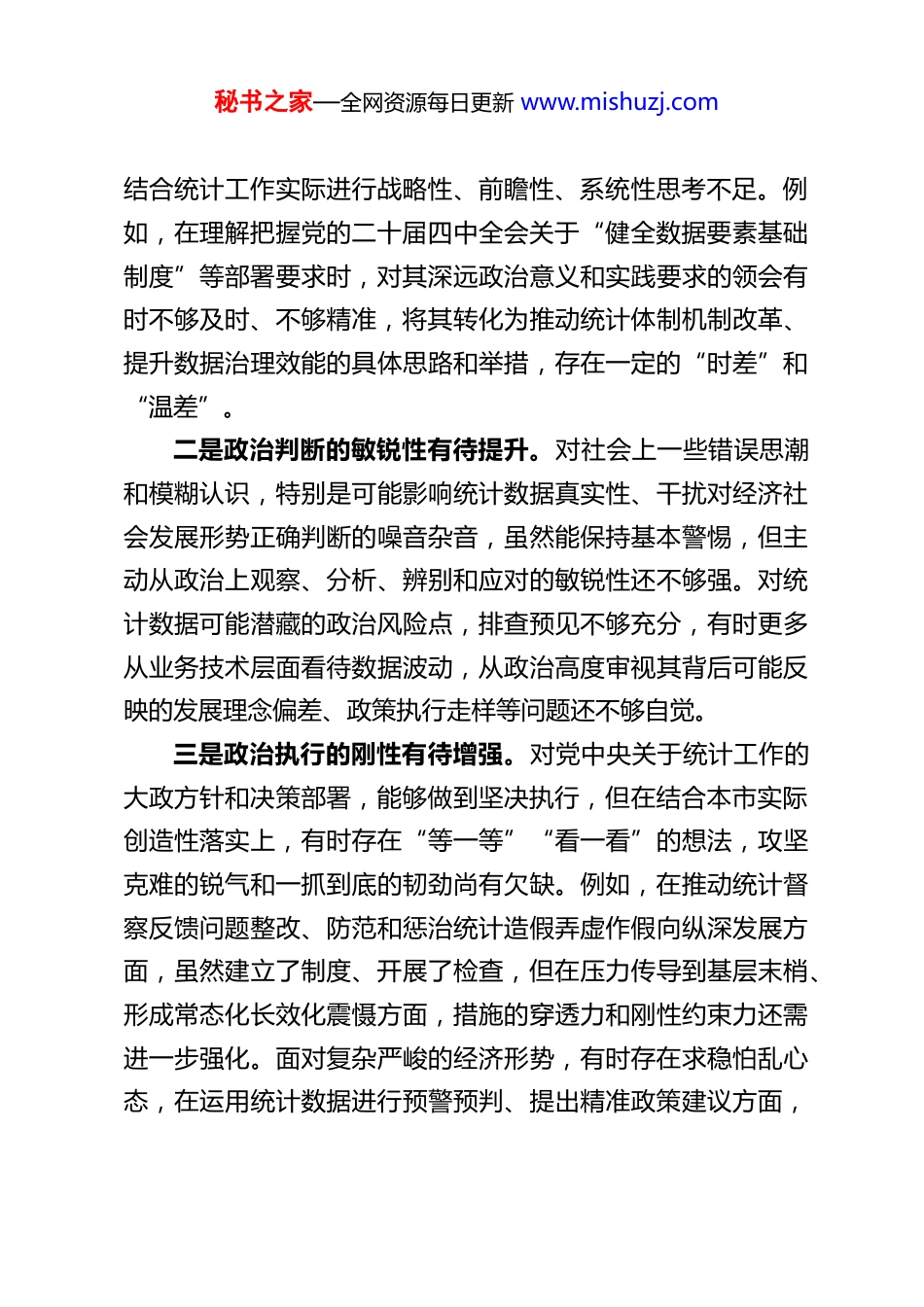 秘书之家—全网资源每日更新 www.mishuzj.comXX 市统计局局长 2025 年度民主生活会对照检查材料根据本次民主生活会要求,本人紧扣会议主题,在深入学习党的创新理论、党的二十大及二十届二中、三中、四中全会精神,认真学习党章党规党纪以及中央关于民主生活会的有关要求,深入开展谈心谈话,广泛征求意见建议的基础上,紧密结合个人思想、学习和工作实际,重点围绕“带头强化政治忠诚、提高政治能力”等五个方面,并对照反面典型案例,深入查摆自身存在的问题,深刻剖析问题产生的根源,明确了今后的努力方向和整改措施。现将对照检查情况报告如下:一、存在的主要问题(一)在带头强化政治忠诚、提高政治能力方面能够深刻认识“两个确立”的决定性意义,自觉增强“四个意识”、坚定“四个自信”、做到“两个维护”,始终在思想上政治上行动上同以习近平同志为核心的党中央保持高度一致,坚决贯彻执行党的路线方针政策和上级决策部署。但对照更高标准、更严要求,仍存在一些不足:一是政治领悟的穿透力有待加强。对习近平新时代中国特色社会主义思想,特别是其中关于经济社会高质量发展、统计工作现代化等重要论述的学习,有时停留在“知道”“了解”层面,对其蕴含的马克思主义立场、观点、方法钻研不够深透,秘书之家—全网资源每日更新 www.mishuzj.com结合统计工作实际进行战略性、前瞻性、系统性思考不足。例如,在理解把握党的二十届四中全会关于“健全数据要素基础制度”等部署要求时,对其深远政治意义和实践要求的领会有时不够及时、不够精准,将其转化为推动统计体制机制改革、提升数据治理效能的具体思路和举措,存在一定的“时差”和“温差”。二是政治判断的敏锐性有待提升。对社会上一些错误思潮和模糊认识,特别是可能影响统计数据真实性、干扰对经济社会发展形势正确判断的噪音杂音,虽然能保持基本警惕,但主动从政治上观察、分析、辨别和应对的敏锐性还不够强。对统计数据可能潜藏的政治风险点,排查预见不够充分,有时更多从业务技术层面看待数据波动,从政治高度审视其背后可能反映的发展理念偏差、政策执行走样等问题还不够自觉。三是政治执行的刚性有待增强。对党中央关于统计工作的大政方针和决策部署,能够做到坚决执行,但在结合本市实际创造性落实上,有时存在“等一等”“看一看”的想法,攻坚克难的锐气和一抓到底的韧劲尚有欠缺。例如,在推动统计督察反馈问题整改、防范和惩治统计造假弄虚作假向纵深发展方面,虽然建立了制度、开展了检查,但在压力传导到基层末梢、形成常态化长效化震慑方面,措施的穿透力和刚性约束力还需进一步强化。面对复杂严峻的经济形势,有时存在求稳怕乱心态,在运用统计数据进行预警预判、提出精准政策建议方面,秘书之家—全网资源每日更新 www.mishuzj.com主动性和前瞻性有待提高。(二)在带头固本培元、增强党性方面能够坚持把政治修养摆在首位,注重用党的创新理论武装头脑,努力改造主观世界,坚守共产党人精神追求。但对照党性原则的“高标准”“严要求”,仍存在差距:一是理论武装的系统性深入性有差距。学习习近平新时代中国特色社会主义思想存在“碎片化”现象,对其整体性、关联性把握不够。集中学习多、个人潜心研读少,对其中蕴含的世界观、方法论掌握运用不够娴熟。有时满足于完成“规定动作”,带着问题学、联系实际思、指导实践用的自觉性不够强,未能完全做到学思用贯通、知信行统一。对党章党规党纪的学习,有时当作“软任务”,对其精髓要义和纪律要求的理解不够深透,用以正心明道、修身律己的标尺树得不够高。二是理想信念的实践锤炼有不足。虽然理想信念是坚定的但在长期和平环境和市场经济条件下,面对统计工作的繁杂琐碎和外界诱惑,有时会产生“歇歇脚”“松口气”的念头,艰苦奋斗、甘于奉献的革命意志有所弱化。将崇高理想融入日常统计工作、转化为爱岗敬业具体行动的内生动力有时不够强劲,先锋模范作用发挥不够充分。对照先进典型和榜样,自我净化、自我完善、自我革新、自我提高的主动性、紧迫感有待增强。三是党性修养的日常砥砺有欠缺。在严肃党内政治生活方面,有时存在“事务...