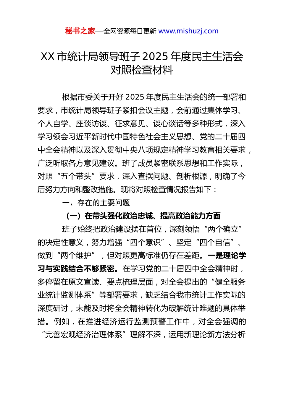 秘书之家—全网资源每日更新 www.mishuzj.comXX 市统计局领导班子 2025 年度民主生活会对照检查材料根据市委关于开好 2025 年度民主生活会的统一部署和要求,市统计局领导班子紧扣会议主题,会前通过集体学习、个人自学、座谈访谈、征求意见、谈心谈话等多种形式,深入学习领会习近平新时代中国特色社会主义思想、党的二十届四中全会精神以及深入贯彻中央八项规定精神学习教育相关要求,广泛听取各方意见建议。班子成员紧密联系思想和工作实际,对照“五个带头”要求,深入查摆问题、剖析根源,明确了今后努力方向和整改措施。现将对照检查情况报告如下:一、存在的主要问题(一)在带头强化政治忠诚、提高政治能力方面班子始终把政治建设摆在首位,深刻领悟“两个确立”的决定性意义,努力增强“四个意识”、坚定“四个自信”、做到“两个维护”,但对照更高标准仍存在差距。一是理论学习与实践结合不够紧密。在学习党的二十届四中全会精神时,多停留在原文宣读、要点梳理层面,对全会提出的“健全服务业统计监测体系”等部署要求,缺乏结合我市统计工作实际的深度研讨,未能及时将全会精神转化为破解统计难题的具体举措。例如,在推进经济运行监测预警工作中,对全会强调的“完善宏观经济治理体系”理解不深,运用新理论新方法分析秘书之家—全网资源每日更新 www.mishuzj.com数据、预判趋势的能力不足,部分统计分析报告仍停留在数据罗列层面,对经济运行中的深层次矛盾挖掘不够。二是政治执行力存在薄弱环节。在贯彻落实党中央关于统计工作的大政方针和决策部署时,有时存在“上热中温下冷”现象,对基层统计机构的督促指导不够到位。如在推进企业电子统计台账建设工作中,因担心增加基层负担而降低推进力度,导致部分乡镇(街道)“四上”企业电子台账覆盖率未达预期,影响了统计数据源头质量管控。三是政治敏锐性有待提升。对统计领域潜在的风险隐患警惕性不足,面对社会上个别质疑统计数据的言论,缺乏主动发声、坚决斗争的意识和能力,未能及时有效维护统计工作的权威性和严肃性。在落实意识形态工作责任制方面,对干部职工网络空间言行的规范引导不够细致,存在监管盲区。(二)在带头固本培元、增强党性方面班子坚持把党性修养作为终身课题,注重以习近平新时代中国特色社会主义思想凝心铸魂,但在常态化锤炼党性上仍有不足。一是理想信念教育实效性不强。党性教育活动形式较为单一,多以集中学习、观看警示教育片为主,缺乏沉浸式、体验式教育载体,导致部分班子成员参与积极性不高,未能真正将理想信念内化于心、外化于行。在参与红色教育基地学习时,存在“走马观花”现象,对革命精神的时代内涵领悟不深,未能有效将其转化为推动统计工作的精神动力。二是党章党规秘书之家—全网资源每日更新 www.mishuzj.com党纪学习不够扎实。对党章、《中国共产党纪律处分条例》等党内法规的学习缺乏系统性,存在碎片化学习问题,部分班子成员对统计工作相关的纪律要求掌握不细,在日常工作中未能严格以党性原则正心明道。例如,在统计执法检查中,面对个别企业的请托说情,存在碍于情面、执纪不严的倾向,未能坚决维护统计纪律的严肃性。三是为民情怀树得不牢。在工作中更多关注统计数据的准确性和及时性,对群众关心的统计数据解读、统计服务需求等关注不够。发布统计数据时,专业术语过多,缺乏通俗易懂的解读说明,导致群众对统计数据的理解存在偏差,未能充分发挥统计数据服务群众的作用。(三)在带头敬畏人民、敬畏组织、敬畏法纪方面班子始终坚持以人民为中心的发展思想,严格遵守组织纪律和法律法规,但对照更高要求仍有差距。一是践行群众路线不够深入。落实“四下基层”制度不够扎实,深入企业、社区、乡村开展调研的频次不足,且调研存在“走马观花”现象,往往是听汇报多、看亮点多,与基层统计人员、企业统计员、群众面对面交流少,未能真正摸清基层统计工作的难点痛点和群众的急难愁盼问题。例如,在开展民生统计调查时,对群众反映强烈的就业、收入、教育等领域的统计需求,未能及时调整调查内容和方式,统计服务的针对性和实效性有待提升。二是民主集中...