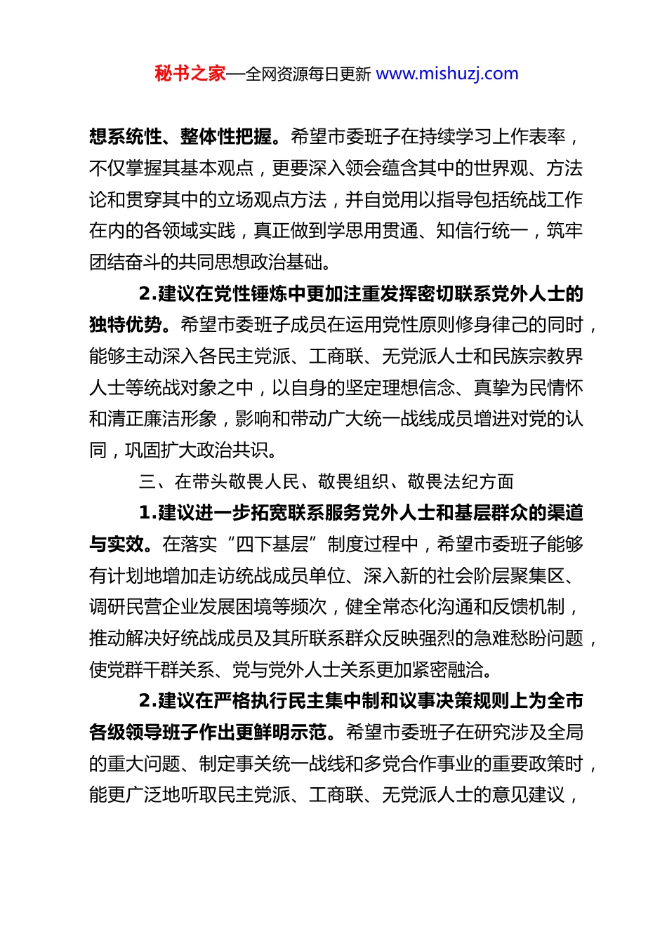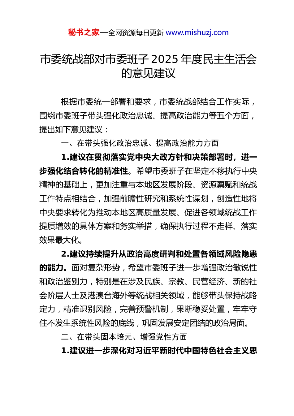 秘书之家—全网资源每日更新 www.mishuzj.com市委统战部对市委班子 2025 年度民主生活会的意见建议根据市委统一部署和要求,市委统战部结合工作实际,围绕市委班子带头强化政治忠诚、提高政治能力等五个方面,提出如下意见建议:一、在带头强化政治忠诚、提高政治能力方面1.建议在贯彻落实党中央大政方针和决策部署时,进一步强化结合转化的精准性。希望市委班子在坚定不移执行中央精神的基础上,更加注重与本地区发展阶段、资源禀赋和统战工作特点相结合,加强前瞻性研究和系统性谋划,创造性地将中央要求转化为推动本地区高质量发展、促进各领域统战工作提质增效的具体方案和务实举措,确保执行过程不走样、落实效果最大化。2.建议持续提升从政治高度研判和处置各领域风险隐患的能力。面对复杂形势,希望市委班子进一步增强政治敏锐性和政治鉴别力,特别是在涉及民族、宗教、民营经济、新的社会阶层人士及港澳台海外等统战相关领域,能够带头保持战略定力,精准识别风险,完善预警机制,果断稳妥处置,牢牢守住不发生系统性风险的底线,巩固发展安定团结的政治局面。二、在带头固本培元、增强党性方面1.建议进一步深化对习近平新时代中国特色社会主义思秘书之家—全网资源每日更新 www.mishuzj.com想系统性、整体性把握。希望市委班子在持续学习上作表率,不仅掌握其基本观点,更要深入领会蕴含其中的世界观、方法论和贯穿其中的立场观点方法,并自觉用以指导包括统战工作在内的各领域实践,真正做到学思用贯通、知信行统一,筑牢团结奋斗的共同思想政治基础。2.建议在党性锤炼中更加注重发挥密切联系党外人士的独特优势。希望市委班子成员在运用党性原则修身律己的同时,能够主动深入各民主党派、工商联、无党派人士和民族宗教界人士等统战对象之中,以自身的坚定理想信念、真挚为民情怀和清正廉洁形象,影响和带动广大统一战线成员增进对党的认同,巩固扩大政治共识。三、在带头敬畏人民、敬畏组织、敬畏法纪方面1.建议进一步拓宽联系服务党外人士和基层群众的渠道与实效。在落实“四下基层”制度过程中,希望市委班子能够有计划地增加走访统战成员单位、深入新的社会阶层聚集区、调研民营企业发展困境等频次,健全常态化沟通和反馈机制,推动解决好统战成员及其所联系群众反映强烈的急难愁盼问题,使党群干群关系、党与党外人士关系更加紧密融洽。2.建议在严格执行民主集中制和议事决策规则上为全市各级领导班子作出更鲜明示范。希望市委班子在研究涉及全局的重大问题、制定事关统一战线和多党合作事业的重要政策时,能更广泛地听取民主党派、工商联、无党派人士的意见建议,秘书之家—全网资源每日更新 www.mishuzj.com确保决策的科学化、民主化、法治化,坚决防止和克服可能存在的听取意见不充分、决策程序不规范等现象。四、在带头干事创业、担当作为方面1.建议在树立和践行正确政绩观上,更加注重发挥统一战线的法宝作用推动高质量发展。希望市委班子在完整准确全面贯彻新发展理念、统筹推进各项工作中,进一步强化统战思维,善于调动各民主党派参政议政、民主监督的积极性,激发民营经济人士创新创业活力,引导新的社会阶层人士贡献智慧力量,汇聚海内外资源,为破解发展难题、厚植发展优势、实现“十五五”良好开局凝聚更广泛的力量支持。2.建议在防范化解重大风险挑战中,更加注重运用统战方式方法。希望市委班子增强忧患意识,坚持底线思维,在应对经济社会领域风险、意识形态领域斗争时,能够带头并指导各级善于通过思想政治引导、协商沟通、求同存异等统战工作方式,团结大多数,孤立极少数,有效化解矛盾、凝聚共识,提升斗争艺术和应变能力。五、在带头坚决扛起管党治党责任方面1.建议在深化全面从严治党中,同步加强对统一战线各领域廉洁风险防控的指导和监督。希望市委班子在严于律己、严负其责、严管所辖的同时,能够关注并推动统战系统、工商联系统、民族宗教工作领域以及民主党派机关的廉政建设,指导完善内部监督和风险防控机制,共同营造风清气正的政治生秘书之家—全网资源每日更新 www.mishuzj.com态。2.建议在整治形式主义为基层减负和树立选人用...