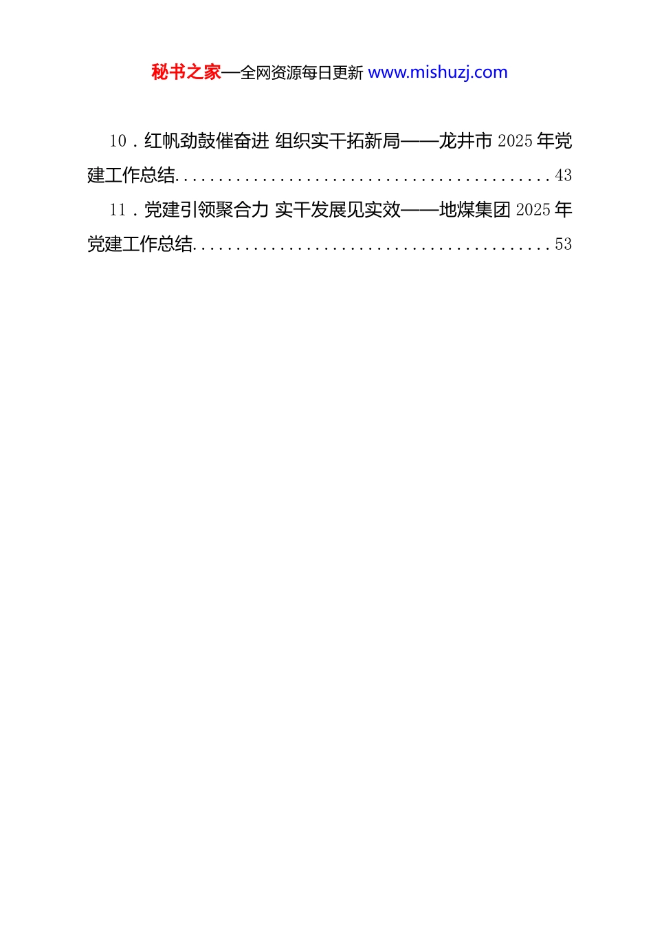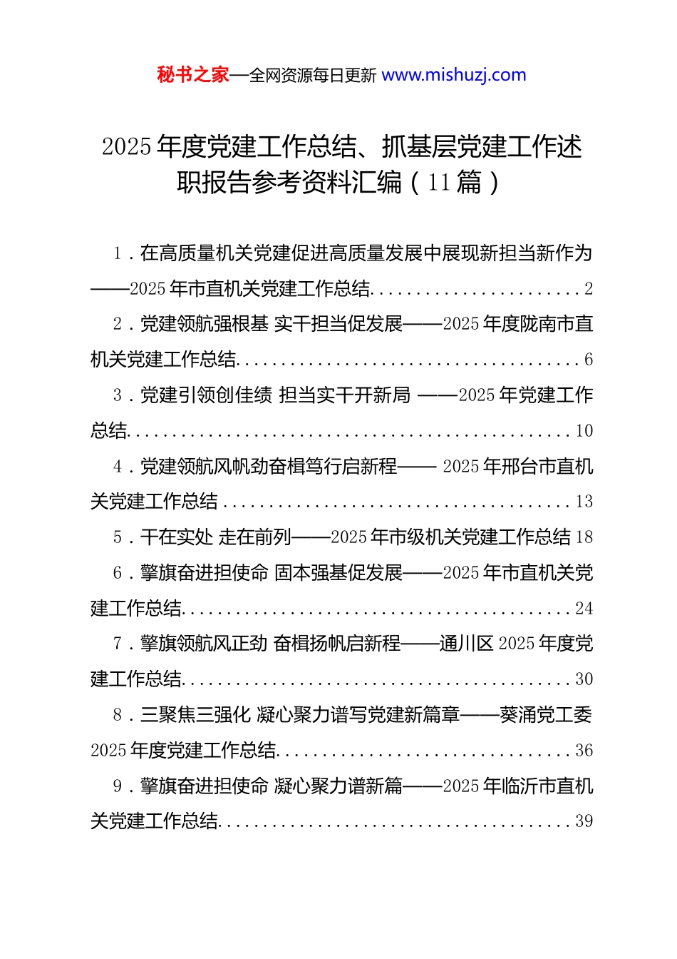 秘书之家—全网资源每日更新 www.mishuzj.com2025 年度党建工作总结、抓基层党建工作述职报告参考资料汇编(11 篇)1.在高质量机关党建促进高质量发展中展现新担当新作为——2025 年市直机关党建工作总结.......................22.党建领航强根基 实干担当促发展——2025 年度陇南市直机关党建工作总结......................................63.党建引领创佳绩 担当实干开新局 ——2025 年党建工作总结.................................................104.党建领航风帆劲奋楫笃行启新程—— 2025 年邢台市直机关党建工作总结 ......................................135.干在实处 走在前列——2025 年市级机关党建工作总结 186.擎旗奋进担使命 固本强基促发展——2025 年市直机关党建工作总结...........................................247.擎旗领航风正劲 奋楫扬帆启新程——通川区 2025 年度党建工作总结...........................................308.三聚焦三强化 凝心聚力谱写党建新篇章——葵涌党工委2025 年度党建工作总结................................369.擎旗奋进担使命 凝心聚力谱新篇——2025 年临沂市直机关党建工作总结.......................................39秘书之家—全网资源每日更新 www.mishuzj.com10.红帆劲鼓催奋进 组织实干拓新局——龙井市 2025 年党建工作总结...........................................4311.党建引领聚合力 实干发展见实效——地煤集团 2025 年党建工作总结.........................................53秘书之家—全网资源每日更新 www.mishuzj.com在高质量机关党建促进高质量发展中展现新担当新作为——2025 年市直机关党建工作综述擦亮特色党建品牌,推进党建与业务深度融合;加强基层组织建设,筑牢战斗堡垒……回首过去的一年,对于市委市直机关工委来说,奋斗是不变的注脚,实干、有为是最鲜明的底色。2025 年,市委市直机关工委牢牢把握“围绕中心、服务群众、建设队伍”职责定位,紧贴市委、市政府中心工作,紧盯人民群众急难愁盼,进一步深化市委“三提三敢”要求,扎实落实压实责任、务实创新,让机关党建与聊城高质量发展的时代脉搏同频共振,以奋斗之笔书写中国式现代化聊城实践的新篇章。一、凝心铸魂 提高思想“凝聚力”党政机关首先是政治机关,必须旗帜鲜明讲政治。市委市直机关工委坚持把政治建设摆在机关党建首要位置,把学习宣传贯彻党的二十届三中、四中全会精神,作为市直机关党组织首要政治任务,强化理论武装,补足精神之钙。深耕理论武装“责任田”,严格落实“第一议题”制度,强化理论学习中心组学习,发挥“关键少数”领学促学作用。深化“青年畅聊”理论学习品牌创建,成立青年理论学习小组 450 个,常态化开展读书分享会、青年理论宣讲等活动。从严从实抓好市直机关秘书之家—全网资源每日更新 www.mishuzj.com深入贯彻中央八项规定精神学习教育,一体推进学查改,开展“砥作风争先锋建新功”庆“七一”主题系列活动,推动作风建设从“纸上”落到“事上”。深化学习效果,4 篇征文获评全省机关“深化改革创新怎么看怎么办”优秀征文,4 篇调研报告获评全省机关党建优秀调研课题。二、压实责任 提高制度“执行力”市委市直机关工委制定《关于推动市直机关部门单位党组(党委)落实机关党建主体责任的实施意见》和《市直机关党建工作“三级五岗”责任清单(试行)》,明晰覆盖党组(党委)、机关党委(总支)、机关党支部 3 个层次和党组(党委)书记、党组班子成员、机关党委书记、机关纪委书记、机关党支部书记 5 个岗位的具体职责,进一步压紧压实市直部门(单位)党组(党委)抓机关党建责任,把党建责任定位到岗、精准到人、量化到事。围绕市委中心工作,开展“作风深化、实干争先”专项督查,对涉及十个“着力点”的 20 个主责部门开展重点督查,推动市直机关抓党建、促发展,引领市直机关基层党组织和共产党员更好发挥战斗堡垒和先锋模范作用。三、强基固本 增强组织“向心力”市委市直机关工委牢固树立“一切工作到支...
