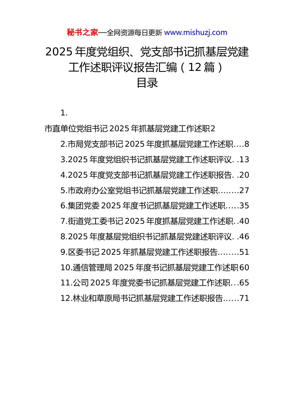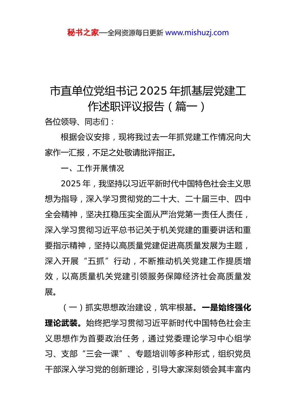 秘书之家—全网资源每日更新 www.mishuzj.com2025 年度党组织、党支部书记抓基层党建工作述职评议报告汇编(12 篇)目录1.市直单位党组书记 2025 年抓基层党建工作述职22.市局党支部书记 2025 年度抓基层党建工作述职....83.2025 年度党组织书记抓基层党建工作述职评议. .134.2025 年度党支部书记抓基层党建工作述职报告. .205.市政府办公室党组书记抓基层党建工作述职........276.集团党委 2025 年度书记抓基层党建工作述职.....357.街道党工委书记 2025 年度抓基层党建工作述职..408.2025 年度基层党组织书记抓基层党建述职评议. .469.区委书记 2025 年抓基层党建工作述职报告........5110.通信管理局 2025 年度书记抓基层党建工作述职6011.公司 2025 年度党委书记抓基层党建工作述职...6512.林业和草原局书记抓基层党建工作述职报告......71秘书之家—全网资源每日更新 www.mishuzj.com市直单位党组书记 2025 年抓基层党建工作述职评议报告(篇一)各位领导、同志们:根据会议安排,现将我过去一年抓党建工作情况向大家作一汇报,不足之处敬请批评指正。一、工作开展情况2025 年,我坚持以习近平新时代中国特色社会主义思想为指导,深入学习贯彻党的二十大、二十届三中、四中全会精神,坚决扛稳压实全面从严治党第一责任人责任,深入学习贯彻习近平总书记关于机关党建的重要讲话和重要指示精神,坚持以高质量党建促进高质量发展为主题,深入开展“五抓”行动,不断推动机关党建工作提质增效,以高质量机关党建引领服务保障经济社会高质量发展。(一)抓实思想政治建设,筑牢根基。一是始终强化理论武装。始终把学习贯彻习近平新时代中国特色社会主义思想作为首要政治任务,通过党委理论学习中心组学习、支部“三会一课”、专题培训等多种形式,组织党员干部深入学习党的创新理论,引导大家深刻领会其丰富内秘书之家—全网资源每日更新 www.mishuzj.com涵和精神实质,切实增强“四个意识”、坚定“四个自信”、做到“两个维护”。全年党委理论学习中心组集中学习 12 次,专题研讨 6 次,党员干部的政治素养和理论水平得到显著提升。二是扎实开展深入贯彻中央八项规定精神学习教育。按照上级统一部署,精心组织开展学习教育,制定详细工作方案,明确目标任务和时间节点。通过举办专题培训、警示教育、研讨交流等活动,推动学习教育走深走实,引导党员干部清廉从政、清白做人。三是严肃党内政治生活。严格执行《关于新形势下党内政治生活的若干准则》,认真落实“三会一课”、民主生活会、组织生活会、民主评议党员等制度,切实增强党内政治生活的政治性、时代性、原则性、战斗性。党委班子成员带头参加双重组织生活,以普通党员身份接受党组织和党员群众的监督,为全体党员作出了表率。通过严肃认真的党内政治生活,党员干部的党性修养得到锤炼,党内政治生态更加风清气正。(二)抓深基层组织建设,夯实基础。一是优化组织设置。结合单位实际,对基层党组织进行调整优化,确保党组织设置更加科学合理,实现党的组织和党的工作全覆盖。加强对基层党组织的分类指导,根据不同类型党组织的特点和职责,制定个性化的工作目标和任务,推动基层秘书之家—全网资源每日更新 www.mishuzj.com党组织建设全面进步、全面过硬。二是加强支部建设。以提升组织力为重点,突出政治功能,全面加强党支部标准化规范化建设。深入开展“五好党支部”创建活动,通过抓班子、带队伍、强阵地、建机制等措施,不断提升党支部建设质量。定期开展党支部书记培训,提高党支部书记抓党建工作的能力和水平。同时,加强对党支部工作的考核评价,将考核结果与党支部书记的评先评优、绩效考核挂钩,充分调动党支部书记的工作积极性和主动性。三是做好党员工作。坚持把政治标准放在首位,严格党员发展程序,确保新发展党员质量。加强对入党积极分子的教育培养,定期开展谈心谈话,及时掌握他们的思想动态,引导他们积极向党组织靠拢。全年共发展党员 13 名,为党组织注入了新的活力。同时,加强对党员的日常教育管理,建立健全党员积分制管理制度,通过量化考核,激励党员充分...