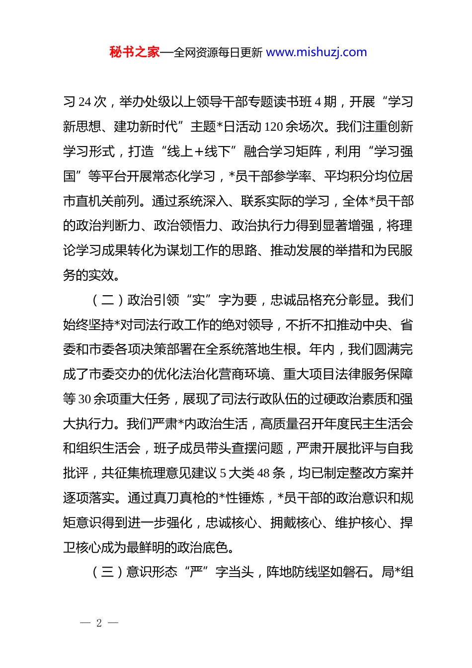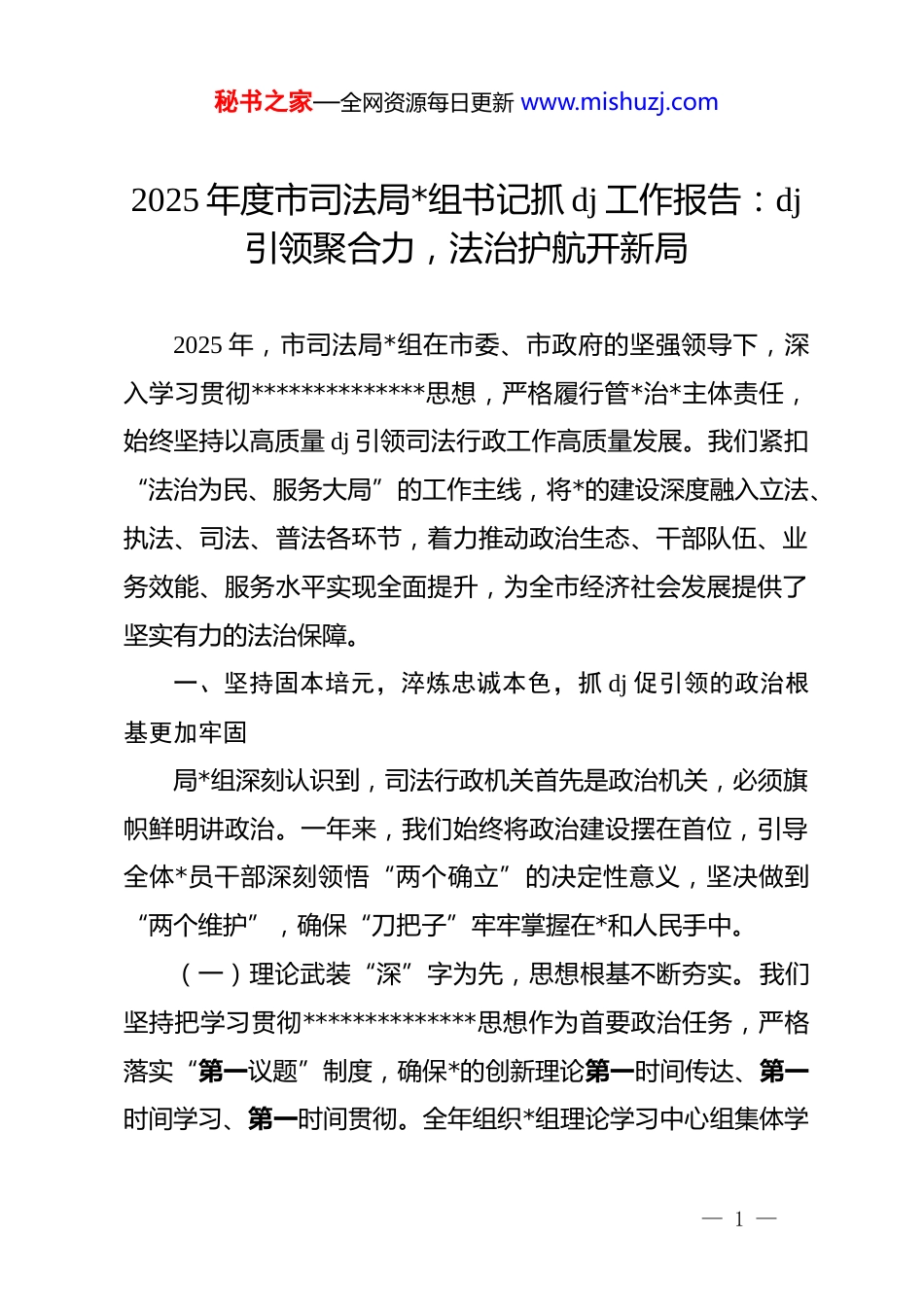 秘书之家—全网资源每日更新 www.mishuzj.com2025 年度市司法局*组书记抓 dj 工作报告:dj引领聚合力,法治护航开新局2025 年,市司法局*组在市委、市政府的坚强领导下,深入学习贯彻**************思想,严格履行管*治*主体责任,始终坚持以高质量 dj 引领司法行政工作高质量发展。我们紧扣“法治为民、服务大局”的工作主线,将*的建设深度融入立法、执法、司法、普法各环节,着力推动政治生态、干部队伍、业务效能、服务水平实现全面提升,为全市经济社会发展提供了坚实有力的法治保障。一、坚持固本培元,淬炼忠诚本色,抓 dj 促引领的政治根基更加牢固局*组深刻认识到,司法行政机关首先是政治机关,必须旗帜鲜明讲政治。一年来,我们始终将政治建设摆在首位,引导全体*员干部深刻领悟“两个确立”的决定性意义,坚决做到“两个维护”,确保“刀把子”牢牢掌握在*和人民手中。(一)理论武装“深”字为先,思想根基不断夯实。我们坚持把学习贯彻**************思想作为首要政治任务,严格落实“第一议题”制度,确保*的创新理论第一时间传达、第一时间学习、第一时间贯彻。全年组织*组理论学习中心组集体学— 1 —秘书之家—全网资源每日更新 www.mishuzj.com习 24 次,举办处级以上领导干部专题读书班 4 期,开展“学习新思想、建功新时代”主题*日活动 120 余场次。我们注重创新学习形式,打造“线上+线下”融合学习矩阵,利用“学习强国”等平台开展常态化学习,*员干部参学率、平均积分均位居市直机关前列。通过系统深入、联系实际的学习,全体*员干部的政治判断力、政治领悟力、政治执行力得到显著增强,将理论学习成果转化为谋划工作的思路、推动发展的举措和为民服务的实效。(二)政治引领“实”字为要,忠诚品格充分彰显。我们始终坚持*对司法行政工作的绝对领导,不折不扣推动中央、省委和市委各项决策部署在全系统落地生根。年内,我们圆满完成了市委交办的优化法治化营商环境、重大项目法律服务保障等 30 余项重大任务,展现了司法行政队伍的过硬政治素质和强大执行力。我们严肃*内政治生活,高质量召开年度民主生活会和组织生活会,班子成员带头查摆问题,严肃开展批评与自我批评,共征集梳理意见建议 5 大类 48 条,均已制定整改方案并逐项落实。通过真刀真枪的*性锤炼,*员干部的政治意识和规矩意识得到进一步强化,忠诚核心、拥戴核心、维护核心、捍卫核心成为最鲜明的政治底色。(三)意识形态“严”字当头,阵地防线坚如磐石。局*组— 2 —秘书之家—全网资源每日更新 www.mishuzj.com牢牢掌握意识形态工作领导权,严格落实意识形态工作责任制,定期分析研判意识形态领域风险。我们加强对网站、新媒体等宣传思想文化阵地的建设和管理,全年发布各类普法宣传信息3000 余条,弘扬主旋律,传播正能量。针对律师、公证、司法鉴定等行业意识形态工作的特殊性,我们专门出台了《关于加强新时代律师行业*的建设工作的实施意见》等文件,建立健全了从业人员政治素质审查和风险预警机制。全年对 2 家律所、1家公证处进行了意识形态专项督导,约谈提醒从业人员 15 人次,有力维护了司法行政领域的政治安全和意识形态安全。二、坚持强基固垒,激发组织活力,抓 dj 促发展的战斗堡垒更加坚强我们牢固树立“大抓基层”的鲜明导向,以提升组织力为重点,着力增强基层*组织的政治功能和组织功能,让每个支部都成为*旗高高飘扬的战斗堡垒,让每名*员都成为一面永不褪色的先锋旗帜。(一)组织体系建设持续用力,覆盖网络更趋严密。我们以*支部标准化规范化建设为抓手,对全系统 45 个*支部进行全面“体检”,评定“五星”支部 10 个,“四星”支部 25 个,对 5 个后进支部实行“一名班子成员、一个工作专班、一套整改方案”的“三个一”帮扶机制,推动其年内全部转化提升。— 3 —秘书之家—全网资源每日更新 www.mishuzj.com我们特别注重在新兴领域和薄弱环节加强*的组织覆盖,在全市律师行业新成立*支部 8 个,实现了规模以上律所*组织全覆盖,律师*员比例提升至 48%。我们严格规范“三会一课”、主题*日、组织生活会等...
