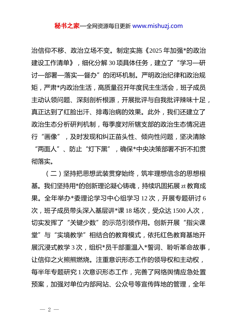 秘书之家—全网资源每日更新 www.mishuzj.com2025 年履行全面从严治*主体责任情况的报告:淬炼鲜明政治品格激扬清廉实干之风2025 年,*委坚持以**************思想为指导,深入贯彻*的二十大精神及*中央关于全面从严治*的战略部署,深刻领悟“两个确立”的决定性意义,增强“四个意识”、坚定“四个自信”、做到“两个维护”。一年来,我们紧紧扭住主体责任这个“牛鼻子”,坚持管*治*不放松、正风肃纪不停步、反腐惩恶不手软,将*的建设与中心工作同谋划、同部署、同考核,推动全面从严治*向基层延伸、向纵深发展,不仅巩固了风清气正的政治生态,更为各项事业的高质量发展提供了坚强有力的政治引领和纪律保障。一、聚焦主责主业,在深学笃行中把稳“方向盘”过去的一年,*委始终把抓好 dj 作为最大的政绩,强化守土有责、守土担责、守土尽责的政治担当,以钉钉子精神推动全面从严治*各项任务落地见效。(一)坚持把政治建设摆在首位,铸牢对*忠诚的政治灵魂。我们始终把*的政治建设作为根本性建设,严格执行“第一议题”制度,全年召开*委会 24 次,均把学习贯彻******最新重要讲话和****批示精神作为首要议题,确保政治方向不偏、政— 1 —秘书之家—全网资源每日更新 www.mishuzj.com治信仰不移、政治立场不变。制定实施《2025 年加强*的政治建设工作清单》,细化分解 30 项具体任务,建立了“学习—研讨—部署—落实—督办”的闭环机制。严明政治纪律和政治规矩,严肃*内政治生活,高质量召开年度民主生活会,班子成员主动认领问题、深刻剖析根源,开展批评与自我批评辣味十足,真正达到了红脸出汗、排毒治病的效果。此外,我们还建立了政治生态分析研判机制,每季度对所辖支部的政治生态情况进行“画像”,及时发现和纠正苗头性、倾向性问题,坚决清除“两面人”、防止“灯下黑”,确保*中央决策部署不折不扣贯彻落实。(二)坚持把思想武装贯穿始终,筑牢理想信念的思想根基。我们坚持用*的创新理论凝心铸魂,持续巩固拓展 zt 教育成果。全年举办*委理论学习中心组学习 12 次,开展专题研讨 6次,班子成员带头深入基层讲*课 18 场次,受众达 1500 人次,切实发挥了“关键少数”的示范引领作用。创新开展“指尖课堂”与“实境教学”相结合的教育模式,依托红色教育基地开展沉浸式教学 3 次,组织*员干部重温入*誓词、聆听革命故事,让信仰之火熊熊燃烧。注重意识形态工作的领导权和主动权,每半年专题研究 1 次意识形态工作,完善了网络舆情应急处置预案,加强对单位内部网站、公众号等宣传阵地的管理,全年— 2 —秘书之家—全网资源每日更新 www.mishuzj.com审核发布各类信息 600 余条,未发生任何意识形态领域安全事件。通过全方位、多层次的学习教育,广大*员干部的政治判断力、政治领悟力、政治执行力得到了显著提升。(三)坚持把强基固本作为关键,打造坚强有力的战斗堡垒。我们牢固树立“*的一切工作到支部”的鲜明导向,深入实施“基层 dj 质量提升年”行动。严格落实《中国共产*支部工作条例(试行)》,规范开展“三会一课”、主题*日、组织生活会等制度,全年各支部累计开展主题*日活动 120 余次,切实让组织生活严起来、实起来、活起来。大力推进*支部标准化规范化建设,通过选优配强*务干部队伍,开展*务工作者专业能力培训班 2 期,培训人数达 120 人,有效解决了基层*务工作“谁来干”“怎么干”的问题。严把*员发展“入口关”,注重在生产一线、青年骨干和高知群体中发展*员,全年新发展*员15 名,按期转正 12 名,*员队伍结构进一步优化。同时,深入开展“一支部一品牌”创建活动,涌现出 3 个特色鲜明、成效显著的样板*支部,有效激活了基层 dj 的“一池春水”。(四)坚持把作风建设抓在经常,弘扬真抓实干的优良作风。我们锲而不舍落实中央八项规定及其实施细则精神,紧盯“四风”新表现新动向,开展违规吃喝、违规收送礼品礼金等专项整治行动。全年开展作风纪律突击检查 8 次,通报批评作— 3 —秘书之家—全网资源每日更新 www.mishuzj.com风不实人员 5 人次,释放了“越往后执纪越严”的强烈...