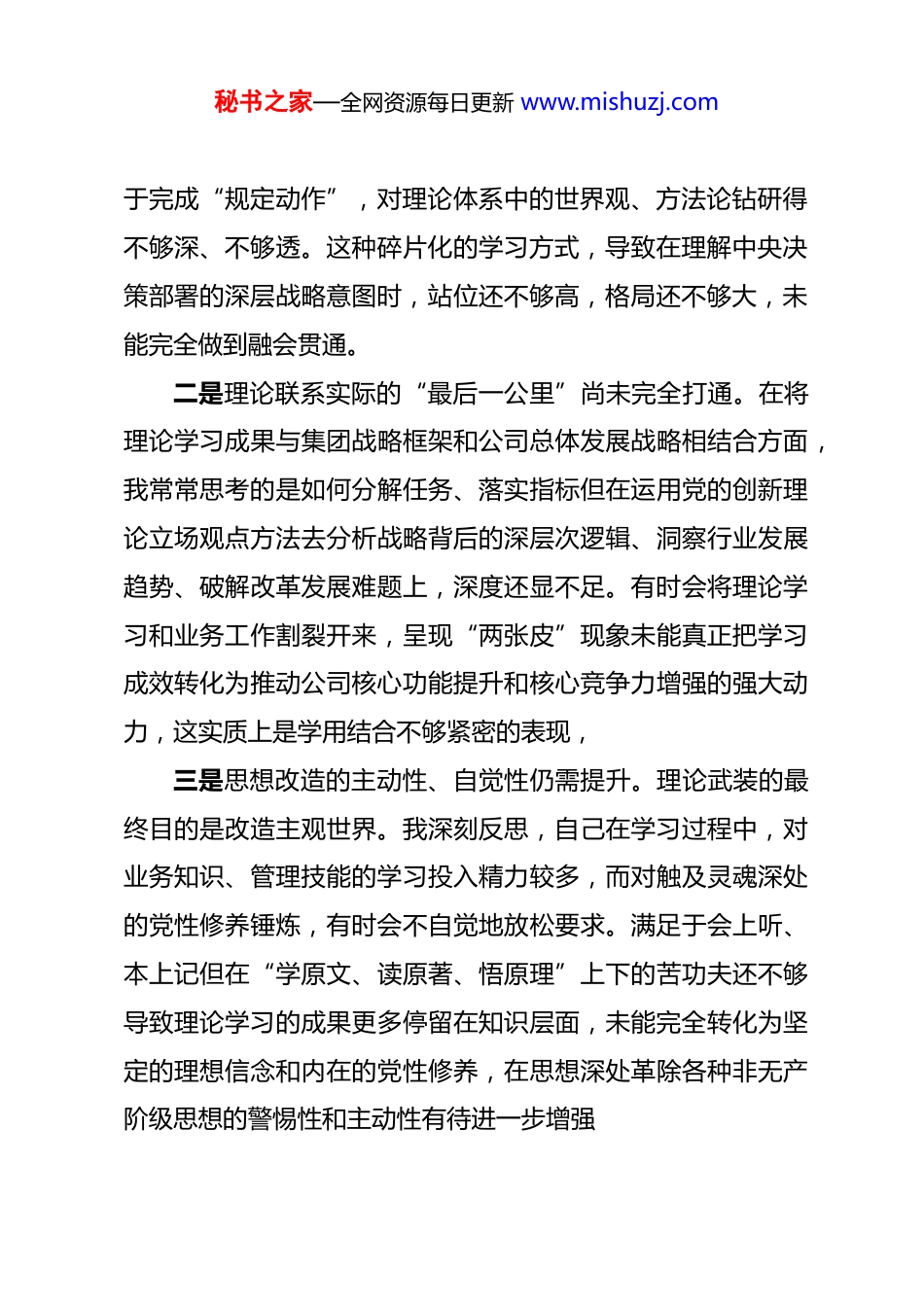 秘书之家—全网资源每日更新 www.mishuzj.com单位民主生活会会前专题学习会发言材料 同志们:根据单位安排,今天我们召开民主生活会会前专题学习会刚才,我们共同学习了相关重要精神。这次学习研讨,既是为开好年度民主生活会筑牢思想基础的“准备课”,更是一次深刻的党性教育和思想洗礼。下面,结合我个人的学习思考和思想工作实际,作一个简要的研讨发言,不妥之处,请同志们批评指正一、深化思想认识在理论武装中筑牢政治忠诚思想是行动的先导,理论是实践的指南。只有理论上清醒政治上才能坚定。通过近期系统性的学习,我深刻认识到,作为一名领导干部,必须把理论武装摆在首位,不断从党的创新理论中汲取政治营养和精神力量。反思自身,我在理论学习的深度广度和转化效率上仍有差距。一是理论学习的系统性、贯通性有待加强。在日常工作中,我对习近平总书记关于本行业本领域的重要指示批示精神能够做到及时跟进、认真学习,但对于党的创新理论,特别是党的二十大及二十届四中全会精神的系统性研读和整体性把握还不够。有时存在“急用先学、现学现用”的实用主义倾向,满足秘书之家—全网资源每日更新 www.mishuzj.com于完成“规定动作”,对理论体系中的世界观、方法论钻研得不够深、不够透。这种碎片化的学习方式,导致在理解中央决策部署的深层战略意图时,站位还不够高,格局还不够大,未能完全做到融会贯通。二是理论联系实际的“最后一公里”尚未完全打通。在将理论学习成果与集团战略框架和公司总体发展战略相结合方面,我常常思考的是如何分解任务、落实指标但在运用党的创新理论立场观点方法去分析战略背后的深层次逻辑、洞察行业发展趋势、破解改革发展难题上,深度还显不足。有时会将理论学习和业务工作割裂开来,呈现“两张皮”现象未能真正把学习成效转化为推动公司核心功能提升和核心竞争力增强的强大动力,这实质上是学用结合不够紧密的表现,三是思想改造的主动性、自觉性仍需提升。理论武装的最终目的是改造主观世界。我深刻反思,自己在学习过程中,对业务知识、管理技能的学习投入精力较多,而对触及灵魂深处的党性修养锤炼,有时会不自觉地放松要求。满足于会上听、本上记但在“学原文、读原著、悟原理”上下的苦功夫还不够导致理论学习的成果更多停留在知识层面,未能完全转化为坚定的理想信念和内在的党性修养,在思想深处革除各种非无产阶级思想的警惕性和主动性有待进一步增强秘书之家—全网资源每日更新 www.mishuzj.com二、勇于自我革命在检视剖析中强化责任担当召开民主生活会的目的,就是发扬自我革命精神,坚持问题导向,深入检视剖析。对照习近平总书记关于加强党的作风建设的重要论述精神和锲而不舍落实中央八项规定精神的要求,我感到在一些方面,标准还不够高,要求还不够严一是在工作作风的深入程度上存在差距。虽然能够坚持深入基层一线,但有时调研存在“走马观花”的现象,带着问题去、带着答案回的闭环落实做得不够好。面对一些长期存在的“老大难”问题,有时习惯于听取汇报、开会研究,但沉下心来、扑下身子,“解剖麻雀”式的深度剖析不够未能完全做到从群众的视角去发现问题的本质。这反映出我在力戒形式主义、官僚主义方面,离“实、细、深”的要求还有距离,密切联系群众的优良传统发扬得还不够。二是在锐意进取的创新精神上存在不足。**集团和公司都把科技创新和产业创新摆在了前所未有的高度。对照这一要求,我反思自己在分管工作中,有时思想还不够解放,存在一定的路径依赖。对于一些颠覆性技术和前沿商业模式,虽然保持关注,但在主动谋划、大胆尝试、推动落地方面,魄力还不够大,有时会因为担心风险、害怕失败而瞻前顾后。这种求稳怕乱的心态实质上是担当精神和斗争精神有所弱化,不利于公司在新秘书之家—全网资源每日更新 www.mishuzj.com一轮科技革命和产业变革中抢占先机、赢得主动。三是在履行“一岗双责”的均衡性上存在短板。作为班子成员,我深知必须同时抓好业务工作和党风廉政建设。但在实际工作中,有时会不自觉地把更多精力投入到抓生产、促进度、保增长等“硬指标”上,认为只要业务搞好了,就是最大的...