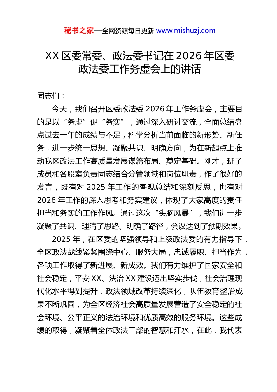 秘书之家—全网资源每日更新 www.mishuzj.comXX 区委常委、政法委书记在 2026 年区委政法委工作务虚会上的讲话同志们:今天,我们召开区委政法委 2026 年工作务虚会,主要目的是以“务虚”促“务实”,通过深入研讨交流,全面总结盘点过去一年的成绩与不足,科学分析当前面临的新形势、新任务,进一步统一思想、凝聚共识、明确方向,为在新起点上推动我区政法工作高质量发展谋篇布局、奠定基础。刚才,班子成员和各股室负责同志结合分管领域和岗位职责,作了很好的发言,既有对 2025 年工作的客观总结和深刻反思,也有对2026 年工作的深入思考和务实建议,体现了大家高度的责任担当和务实的工作作风。通过这次“头脑风暴”,我们进一步凝聚了共识、理清了思路、明确了路径,会议达到了预期效果。2025 年,在区委的坚强领导和上级政法委的有力指导下,全区政法战线紧紧围绕中心、服务大局,忠诚履职、担当作为,各项工作取得了新进展、新成效。我们有力维护了国家安全和社会稳定,平安 XX、法治 XX 建设迈出坚实步伐,社会治理现代化水平得到提升,政法领域改革持续深化,队伍教育整治成果不断巩固,为全区经济社会高质量发展营造了安全稳定的社会环境、公平正义的法治环境和优质高效的服务环境。这些成绩的取得,凝聚着全体政法干部的智慧和汗水,在此,我代表秘书之家—全网资源每日更新 www.mishuzj.com区委政法委,向大家表示衷心的感谢!在肯定成绩的同时,我们也要清醒地认识到工作中存在的短板和不足,比如:应对风险挑战的前瞻性、精准性有待加强;基层社会治理的精细化、智能化水平有待提升;政法公共服务与人民群众的新期待相比还有差距;个别干警的能力素质仍需进一步提高等等。这些问题,需要我们高度重视,并在今后的工作中切实加以解决。同志们,2026 年是实施“十四五”规划的关键一年,更是“十五五”规划的开局起步之年,做好全年政法工作意义重大、责任重大。当前,世界百年未有之大变局加速演进,我国发展进入战略机遇和风险挑战并存、不确定难预料因素增多的时期。具体到我们 XX 区,经济社会发展转型升级步伐加快,各种深层次矛盾风险叠加显现,政法工作面临的环境更为复杂严峻。同时,人民群众对民主、法治、公平、正义、安全、环境等方面的要求日益增长,对政法工作提出了新的更高标准。面对新形势、新任务、新挑战,我们必须保持清醒头脑,增强忧患意识,树立底线思维,准确识变、科学应变、主动求变,牢牢把握政法工作现代化的本质要求,以更高的政治站位、更强的历史主动、更实的工作举措,奋力开创 XX 政法工作新局面。做好 2026 年以及今后一个时期的政法工作,关键在于深刻把握和处理好“守正”与“创新”的辩证关系。守正是根基,秘书之家—全网资源每日更新 www.mishuzj.com创新是动力,二者相辅相成、缺一不可。下面,我围绕“守正创新,推动 XX 政法工作高质量发展”这个主题,讲几点意见。一、坚守正道、固本培元,牢牢把握政法工作的正确政治方向守正是政法工作的生命线,是确保政法事业行稳致远的根本基石。任何时候、任何情况下,我们都必须把“守正”摆在首位。一要旗帜鲜明讲政治,永葆对党忠诚的政治本色。政法机关首先是政治机关,政治属性是第一属性。全体政法干部必须深刻领悟“两个确立”的决定性意义,增强“四个意识”、坚定“四个自信”、做到“两个维护”,始终在思想上政治上行动上同党中央保持高度一致。要毫不动摇地坚持党对政法工作的绝对领导,将《中国共产党政法工作条例》作为根本遵循,不折不扣地把党的路线方针政策和各项决策部署贯彻到政法工作全过程、各方面。要不断提高政治判断力、政治领悟力、政治执行力,善于从政治上看问题、办案件、抓工作,确保政法工作始终沿着正确方向前进。要严守政治纪律和政治规矩,决不允许对党中央的决策部署口是心非、阳奉阴违,确保“刀把子”牢牢掌握在党和人民手中。二要坚定不移厉法治,维护社会公平正义的核心价值。公平正义是政法工作的生命线,也是法治建设的核心追求。我们必须把促进社会公平正义作为政法工作的出发点和落脚点。要秘书之家—全网资源...