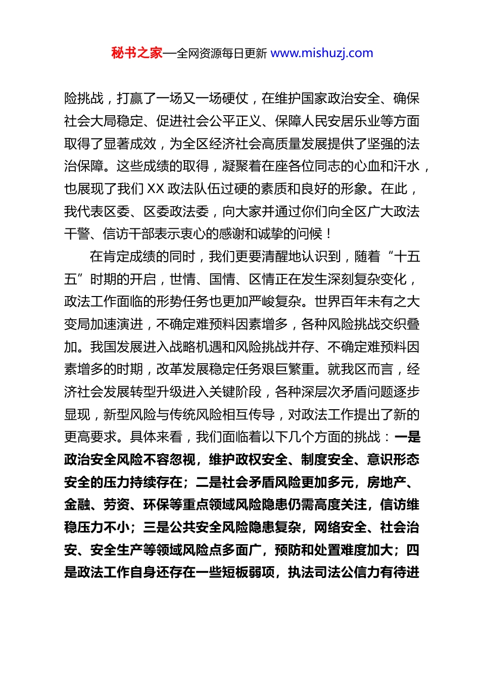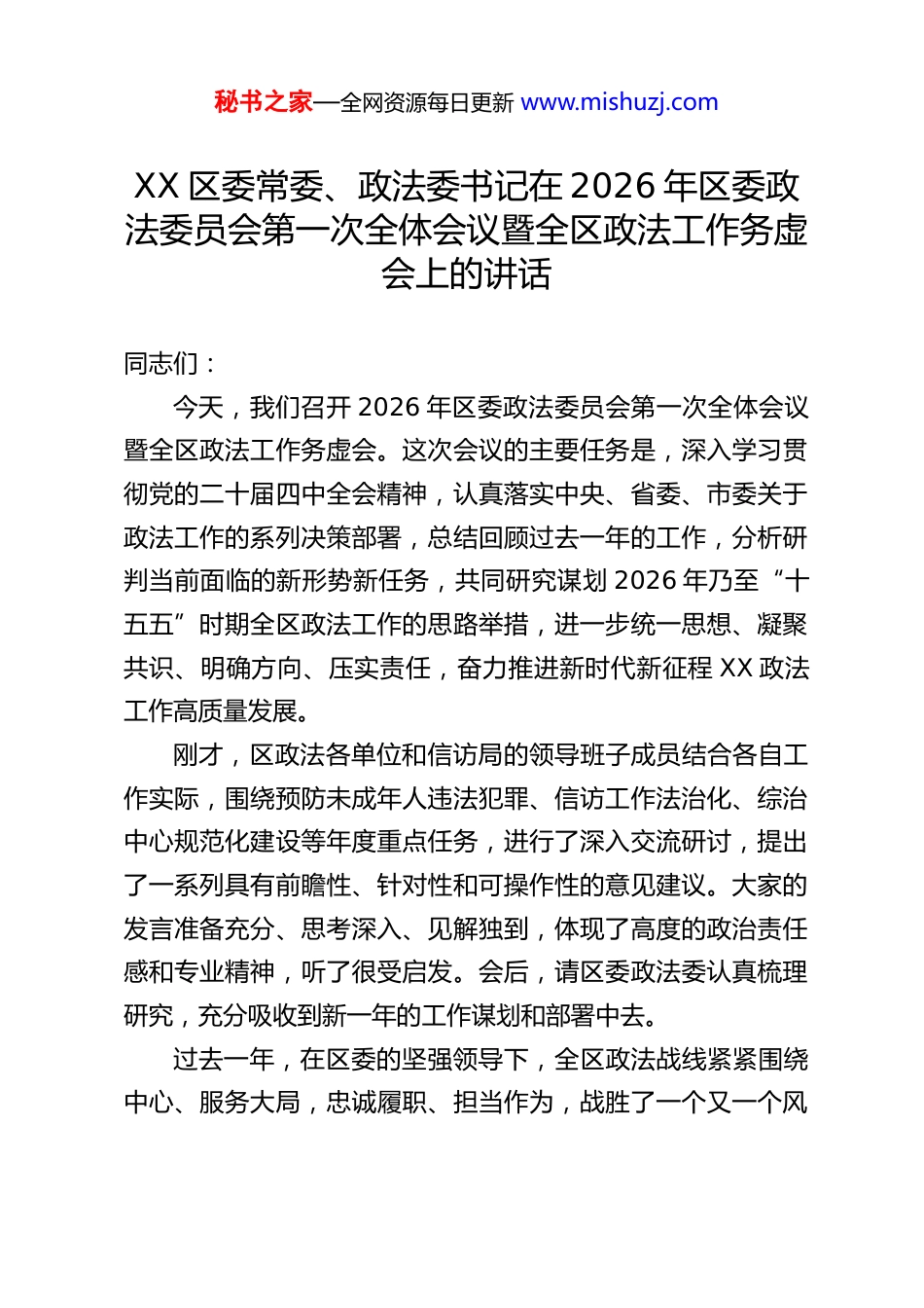 秘书之家—全网资源每日更新 www.mishuzj.comXX 区委常委、政法委书记在 2026 年区委政法委员会第一次全体会议暨全区政法工作务虚会上的讲话同志们:今天,我们召开 2026 年区委政法委员会第一次全体会议暨全区政法工作务虚会。这次会议的主要任务是,深入学习贯彻党的二十届四中全会精神,认真落实中央、省委、市委关于政法工作的系列决策部署,总结回顾过去一年的工作,分析研判当前面临的新形势新任务,共同研究谋划 2026 年乃至“十五五”时期全区政法工作的思路举措,进一步统一思想、凝聚共识、明确方向、压实责任,奋力推进新时代新征程 XX 政法工作高质量发展。刚才,区政法各单位和信访局的领导班子成员结合各自工作实际,围绕预防未成年人违法犯罪、信访工作法治化、综治中心规范化建设等年度重点任务,进行了深入交流研讨,提出了一系列具有前瞻性、针对性和可操作性的意见建议。大家的发言准备充分、思考深入、见解独到,体现了高度的政治责任感和专业精神,听了很受启发。会后,请区委政法委认真梳理研究,充分吸收到新一年的工作谋划和部署中去。过去一年,在区委的坚强领导下,全区政法战线紧紧围绕中心、服务大局,忠诚履职、担当作为,战胜了一个又一个风秘书之家—全网资源每日更新 www.mishuzj.com险挑战,打赢了一场又一场硬仗,在维护国家政治安全、确保社会大局稳定、促进社会公平正义、保障人民安居乐业等方面取得了显著成效,为全区经济社会高质量发展提供了坚强的法治保障。这些成绩的取得,凝聚着在座各位同志的心血和汗水,也展现了我们 XX 政法队伍过硬的素质和良好的形象。在此,我代表区委、区委政法委,向大家并通过你们向全区广大政法干警、信访干部表示衷心的感谢和诚挚的问候!在肯定成绩的同时,我们更要清醒地认识到,随着“十五五”时期的开启,世情、国情、区情正在发生深刻复杂变化,政法工作面临的形势任务也更加严峻复杂。世界百年未有之大变局加速演进,不确定难预料因素增多,各种风险挑战交织叠加。我国发展进入战略机遇和风险挑战并存、不确定难预料因素增多的时期,改革发展稳定任务艰巨繁重。就我区而言,经济社会发展转型升级进入关键阶段,各种深层次矛盾问题逐步显现,新型风险与传统风险相互传导,对政法工作提出了新的更高要求。具体来看,我们面临着以下几个方面的挑战:一是政治安全风险不容忽视,维护政权安全、制度安全、意识形态安全的压力持续存在;二是社会矛盾风险更加多元,房地产、金融、劳资、环保等重点领域风险隐患仍需高度关注,信访维稳压力不小;三是公共安全风险隐患复杂,网络安全、社会治安、安全生产等领域风险点多面广,预防和处置难度加大;四是政法工作自身还存在一些短板弱项,执法司法公信力有待进秘书之家—全网资源每日更新 www.mishuzj.com一步提升,基层基础有待进一步夯实,政法队伍能力素质与新形势新任务的要求还有不适应之处。面对这些风险挑战,我们必须增强忧患意识,树立底线思维,发扬斗争精神,提高斗争本领,切实履行好维护国家安全、社会安定、人民安宁的重大责任。做好 2026 年以及“十五五”时期的政法工作,责任重大,使命光荣。我们必须坚持以党的二十届四中全会精神为指引,牢牢把握政法工作的正确政治方向,紧紧围绕推进中国式现代化这个最大的政治,聚焦主责主业,锐意改革创新,努力建设更高水平的平安 XX、法治 XX。下面,结合大家的讨论,我讲三点意见,也是对全区政法各单位领导班子成员提出的要求:一、铸牢政治忠诚,在服务大局中彰显担当作为政法机关首先是政治机关,政治性是第一属性,讲政治是第一要求。领导班子作为“关键少数”,必须带头提高政治站位,深刻领悟“两个确立”的决定性意义,增强“四个意识”、坚定“四个自信”、做到“两个维护”,始终在思想上政治上行动上同党中央保持高度一致。一要持续强化理论武装,把稳思想之舵。要坚持把学懂弄通做实党的创新理论作为首要政治任务,特别是要深入学习领会党的二十届四中全会关于坚持和完善中国特色社会主义法治体系、推进国家治理体系和治理能力现代化的重大部署,不断提高政治判断力、...