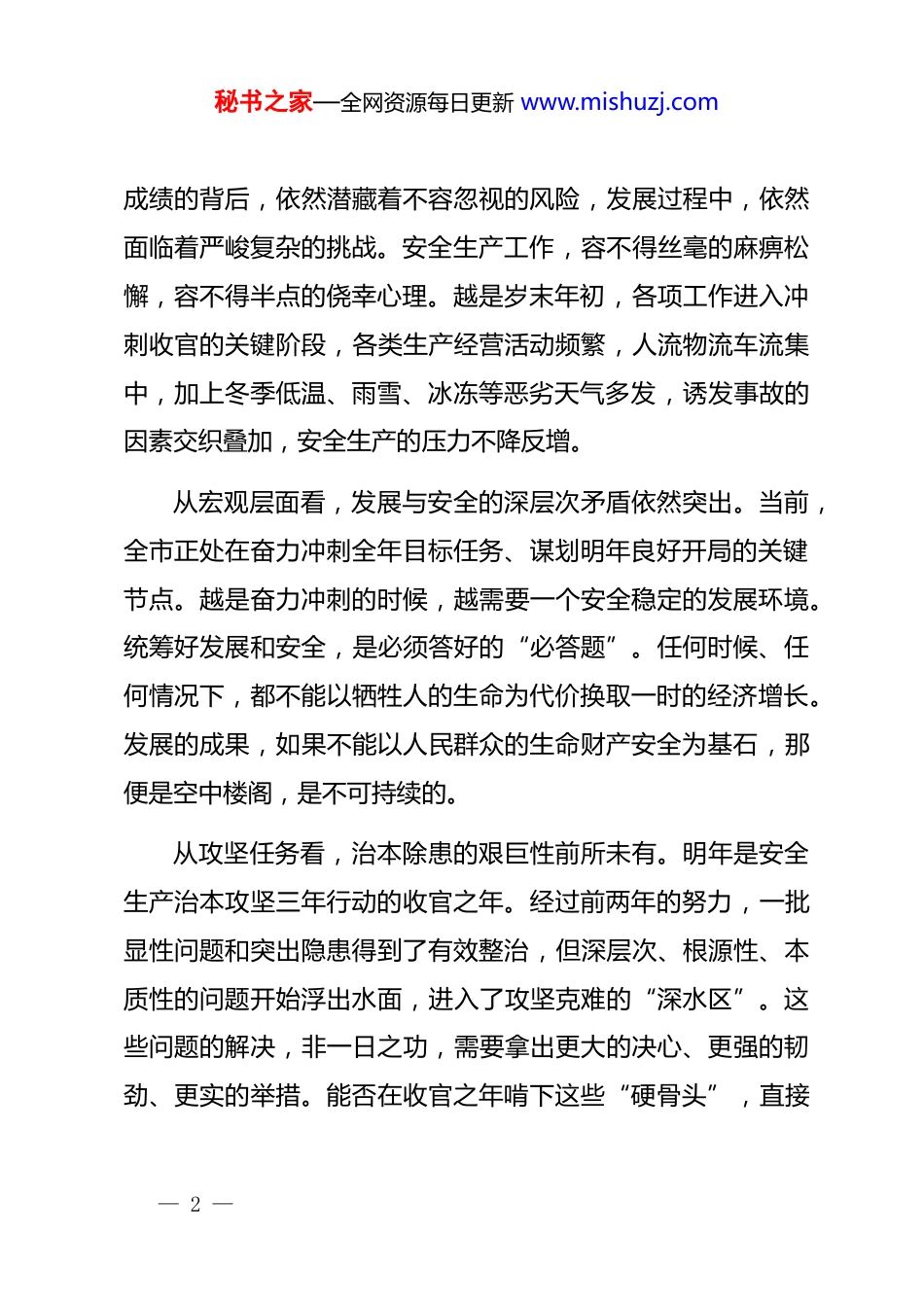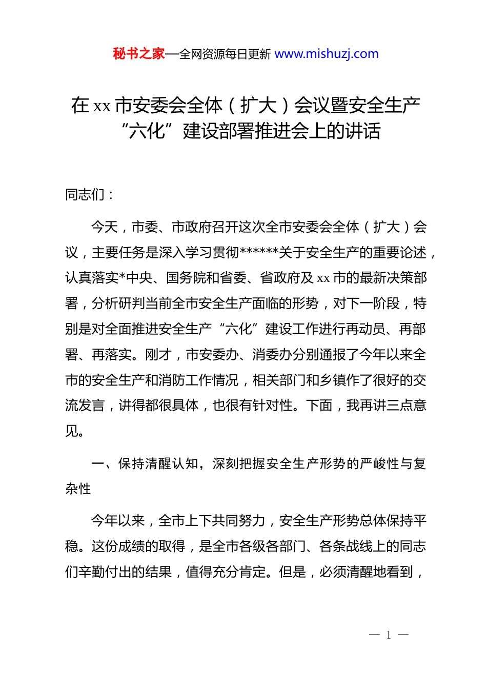 秘书之家—全网资源每日更新 www.mishuzj.com在 xx 市安委会全体(扩大)会议暨安全生产“六化”建设部署推进会上的讲话同志们:今天,市委、市政府召开这次全市安委会全体(扩大)会议,主要任务是深入学习贯彻******关于安全生产的重要论述,认真落实*中央、国务院和省委、省政府及 xx 市的最新决策部署,分析研判当前全市安全生产面临的形势,对下一阶段,特别是对全面推进安全生产“六化”建设工作进行再动员、再部署、再落实。刚才,市安委办、消委办分别通报了今年以来全市的安全生产和消防工作情况,相关部门和乡镇作了很好的交流发言,讲得都很具体,也很有针对性。下面,我再讲三点意见。一、保持清醒认知,深刻把握安全生产形势的严峻性与复杂性今年以来,全市上下共同努力,安全生产形势总体保持平稳。这份成绩的取得,是全市各级各部门、各条战线上的同志们辛勤付出的结果,值得充分肯定。但是,必须清醒地看到,— 1 —秘书之家—全网资源每日更新 www.mishuzj.com成绩的背后,依然潜藏着不容忽视的风险,发展过程中,依然面临着严峻复杂的挑战。安全生产工作,容不得丝毫的麻痹松懈,容不得半点的侥幸心理。越是岁末年初,各项工作进入冲刺收官的关键阶段,各类生产经营活动频繁,人流物流车流集中,加上冬季低温、雨雪、冰冻等恶劣天气多发,诱发事故的因素交织叠加,安全生产的压力不降反增。从宏观层面看,发展与安全的深层次矛盾依然突出。当前,全市正处在奋力冲刺全年目标任务、谋划明年良好开局的关键节点。越是奋力冲刺的时候,越需要一个安全稳定的发展环境。统筹好发展和安全,是必须答好的“必答题”。任何时候、任何情况下,都不能以牺牲人的生命为代价换取一时的经济增长。发展的成果,如果不能以人民群众的生命财产安全为基石,那便是空中楼阁,是不可持续的。从攻坚任务看,治本除患的艰巨性前所未有。明年是安全生产治本攻坚三年行动的收官之年。经过前两年的努力,一批显性问题和突出隐患得到了有效整治,但深层次、根源性、本质性的问题开始浮出水面,进入了攻坚克难的“深水区”。这些问题的解决,非一日之功,需要拿出更大的决心、更强的韧劲、更实的举措。能否在收官之年啃下这些“硬骨头”,直接— 2 —秘书之家—全网资源每日更新 www.mishuzj.com关系到治本攻坚行动的最终成效,关系到全市本质安全水平的根本提升。从思想认识看,部分领域“时紧时松”的顽疾依然存在。在持续高压的态势下,一些干部和企业负责人可能会产生“歇歇脚”“松口气”的念头,认为风险隐患已经排查得差不多了,安全投入也到位了,可以高枕无忧了。这种思想上的“疲劳期”和行动上的“懈怠期”是安全生产最大的敌人。事故的发生,往往就在思想防线被突破的一瞬间。全市各级领导干部,必须强化“时时放心不下”的责任感和“事事紧抓不放”的执行力,时刻紧绷安全生产这根弦,将安全责任扛在肩上、抓在手上、落在行动上。二、聚焦核心任务,以系统思维全力推进安全生产“六化”建设推进安全生产治理体系和治理能力现代化,是实现高质量发展和高水平安全良性互动的根本路径。省委、省政府部署的安全生产“六化”建设,是当前和今后一个时期做好安全生产工作的总抓手。刚才会议解读了《贯彻落实安全生产“六化”建设实施方案(试行)任务分解表》,各区镇(街道)、各部门要不折不扣抓好贯彻落实。推进“六化”建设,不能满足于— 3 —秘书之家—全网资源每日更新 www.mishuzj.com喊口号、贴标签,必须将其作为一场深刻的、全方位的系统性变革来抓,深刻理解其内涵,精准把握其要求,确保建设工作走深走实。第一,要以责任体系化为根基,织密横向到边、纵向到底的责任网络。安全责任是安全生产的灵魂。责任不落实,一切都等于零。“六化”建设,首要是责任体系化。要持续完善“*政同责、一岗双责、齐抓共管、失职追责”的责任链条,将安全责任的压力从市级层面,一直传导到区镇(街道)、村(社区),直至企业车间、班组和一线岗位。要全面落实“管行业必须管安全、管业务必须管安全、管生产经营必须管安全”的要求,厘清并公布各部门的安全生产权责清单...