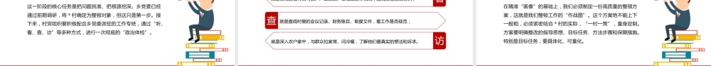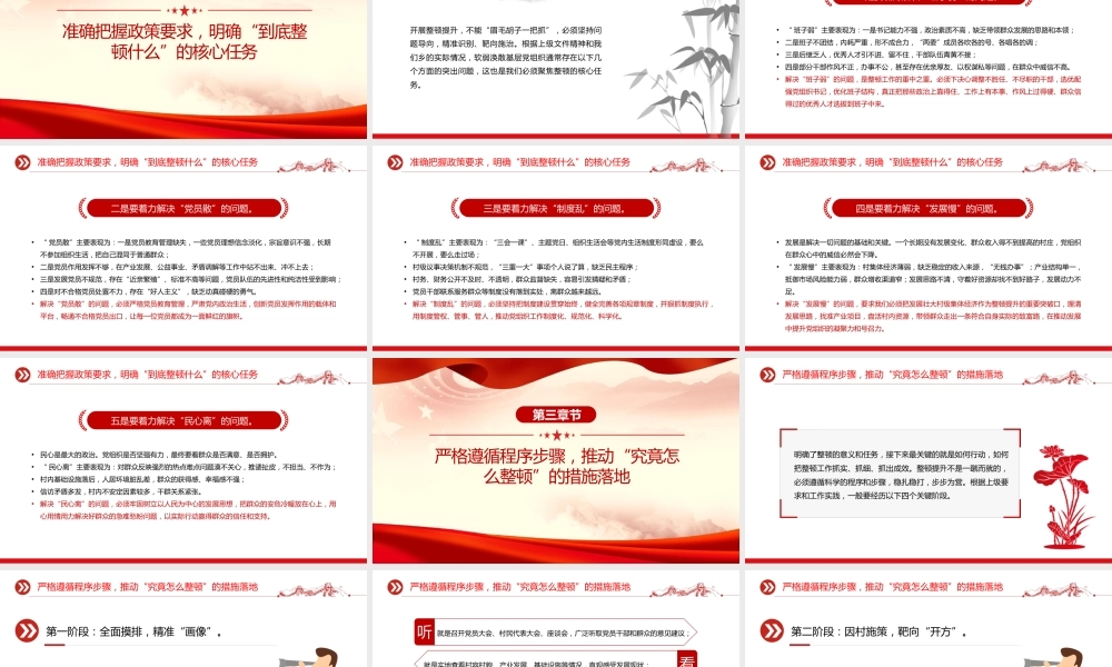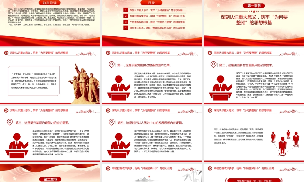加强基层组织建设,强化软弱涣散基层党组织整顿提升xxx时间:前言导读今天,我们召开这次专题党课,主要目的就是围绕软弱涣散基层党组织整顿提升这一重要课题,与大家进行一次深入的交流和探讨。这项工作,是党中央着眼于夯实党的执政根基、推进国家治理体系和治理能力现代化作出的重大部署,也是我们推动乡村全面振兴、实现高质量发展的必然要求。刚才,我看到了村容村貌的新变化,也感受到了大家干事创业的热情,这很好。但我们更要清醒地认识到,基础不牢,地动山摇。 * 村党组织被列为整顿对象,这既是压力,更是动力。希望通过今天的党课,我们能够统一思想、深化认识、明确方向、凝聚力量,共同打赢这场整顿提升的攻坚战,把我们 * 村的党组织建设成为名副其实的坚强战斗堡垒。下面,我将围绕“为什么整顿、整顿什么、怎么整顿、如何巩固”四个方面,与同志们作深入交流。目录1深刻认识重大意义,筑牢“为何要整顿”的思想根基2准确把握政策要求,明确“到底整顿什么”的核心任务3严格遵循程序步骤,推动“究竟怎么整顿”的措施落地4强化责任担当,确保“整顿成果如何巩固”的长效常治第一章节深刻认识重大意义,筑牢“为何要整顿”的思想根基“ 欲筑室者,先治其基。”基层党组织是我们党全部工作和战斗力的基础,是党在社会基层组织中的战斗堡垒,是党的执政根基所在。开展软弱涣散基层党组织整顿提升工作,绝非一时之举,也不是权宜之计,而是具有深刻战略考量和重大现实意义的政治任务。深刻认识重大意义,筑牢“为何要整顿”的思想根基第一 , 这是巩固党的执政根基的固本之举。 我们党的力量源泉在人民,执政基础在基层。一个基层党组织就是一个战斗堡垒,一名党员就是一面旗帜。如果堡垒内部松松垮垮,旗帜褪色暗淡,党的执政大厦就会面临根基不稳的风险。当前,我们正处在实现中华民族伟大复兴的关键时期,面临的内外环境复杂多变,风险挑战前所未有。越是这个时候,就越需要我们党的基层组织坚强有力,能够将党的路线方针政策不折不扣地贯彻到“最后一公里”,将广大人民群众紧密团结在党的周围。整顿软弱涣散,就是要清除我们肌体上的病灶,疏通“神经末梢”,确保党的领导如身使臂、如臂使指,坚如磐石,不可动摇。深刻认识重大意义,筑牢“为何要整顿”的思想根基第二,这是引领乡村全面振兴的必然要求。 党的二十大擘画了以中国式现代化全面推进中华民族伟大复兴的宏伟蓝图,而乡村振兴是其中的重要篇章。 2025 年的中央一号文件再次强调,要扎实推进乡村全面振兴,并明确提出要“集中整顿软弱涣散村党组织”。政策的指向性非常明确:没有一个坚强的村党组织,乡村振兴就是一句空话。产业发展谁来引领?乡风文明谁来倡导?乡村治理谁来核心?生态宜居谁来维护?这些都离不开村党组织的统筹谋划和强力推动。一个班子软弱、人心涣散的村庄,不可能有清晰的发展思路,不可能凝聚起发展的强大合力,更不可能在激烈的区域竞争中脱颖而出。因此,抓好整顿提升,就是为乡村振兴打造一个强有力的“火车头”和“主心骨”。深刻认识重大意义,筑牢“为何要整顿”的思想根基第三,这是提升基层治理能力的迫切需要。 基层是社会治理的最前沿,也是矛盾和问题的集中地。一个强大的村党组织,是基层治理的“定盘星”。它能够有效地化解邻里纠纷,调处信访矛盾,维护一方稳定;能够有效地组织群众参与村级事务管理,推进民主管理、民主监督;能够有效地抵御黑恶势力、宗族势力等不良风气的侵蚀,营造风清气正的社会环境。反之,如果党组织软弱涣散,说话没人听,办事没人跟,就容易出现管理混乱、矛盾激化、正气不彰的局面。我们整顿提升的目的,就是要强化党组织的政治功能和组织功能,使其成为领导基层治理的核心力量,带领群众把自己的家园建设得更加和谐有序、安定祥和。深刻认识重大意义,筑牢“为何要整顿”的思想根基第四,这是践行以人民为中心的发展思想内在逻辑。 我们党的根本宗旨是全心全意为人民服务。群众看我们党,最直接的就是看身边的党员干部,看村里的党组织。党组织有没有战斗力,党员干部有没有公心,能不能办实事,群众心里都有一本账。一个...