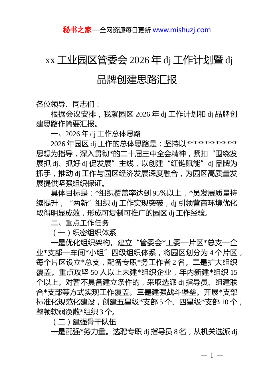 秘书之家—全网资源每日更新 www.mishuzj.comxx 工业园区管委会 2026 年 dj 工作计划暨 dj品牌创建思路汇报各位领导、同志们:根据会议安排,我就园区 2026 年 dj 工作计划和 dj 品牌创建思路作简要汇报。一、2026 年 dj 工作总体思路2026 年园区 dj 工作的总体思路是:坚持以**************思想为指导,深入贯彻*的二十届三中全会精神,紧扣“围绕发展抓 dj、抓好 dj 促发展”主线,以创建“红链赋能”dj 品牌为抓手,推动 dj 工作与园区经济发展深度融合,为园区高质量发展提供坚强组织保证。具体目标是:*组织覆盖率达到 95%以上,*员发展质量持续提升,“两新”组织 dj 工作实现突破,dj 引领营商环境优化取得明显成效,形成可复制可推广的园区 dj 工作经验。二、重点工作任务(一)织密组织体系一是优化组织架构。建立“管委会*工委—片区*总支—企业*支部—车间*小组”四级组织体系,将园区划分为 4 个片区,每个片区设立*总支,配备专职*务工作者 2 名。二是扩大组织覆盖。重点攻坚 50 人以上未建*组织企业,年内新建*组织 15个以上。对暂不具备建立条件的,采取选派 dj 指导员、组建联合*支部等方式实现工作覆盖。三是建强战斗堡垒。开展*支部标准化规范化建设,创建五星级*支部 5 个、四星级*支部 10 个,整顿软弱涣散*组织 3 个。(二)建强骨干队伍一是配强*务力量。选聘专职 dj 指导员 8 名,从机关选派 dj— 1 —秘书之家—全网资源每日更新 www.mishuzj.com联络员 20 名,实现规上企业 dj 指导全覆盖。二是培育*员骨干。实施“双培养”工程,把生产经营骨干培养成*员、把*员培养成生产经营骨干,年内发展*员 30 名以上,其中生产一线占比不低于 60%。三是抓好教育培训。举办*组织书记培训班 2 期、*务工作者培训班 4 期、*员轮训班 6 期,培训*员干部 500 人次以上。(三)创新活动载体一是开展“dj 联盟”行动。组建产业链 dj 联盟 3 个,推动上下游企业*组织结对共建,每季度开展 1 次联盟活动。二是推行“*员先锋岗”制度。在生产一线设立*员先锋岗 100 个、*员责任区 50 个,开展“*员亮身份、岗位作贡献”活动。三是搭建服务平台。建成园区*群服务中心 1 个、片区*群服务站 4 个,提供政策咨询、业务办理、技能培训等“一站式”服务。(四)服务中心大局一是助力企业纾困。建立*员干部联系企业制度,班子成员每人联系 5 家重点企业,每月走访不少于 2 次,帮助解决实际困难。二是优化营商环境。深化“dj+政务服务”,推行“帮办代办”服务,企业开办时间压缩至 0.5 个工作日,项目审批实行“拿地即开工”。三是推动招商引资。发挥*员企业家示范作用,开展“以商招商、以企引企”活动,年内引进亿元以上项目 10 个。三、dj 品牌创建(一)品牌名称经过前期调研和反复论证,拟将园区 dj 品牌命名为“红链赋能”。(二)品牌内涵“红链赋能”包含三层含义:“红”——代表*的领导、红色基因,体现 dj 工作的政治属性和价值引领。— 2 —秘书之家—全网资源每日更新 www.mishuzj.com“链”——包含三重含义:一是“组织链”,构建纵向到底、横向到边的组织体系;二是“产业链”,将 dj 工作融入产业链上下游;三是“服务链”,打造全周期、全链条的服务体系。“赋能”——体现 dj 工作对园区发展的赋能作用,推动 dj优势转化为发展优势、组织活力转化为发展动力。品牌理念概括为:以 dj“红链”串联组织链、产业链、服务链,为园区高质量发展持续赋能。(三)品牌架构围绕“红链赋能”主品牌,构建“1+4”品牌体系:“1”即 1 个主品牌——“红链赋能”。“4”即 4 个子品牌:“红链·聚力”——聚焦组织建设,织密组织体系,凝聚发展合力;“红链·领航”——聚焦队伍建设,发挥*员先锋模范作用,引领企业发展;“红链·融合”——聚焦 dj 与业务融合,推动 dj 工作与生产经营同频共振;“红链·暖企”——聚焦服务企业,优化营商环境,助力企业发展壮大。(四)创建计划分三个阶段推进:第一阶段(1-3 月):夯基垒台。完成品牌 vi 设计...