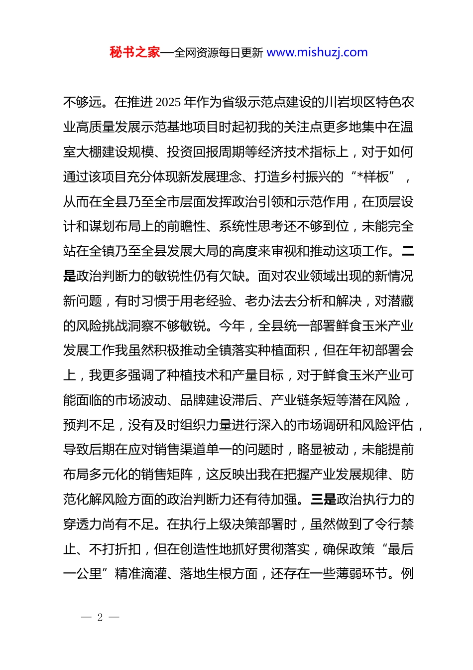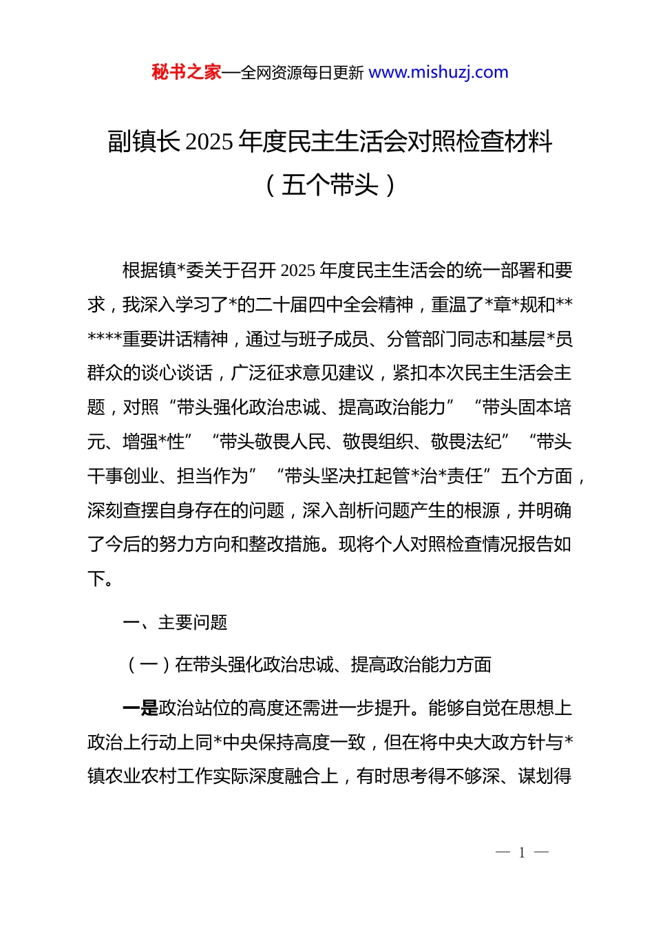 秘书之家—全网资源每日更新 www.mishuzj.com副镇长 2025 年度民主生活会对照检查材料(五个带头)根据镇*委关于召开 2025 年度民主生活会的统一部署和要求,我深入学习了*的二十届四中全会精神,重温了*章*规和******重要讲话精神,通过与班子成员、分管部门同志和基层*员群众的谈心谈话,广泛征求意见建议,紧扣本次民主生活会主题,对照“带头强化政治忠诚、提高政治能力”“带头固本培元、增强*性”“带头敬畏人民、敬畏组织、敬畏法纪”“带头干事创业、担当作为”“带头坚决扛起管*治*责任”五个方面,深刻查摆自身存在的问题,深入剖析问题产生的根源,并明确了今后的努力方向和整改措施。现将个人对照检查情况报告如下。一、主要问题(一)在带头强化政治忠诚、提高政治能力方面一是政治站位的高度还需进一步提升。能够自觉在思想上政治上行动上同*中央保持高度一致,但在将中央大政方针与*镇农业农村工作实际深度融合上,有时思考得不够深、谋划得— 1 —秘书之家—全网资源每日更新 www.mishuzj.com不够远。在推进 2025 年作为省级示范点建设的川岩坝区特色农业高质量发展示范基地项目时起初我的关注点更多地集中在温室大棚建设规模、投资回报周期等经济技术指标上,对于如何通过该项目充分体现新发展理念、打造乡村振兴的“*样板”,从而在全县乃至全市层面发挥政治引领和示范作用,在顶层设计和谋划布局上的前瞻性、系统性思考还不够到位,未能完全站在全镇乃至全县发展大局的高度来审视和推动这项工作。二是政治判断力的敏锐性仍有欠缺。面对农业领域出现的新情况新问题,有时习惯于用老经验、老办法去分析和解决,对潜藏的风险挑战洞察不够敏锐。今年,全县统一部署鲜食玉米产业发展工作我虽然积极推动全镇落实种植面积,但在年初部署会上,我更多强调了种植技术和产量目标,对于鲜食玉米产业可能面临的市场波动、品牌建设滞后、产业链条短等潜在风险,预判不足,没有及时组织力量进行深入的市场调研和风险评估,导致后期在应对销售渠道单一的问题时,略显被动,未能提前布局多元化的销售矩阵,这反映出我在把握产业发展规律、防范化解风险方面的政治判断力还有待加强。三是政治执行力的穿透力尚有不足。在执行上级决策部署时,虽然做到了令行禁止、不打折扣,但在创造性地抓好贯彻落实,确保政策“最后一公里”精准滴灌、落地生根方面,还存在一些薄弱环节。例— 2 —秘书之家—全网资源每日更新 www.mishuzj.com如,在落实粮食安全责任制,推进高标准农田建设过程中,我主要通过会议部署、文件传达和现场督导的方式推进,但在如何有效调动村集体和广大农户的积极性、主动性,解决建设过程中遇到的土地协调、后期管护等具体难题上,办法不多、创新不够。有时满足于项目按期开工、按时完工,对于政策执行后群众的真实感受、实际效益的评估反馈机制不够健全,导致政策的综合效能未能得到最优化发挥。(二)在带头固本培元、增强*性方面一是理论学习的系统性和深入性不够。作为分管农业的副镇长,在日常工作中,下田间、跑项目、处理具体事务占据了大量时间和精力,虽然能够坚持参加*委中心组学习和支部“三会一课”,但静下心来读原著、学原文、悟原理的时间被严重挤占。对于*的二十大及二十届四中全会提出的关于农业农村现代化、建设农业强国等一系列新思想、新论断,学习理解多停留在“知其然”的层面,对其丰富内涵和实践要求的“所以然”钻研不深、领悟不透。这种“碎片化”的学习方式,导致理论素养的提升跟不上事业发展的需要,运用*的创新理论指导实践、破解难题的能力有待进一步提高。二是理想信念的锤炼和巩固有所弱化。在长期和平的执政环境下,面对繁杂的日常— 3 —秘书之家—全网资源每日更新 www.mishuzj.com工作,有时不自觉地产生了“船到码头车到站”的松懈思想,认为自己受*教育多年,理想信念是坚定的,从而放松了对*性的持续改造和锤炼。在工作中,表现为用事务性工作的繁忙代替了*性锻炼的自觉。例如,在推进“万头肉牛”产业工程时,我将主要精力放在了牛舍选址、品种引进、饲料保障等具体环节,但在如何发挥*员养殖大户的先锋...