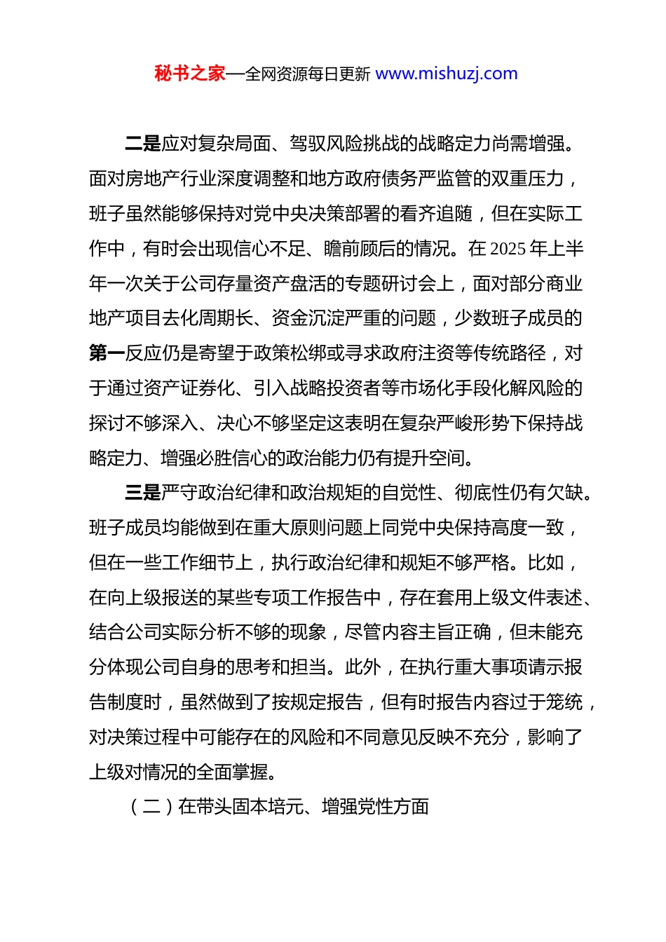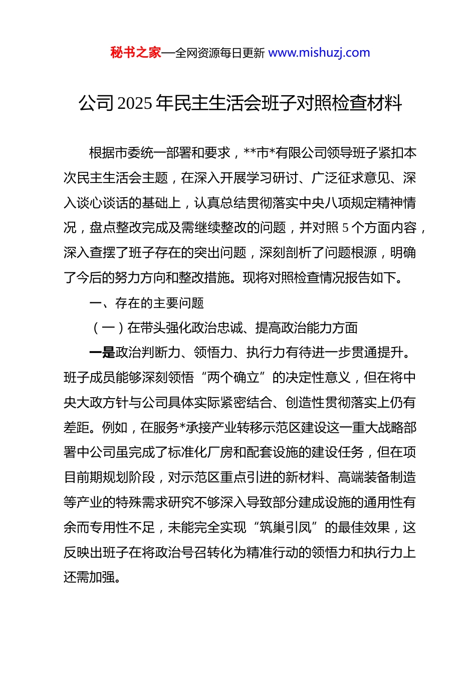 秘书之家—全网资源每日更新 www.mishuzj.com公司 2025 年民主生活会班子对照检查材料 根据市委统一部署和要求,**市*有限公司领导班子紧扣本次民主生活会主题,在深入开展学习研讨、广泛征求意见、深入谈心谈话的基础上,认真总结贯彻落实中央八项规定精神情况,盘点整改完成及需继续整改的问题,并对照 5 个方面内容,深入查摆了班子存在的突出问题,深刻剖析了问题根源,明确了今后的努力方向和整改措施。现将对照检查情况报告如下。一、存在的主要问题(一)在带头强化政治忠诚、提高政治能力方面一是政治判断力、领悟力、执行力有待进一步贯通提升。班子成员能够深刻领悟“两个确立”的决定性意义,但在将中央大政方针与公司具体实际紧密结合、创造性贯彻落实上仍有差距。例如,在服务*承接产业转移示范区建设这一重大战略部署中公司虽完成了标准化厂房和配套设施的建设任务,但在项目前期规划阶段,对示范区重点引进的新材料、高端装备制造等产业的特殊需求研究不够深入导致部分建成设施的通用性有余而专用性不足,未能完全实现“筑巢引凤”的最佳效果,这反映出班子在将政治号召转化为精准行动的领悟力和执行力上还需加强。秘书之家—全网资源每日更新 www.mishuzj.com二是应对复杂局面、驾驭风险挑战的战略定力尚需增强。面对房地产行业深度调整和地方政府债务严监管的双重压力,班子虽然能够保持对党中央决策部署的看齐追随,但在实际工作中,有时会出现信心不足、瞻前顾后的情况。在 2025 年上半年一次关于公司存量资产盘活的专题研讨会上,面对部分商业地产项目去化周期长、资金沉淀严重的问题,少数班子成员的第一反应仍是寄望于政策松绑或寻求政府注资等传统路径,对于通过资产证券化、引入战略投资者等市场化手段化解风险的探讨不够深入、决心不够坚定这表明在复杂严峻形势下保持战略定力、增强必胜信心的政治能力仍有提升空间。三是严守政治纪律和政治规矩的自觉性、彻底性仍有欠缺。班子成员均能做到在重大原则问题上同党中央保持高度一致,但在一些工作细节上,执行政治纪律和规矩不够严格。比如,在向上级报送的某些专项工作报告中,存在套用上级文件表述、结合公司实际分析不够的现象,尽管内容主旨正确,但未能充分体现公司自身的思考和担当。此外,在执行重大事项请示报告制度时,虽然做到了按规定报告,但有时报告内容过于笼统,对决策过程中可能存在的风险和不同意见反映不充分,影响了上级对情况的全面掌握。(二)在带头固本培元、增强党性方面秘书之家—全网资源每日更新 www.mishuzj.com一是运用习近平新时代中国特色社会主义思想指导实践、破解难题的能力不足。班子坚持把理论学习作为首要任务,但有时存在学用脱节、“两张皮”现象。例如,在学习贯彻新发展理念的过程中,班子成员都能在会上阐述其核心要义,但在推动公司数字化转型这一具体工作上,思想深处仍有畏难情绪。原定于 2025 年第二季度启动的“智慧工地”管理系统试点项目,因部分班子成员担忧初期投入成本高、短期效益不明显,且项目管理人员对新技术掌握需要过程,导致项目论证时间一再延长,未能如期立项实施,这说明在运用党的创新理论解决世界观、人生观、价值观“总开关”问题,进而指导公司攻坚克难的实践上还不到位。二是对标党章党规党纪、从严修身律己的标准不够高。班子成员能够自觉遵守党章党规,但在对标检视、自我净化方面,有时标准不高、要求不严。在会前征求意见和谈心谈话中有同志反映,班子成员之间的批评与自我批评有时还存在“辣味”不足、避重就轻的现象,多是谈工作建议,少有触及思想根源的交锋。这反映出运用党性原则正心明道、修身律己的自觉性还有待提高,距离“吾日三省吾身”的境界尚有差距。三是坚守共产党人精神追求、厚植为民情怀的根基不够牢固。班子成员始终牢记为人民服务的宗旨,但在情感认同和行秘书之家—全网资源每日更新 www.mishuzj.com动自觉上,与群众的期盼相比仍有距离。例如,在推进老旧小区改造配套停车场建设项目时,虽然解决了部分居民的停车难问题,但在项目规划公示阶段,对低层住户关于采光和噪音的担忧未能给予足够重...