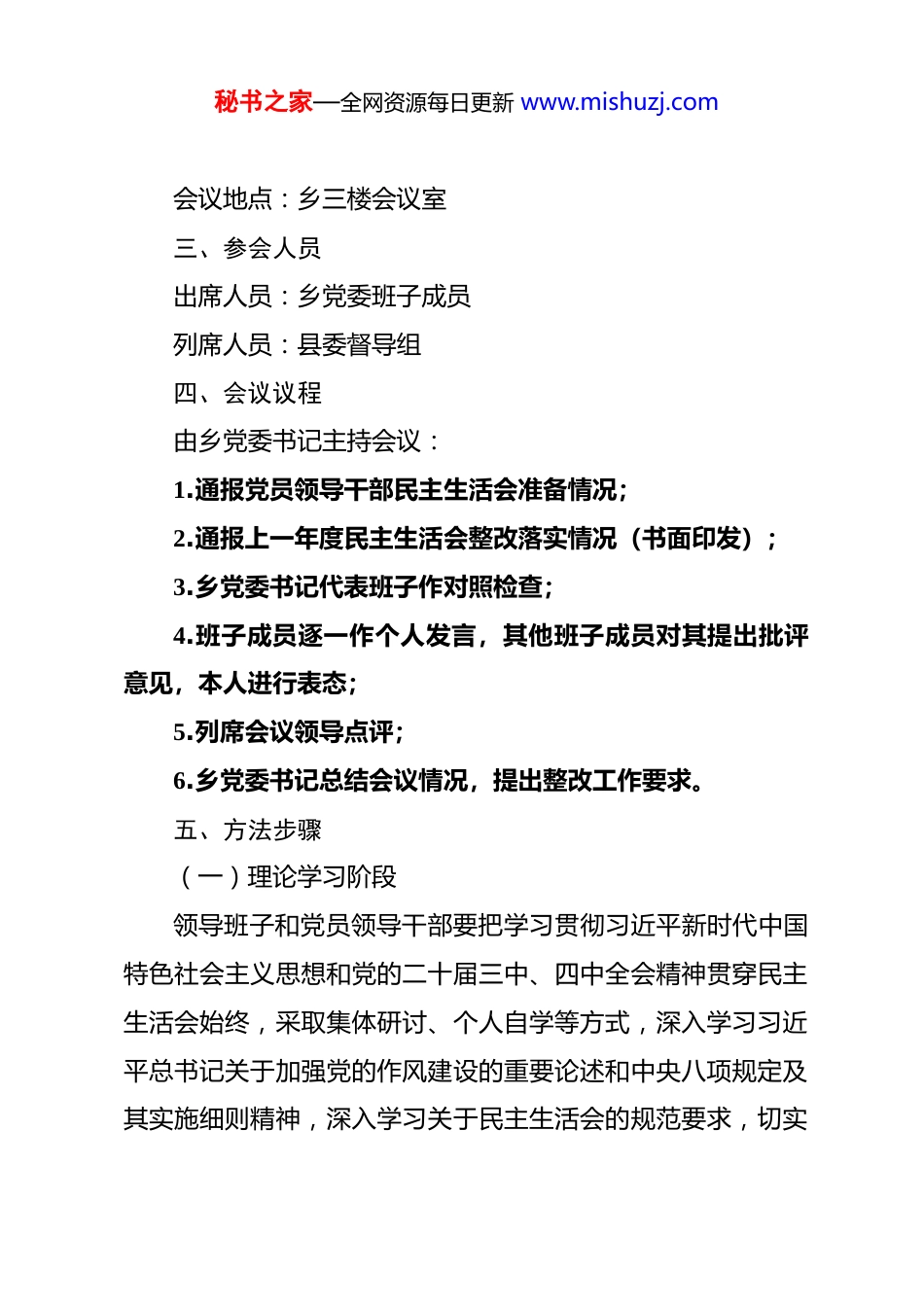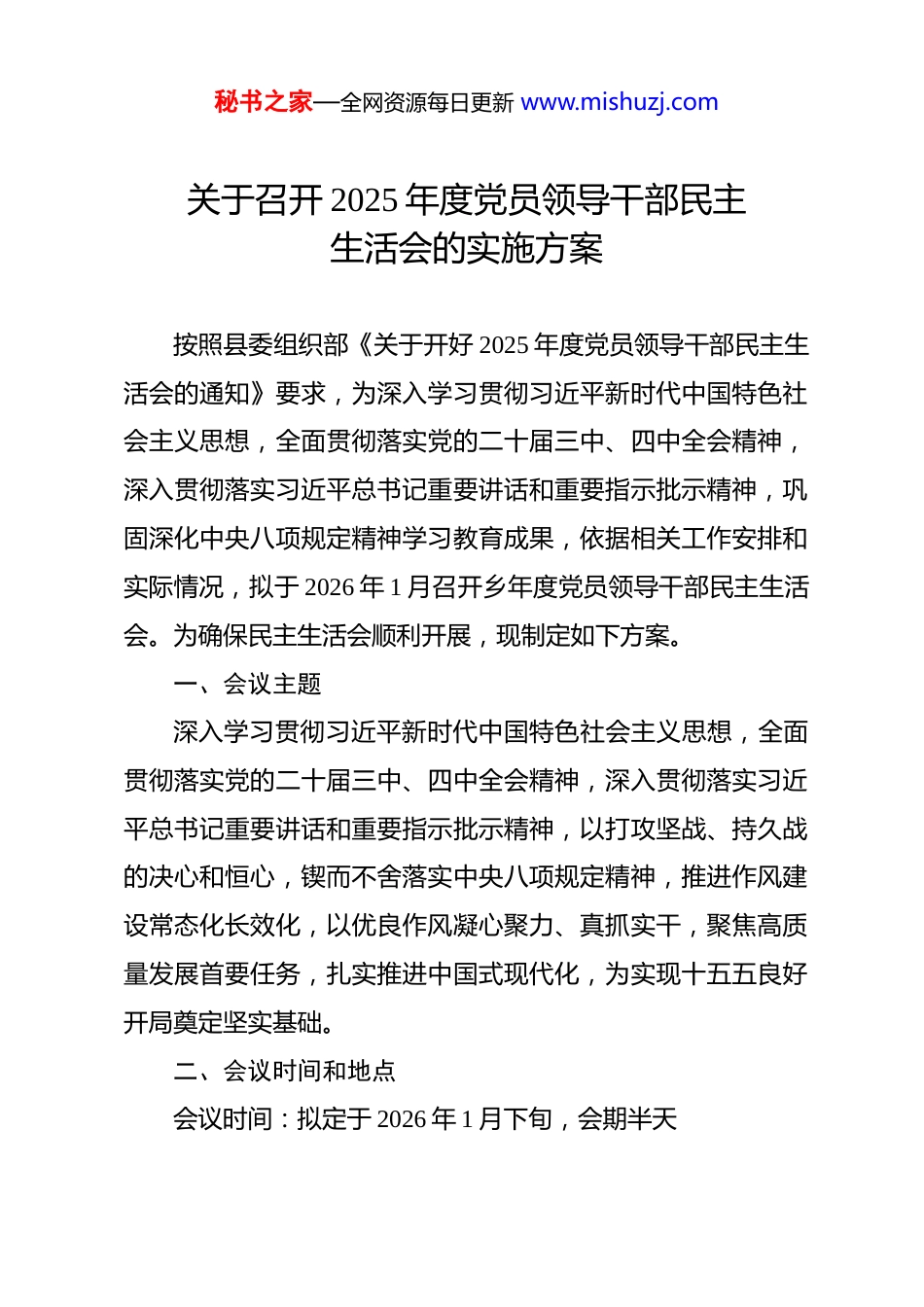 秘书之家—全网资源每日更新 www.mishuzj.com关于召开 2025 年度党员领导干部民主生活会的实施方案 按照县委组织部《关于开好 2025 年度党员领导干部民主生活会的通知》要求,为深入学习贯彻习近平新时代中国特色社会主义思想,全面贯彻落实党的二十届三中、四中全会精神,深入贯彻落实习近平总书记重要讲话和重要指示批示精神,巩固深化中央八项规定精神学习教育成果,依据相关工作安排和实际情况,拟于 2026 年 1 月召开乡年度党员领导干部民主生活会。为确保民主生活会顺利开展,现制定如下方案。一、会议主题深入学习贯彻习近平新时代中国特色社会主义思想,全面贯彻落实党的二十届三中、四中全会精神,深入贯彻落实习近平总书记重要讲话和重要指示批示精神,以打攻坚战、持久战的决心和恒心,锲而不舍落实中央八项规定精神,推进作风建设常态化长效化,以优良作风凝心聚力、真抓实干,聚焦高质量发展首要任务,扎实推进中国式现代化,为实现十五五良好开局奠定坚实基础。二、会议时间和地点会议时间:拟定于 2026 年 1 月下旬,会期半天秘书之家—全网资源每日更新 www.mishuzj.com会议地点:乡三楼会议室三、参会人员出席人员:乡党委班子成员列席人员:县委督导组四、会议议程由乡党委书记主持会议:1.通报党员领导干部民主生活会准备情况;2.通报上一年度民主生活会整改落实情况(书面印发);3.乡党委书记代表班子作对照检查;4.班子成员逐一作个人发言,其他班子成员对其提出批评意见,本人进行表态;5.列席会议领导点评;6.乡党委书记总结会议情况,提出整改工作要求。五、方法步骤(一)理论学习阶段领导班子和党员领导干部要把学习贯彻习近平新时代中国特色社会主义思想和党的二十届三中、四中全会精神贯穿民主生活会始终,采取集体研讨、个人自学等方式,深入学习习近平总书记关于加强党的作风建设的重要论述和中央八项规定及其实施细则精神,深入学习关于民主生活会的规范要求,切实秘书之家—全网资源每日更新 www.mishuzj.com把思想和行动统一到党中央精神上来,打牢开好民主生活会的思想基础。(二)认真查摆突出问题领导班子和党员领导干部要认真总结贯彻落实中央八项规定精神情况,盘点哪些问题已经整改完成、哪些问题需要继续整改。在此基础上,紧扣民主生活会主题,围绕绷紧自我革命这根弦,进一步把自己摆进去、把职责摆进去、把工作摆进去,以严的标准、严的要求检身正己,特别要突出检视作风建设问题,重点从以下 5 个方面深挖问题症结、找准思想根源,做到见人见事见思想。一是带头强化政治忠诚、提高政治能力。深刻领悟两个确立的决定性意义,增强四个意识、坚定四个自信、做到两个维护,严守党的政治纪律和政治规矩,坚定政治方向、坚守政治立场、履行政治责任,始终同以习近平同志为核心的党中央保持高度一致。保持战略定力,增强必胜信心,坚定不移贯彻落实党中央大政方针、决策部署及上级党委工作要求。二是带头固本培元、增强党性。坚持把政治修养摆在党性修养的首位,自觉以习近平新时代中国特色社会主义思想凝心铸魂,坚守共产党人精神追求,解决好世界观、人生观、价值观总开关问题。认真学习党章党规党纪,始终用党性原则正心秘书之家—全网资源每日更新 www.mishuzj.com明道、修身律己,坚定理想信念、铸牢对党忠诚、厚植为民情怀、纯正道德品质、保持清正廉洁。三是带头敬畏人民、敬畏组织、敬畏法纪。走好新时代党的群众路线,落实四下基层制度,加大保障和改善民生力度,解决好人民群众急难愁盼问题,密切党群干群关系。严格贯彻执行民主集中制,严格执行领导班子议事决策规则,防止独断专行、搞一言堂。自觉筑牢拒腐防变的思想堤坝,规范权力运行,防止特权思想、特权现象,防止随意用权、任性用权。四是带头干事创业、担当作为。树立和践行正确政绩观,完整准确全面贯彻新发展理念,坚持干字当头,积极识变应变求变,正确把握形势,增强忧患意识,坚持底线思维,用好发展机遇、潜力和优势,敢于斗争、善于斗争,以历史主动精神克难关、战风险、迎挑战,在维护政治安全和社会稳定、推动高质量发展、加强基层治理、完...