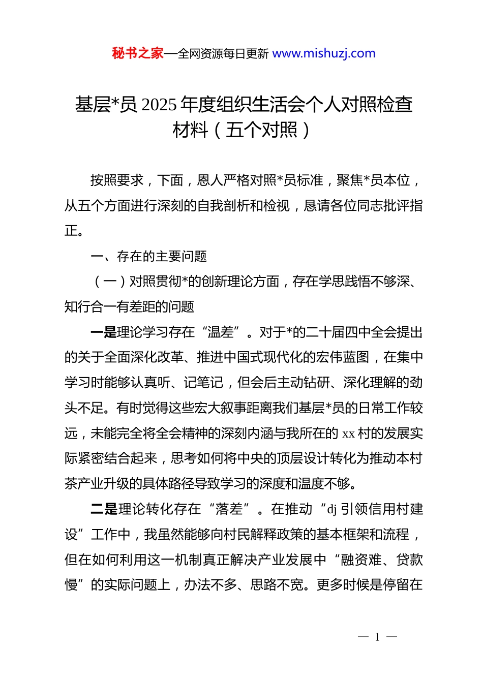 秘书之家—全网资源每日更新 www.mishuzj.com基层*员 2025 年度组织生活会个人对照检查材料(五个对照)按照要求,下面,恩人严格对照*员标准,聚焦*员本位,从五个方面进行深刻的自我剖析和检视,恳请各位同志批评指正。一、存在的主要问题(一)对照贯彻*的创新理论方面,存在学思践悟不够深、知行合一有差距的问题一是理论学习存在“温差”。对于*的二十届四中全会提出的关于全面深化改革、推进中国式现代化的宏伟蓝图,在集中学习时能够认真听、记笔记,但会后主动钻研、深化理解的劲头不足。有时觉得这些宏大叙事距离我们基层*员的日常工作较远,未能完全将全会精神的深刻内涵与我所在的 xx 村的发展实际紧密结合起来,思考如何将中央的顶层设计转化为推动本村茶产业升级的具体路径导致学习的深度和温度不够。二是理论转化存在“落差”。在推动“dj 引领信用村建设”工作中,我虽然能够向村民解释政策的基本框架和流程,但在如何利用这一机制真正解决产业发展中“融资难、贷款慢”的实际问题上,办法不多、思路不宽。更多时候是停留在— 1 —秘书之家—全网资源每日更新 www.mishuzj.com完成上级布置的任务层面,对于如何将*的创新理论转化为服务群众、破解难题的“金钥匙”,思考和实践得不够,存在一定的学用脱节现象。三是理论指导存在“偏差”。面对具体矛盾时,运用理论指导实践的能力不足。去年村里在推进土地流转用于扩大中药材种植基地时,有两户村民因地界划分问题产生纠纷。我在调解时,主要还是依靠“老办法”,反复做思想工作、讲邻里情面,而没有能够及时、准确地运用乡村振兴促进法、农村土地承包法等政策法规和“枫桥经验”所蕴含的法治思维,从根本上为他们厘清权责,导致调解过程一波三折,效率不高。(二)对照加强*性锤炼方面,存在自我要求不够严、先锋作用有褪色的问题一是先锋意识有所弱化。作为一名*员,虽然能够完成组织交办的任务,但在急难险重任务面前,主动站出来、冲在最前面的意识有所减弱。例如,在 2025 年夏季乡里组织的人居环境整治集中攻坚行动中我虽然也拿起工具参与了村主干道的清扫,但对于村后山一处长期存在的建筑垃圾堆放点这一“硬骨头”,存在畏难情绪,没有主动请缨去牵头组织攻克,先锋模"范作用的“成色”略显不足。二是斗争精神有所弱化。在参加*小组会议或“三会一课”— 2 —秘书之家—全网资源每日更新 www.mishuzj.com时,开展批评与自我批评有时还不够“辣味”。对于其他同志的一些小问题,总觉得是细枝末节,抱着“与人为善”的心态,多栽花、少栽刺,点到即止,没有真正做到红脸出汗、排毒治病。对自己存在的问题,也偶尔会选择性地“轻描淡写”,怕说多了、说重了会丢面子,*内政治生活的“熔炉”作用未能充分发挥。三是奉献精神有所减退。随着年龄增长和工作趋于稳定,有时会不自觉地产生“歇歇脚”的念头。对于参与志愿服务、为群众办实事等活动,虽然也积极响应,但与一些年轻新*员相比,那股子废寝忘食、不计得失的劲头有所消减。有时会把参加主题*日活动或完成*员积分管理任务,看作是必须履行的“硬指标”,而忽略了其背后锤炼*性、服务群众的根本目的。(三)对照联系服务群众方面,存在深入基层不够勤、为民办事有欠缺的问题一是服务群众不够主动。习惯于在村委会“坐等上门”,等着群众来反映问题,而主动下沉到田间地头、农家院落了解民情的时候少了。去年乡里推广残疾人家庭无障碍改造项目全乡投入 9.8 万元惠及了 28 户家庭。我所在片区的一户残疾老人,是我在一次偶然闲聊中才得知其有改造需求,而不是通过我主动摸排发现的。这反映出我“群众利益无小事”的观念树得还— 3 —秘书之家—全网资源每日更新 www.mishuzj.com不够牢固。二是服务方式不够精细。在为群众排忧解难时,有时方法比较单一,缺乏“绣花”功夫。在参与“我为群众办实事”实践活动中,我曾帮助一位村民联系修复了门前的自来水管。但事情办完后,没有再进一步了解他家在产业发展、子女教育等方面是否还有其他困难,服务仅仅停留在了“头痛医头、脚痛医脚”的浅层,未能提供更加系统化、个性化的关怀与帮助。三是...