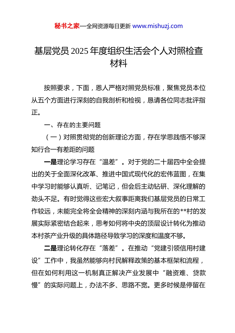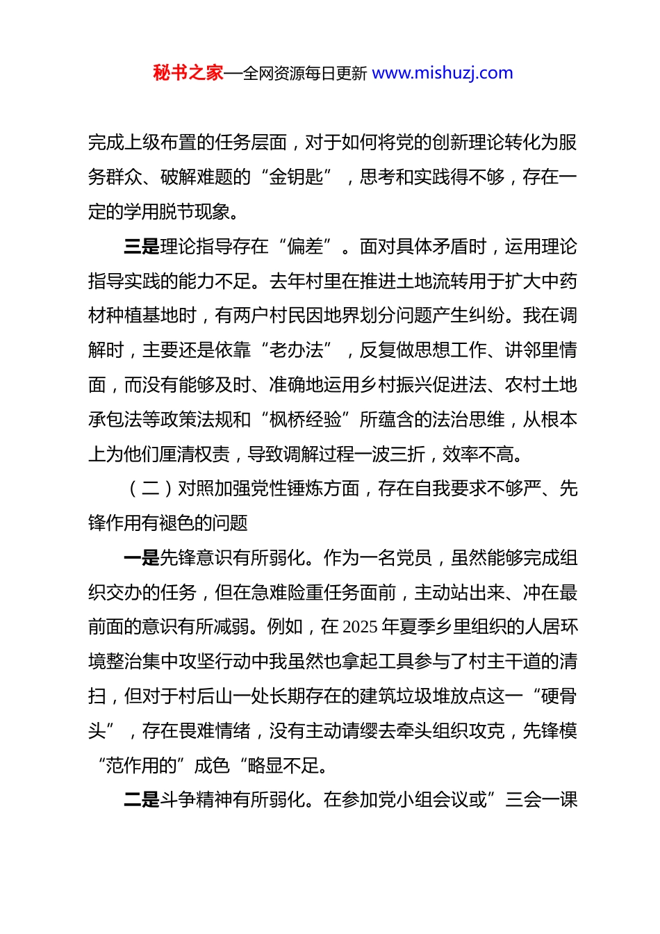 秘书之家—全网资源每日更新 www.mishuzj.com基层党员 2025 年度组织生活会个人对照检查材料 按照要求,下面,恩人严格对照党员标准,聚焦党员本位从五个方面进行深刻的自我剖析和检视,恳请各位同志批评指正。一、存在的主要问题(一)对照贯彻党的创新理论方面,存在学思践悟不够深知行合一有差距的问题一是理论学习存在“温差”。对于党的二十届四中全会提出的关于全面深化改革、推进中国式现代化的宏伟蓝图,在集中学习时能够认真听、记笔记,但会后主动钻研、深化理解的劲头不足。有时觉得这些宏大叙事距离我们基层党员的日常工作较远,未能完全将全会精神的深刻内涵与我所在的**村的发展实际紧密结合起来,思考如何将中央的顶层设计转化为推动本村茶产业升级的具体路径导致学习的深度和温度不够。二是理论转化存在“落差”。在推动“党建引领信用村建设”工作中,我虽然能够向村民解释政策的基本框架和流程,但在如何利用这一机制真正解决产业发展中“融资难、贷款慢”的实际问题上,办法不多、思路不宽。更多时候是停留在秘书之家—全网资源每日更新 www.mishuzj.com完成上级布置的任务层面,对于如何将党的创新理论转化为服务群众、破解难题的“金钥匙”,思考和实践得不够,存在一定的学用脱节现象。三是理论指导存在“偏差”。面对具体矛盾时,运用理论指导实践的能力不足。去年村里在推进土地流转用于扩大中药材种植基地时,有两户村民因地界划分问题产生纠纷。我在调解时,主要还是依靠“老办法”,反复做思想工作、讲邻里情面,而没有能够及时、准确地运用乡村振兴促进法、农村土地承包法等政策法规和“枫桥经验”所蕴含的法治思维,从根本上为他们厘清权责,导致调解过程一波三折,效率不高。(二)对照加强党性锤炼方面,存在自我要求不够严、先锋作用有褪色的问题一是先锋意识有所弱化。作为一名党员,虽然能够完成组织交办的任务,但在急难险重任务面前,主动站出来、冲在最前面的意识有所减弱。例如,在 2025 年夏季乡里组织的人居环境整治集中攻坚行动中我虽然也拿起工具参与了村主干道的清扫,但对于村后山一处长期存在的建筑垃圾堆放点这一“硬骨头”,存在畏难情绪,没有主动请缨去牵头组织攻克,先锋模“范作用的”成色“略显不足。二是斗争精神有所弱化。在参加党小组会议或”三会一课秘书之家—全网资源每日更新 www.mishuzj.com“时,开展批评与自我批评有时还不够”辣味“。对于其他同志的一些小问题,总觉得是细枝末节,抱着”与人为善“的心态,多栽花、少栽刺,点到即止,没有真正做到红脸出汗、排毒治病。对自己存在的问题,也偶尔会选择性地”轻描淡写“,怕说多了、说重了会丢面子,党内政治生活的”熔炉“作用未能充分发挥。三是奉献精神有所减退。随着年龄增长和工作趋于稳定,有时会不自觉地产生”歇歇脚“的念头。对于参与志愿服务、为群众办实事等活动,虽然也积极响应,但与一些年轻新党员相比,那股子废寝忘食、不计得失的劲头有所消减。有时会把参加主题党日活动或完成党员积分管理任务,看作是必须履行的”硬指标“,而忽略了其背后锤炼党性、服务群众的根本目的。(三)对照联系服务群众方面,存在深入基层不够勤、为民办事有欠缺的问题一是服务群众不够主动。习惯于在村委会”坐等上门“,等着群众来反映问题,而主动下沉到田间地头、农家院落了解民情的时候少了。去年乡里推广残疾人家庭无障碍改造项目全乡投入 9.8 万元惠及了 28 户家庭。我所在片区的一户残疾老人,是我在一次偶然闲聊中才得知其有改造需求,而不是通过我主秘书之家—全网资源每日更新 www.mishuzj.com动摸排发现的。这反映出我”群众利益无小事“的观念树得还不够牢固。二是服务方式不够精细。在为群众排忧解难时,有时方法比较单一,缺乏”绣花“功夫。在参与”我为群众办实事“实践活动中,我曾帮助一位村民联系修复了门前的自来水管。但事情办完后,没有再进一步了解他家在产业发展、子女教育等方面是否还有其他困难,服务仅仅停留在了”头痛医头、脚痛医脚“的浅层,未能提供更加系统化、个性化的关怀与帮助。三是服务效果不够持久。去年我曾协...