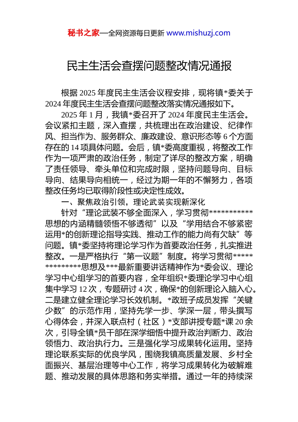 秘书之家—全网资源每日更新 www.mishuzj.com民主生活会查摆问题整改情况通报根据 2025 年度民主生活会议程安排,现将镇*委关于2024 年度民主生活会查摆问题整改落实情况通报如下。2025 年 1 月,我镇*委召开了 2024 年度民主生活会。会议紧扣主题,深入查摆,共梳理出在政治建设、纪律作风、担当作为、服务群众、廉政建设、意识形态等 6 个方面存在的 14 项具体问题。会后,镇*委高度重视,将整改工作作为一项严肃的政治任务,制定了详尽的整改方案,明确了责任领导、牵头单位和完成时限,坚持问题导向、目标导向、结果导向相统一,经过为期一年的不懈努力,各项整改任务均已取得阶段性或决定性成效。一、聚焦政治引领,理论武装实现新深化针对“理论武装不够全面深入,学习贯彻***********思想的内涵精髓领悟不够透彻”以及“学用结合不够紧密运用*的创新理论指导实践、推动工作的能力尚有欠缺”等问题。镇*委坚持将理论学习作为首要政治任务,扎实推进整改。一是严格执行“第一议题”制度。将学习贯彻**************思想及***最新重要讲话精神作为*委会议、理论学习中心组学习的首要内容,全年组织*委理论学习中心组集中学习 12 次,专题研讨 4 次,确保*的创新理论入脑入心。二是建立健全理论学习长效机制。*政班子成员发挥“关键少数”的示范作用,坚持先学一步、学深一层,带头撰写心得体会,并深入联点村(社区)*支部讲授专题*课 20 余次,引导全镇*员干部在深学细悟中提升政治判断力、政治领悟力、政治执行力。三是强化学习成果转化运用。坚持理论联系实际的优良学风,围绕我镇高质量发展、乡村全面振兴、基层治理等中心工作,将学习成果转化为破解难题、推动发展的具体思路和务实举措。通过一年的持续深秘书之家—全网资源每日更新 www.mishuzj.com化,全镇*员干部的理论素养和政治能力得到显著提升,运用科学理论应对复杂局面、解决实际问题的本领进一步增强。二、聚焦纪律建设,作风面貌呈现新气象针对“dj 学习教育常态长效机制不够健全,融入日常、抓在经常方面做得还不够到位”以及“*风廉政建设压力传导存在衰减现象,对分管领域干部监督管理不够经常”等问题。镇*委坚持严的基调不动摇,深入推进作风纪律建设。一是巩固拓展 dj 学习教育成果。将《中国共产 dj 律处分条例》的学习纳入各级*组织“三会一课”和主题*日常态化学习内容,组织开展专题培训和知识测试,覆盖全镇*员干部。二是常态化开展警示教育。充分运用违纪违法典型案例,组织*员干部观看警示教育片、参观廉政教育基地,用身边事教育身边人,引导广大*员干部知敬畏、存戒惧、守底线。三是压紧压实全面从-严治*主体责任。严格落实“一岗双责”,*委书记与班子成员、班子成员与分管部门负责人之间,层层开展廉政谈话,定期听取*风廉政建设工作汇报,将责任压力传导至基层末梢。经过整改,全镇*员干部纪律意识和规矩意识显著增强,干事创业的政治生态持续向好。三、聚焦担当作为,高质量发展取得新成效针对“稳增长促发展的本领还需进一步增强,破解发展瓶颈的思路和方法不多”以及“惠民生增福祉的力度还需进一步加大,解决群众急难愁盼问题效果不够明显”等问题。镇*委坚持发展是第一要务,全力推动整改措施与经济社会发展深度融合。一是加快构建现代化产业体系。立足我镇资源禀賦,大力发展高品质菜草畜特色农业,成功引进并培育 2 家农业龙头企业;同时,积极优化营商环境,支持本地中小微企业发展,全年新增市场主体 150 余户。二是持续扩大有效投资。抢抓政策机遇,积极谋划储备基础设施、公共服务、城市更新等领域重点项目 5 个,争取上级秘书之家—全网资源每日更新 www.mishuzj.com资金支持超过 3000 万元。三是扎实办好各项民生实事。高质量完成年初承诺的 10 件民生实事,包括完成 2 个老旧小区的更新改造,新建 1 个社区嵌入式养老服务中心,城镇新增就业岗位 500 个,重点群体就业率达到 95%以上。四是着力提升城市品质与乡村风貌。深入实施精致城市建设行动对镇区主次干道、背街小巷进行综合整治;稳步推进和美乡村建设,成功创建区级美丽宜...